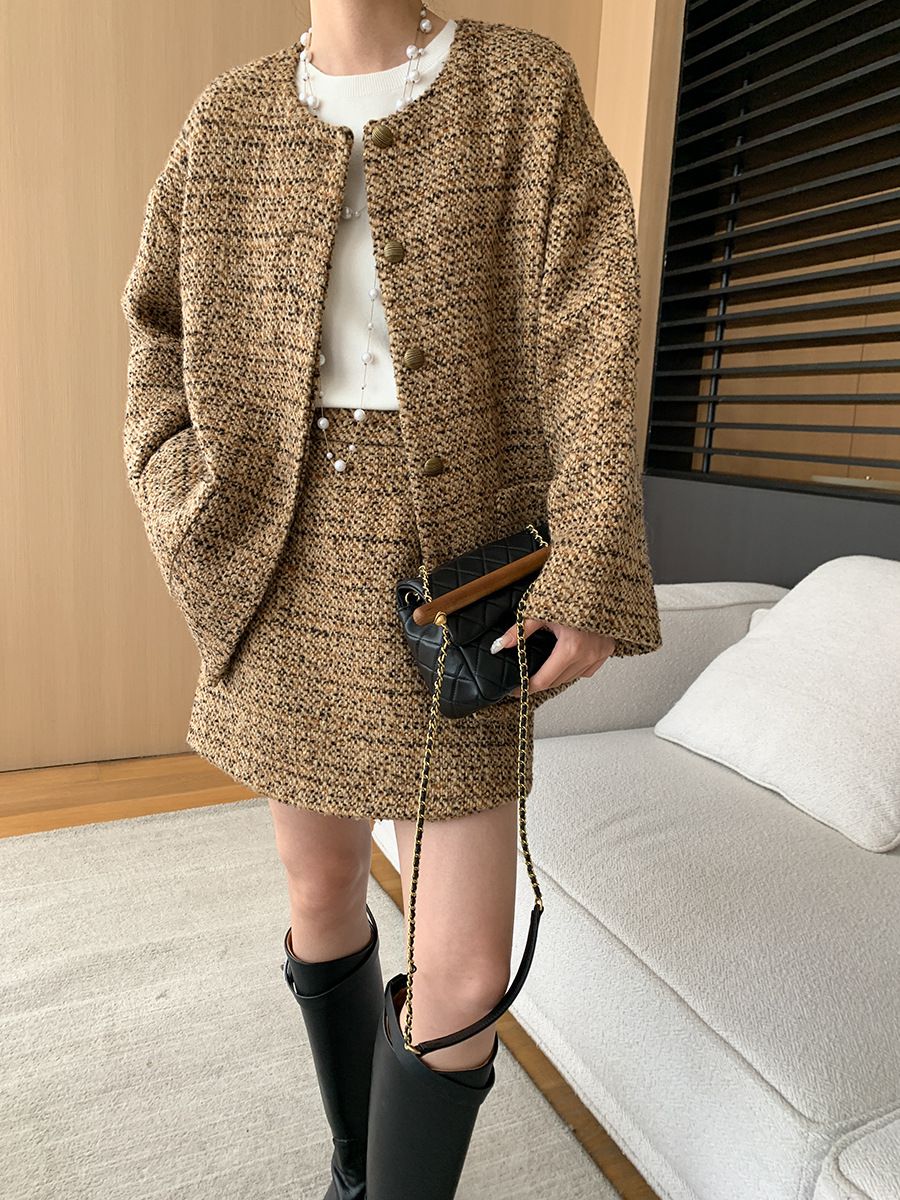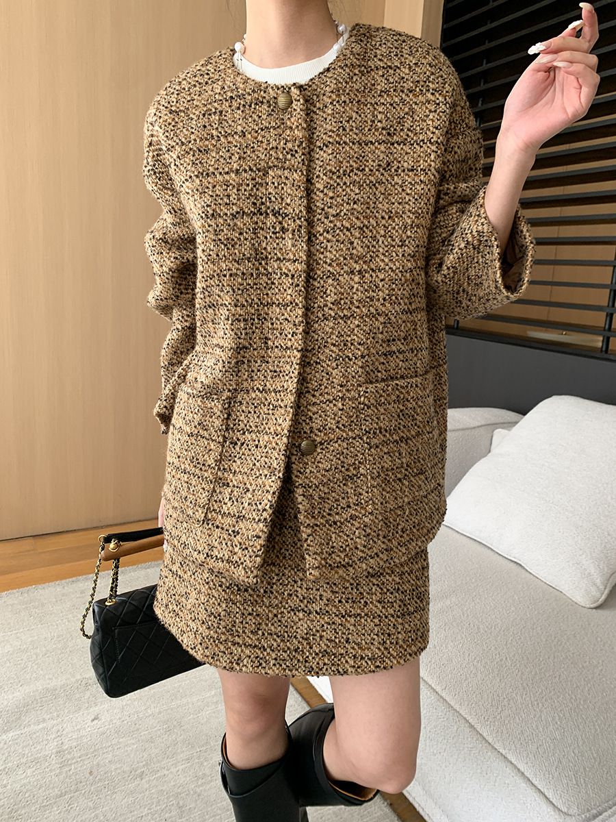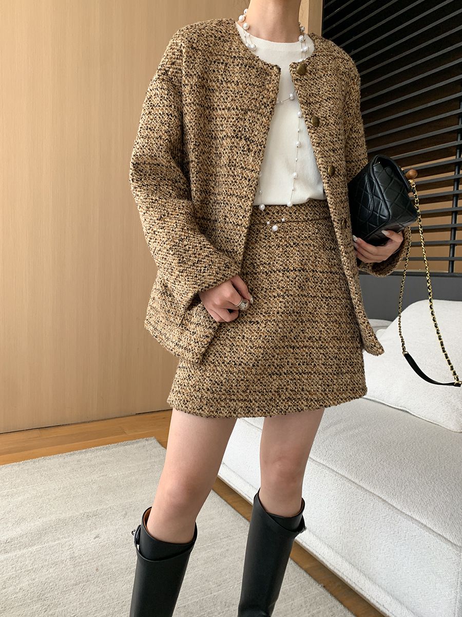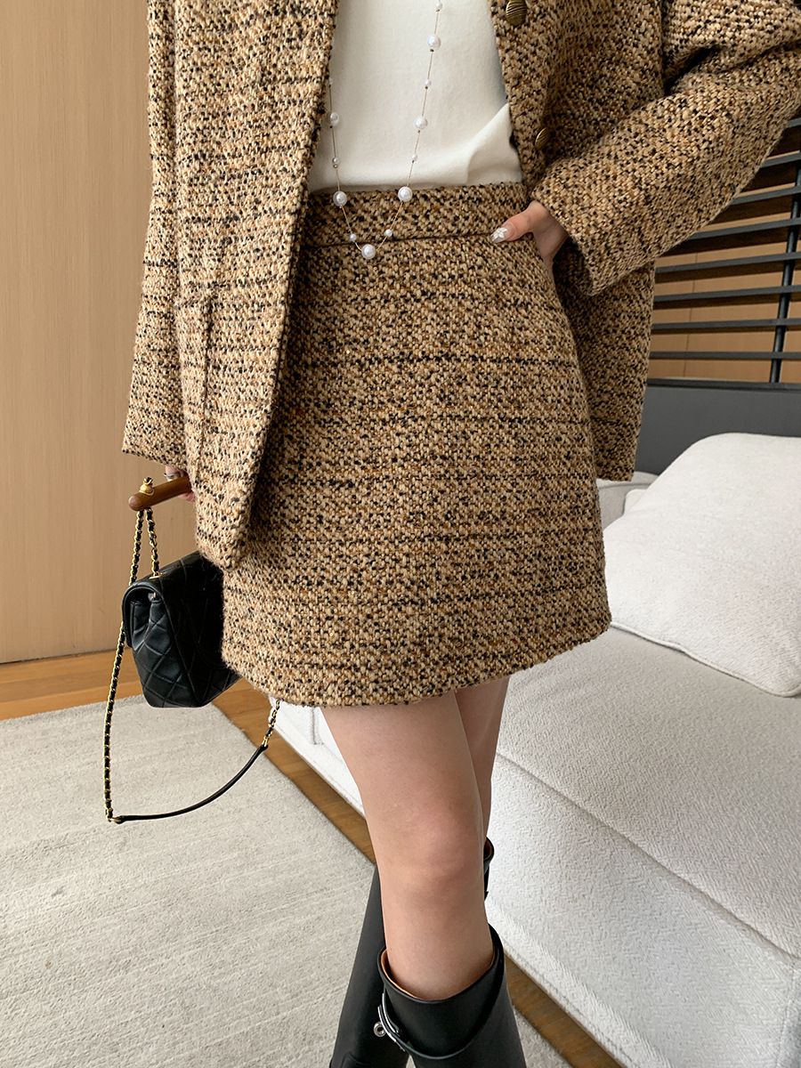 【C60045】品牌 小香風套裝-格紋毛呢長袖長版外套+拉鍊短裙子