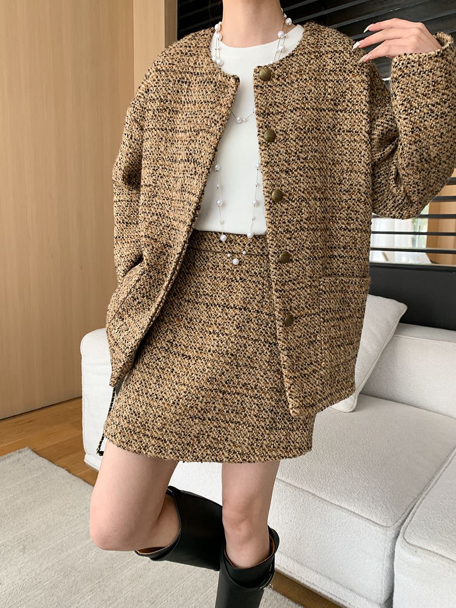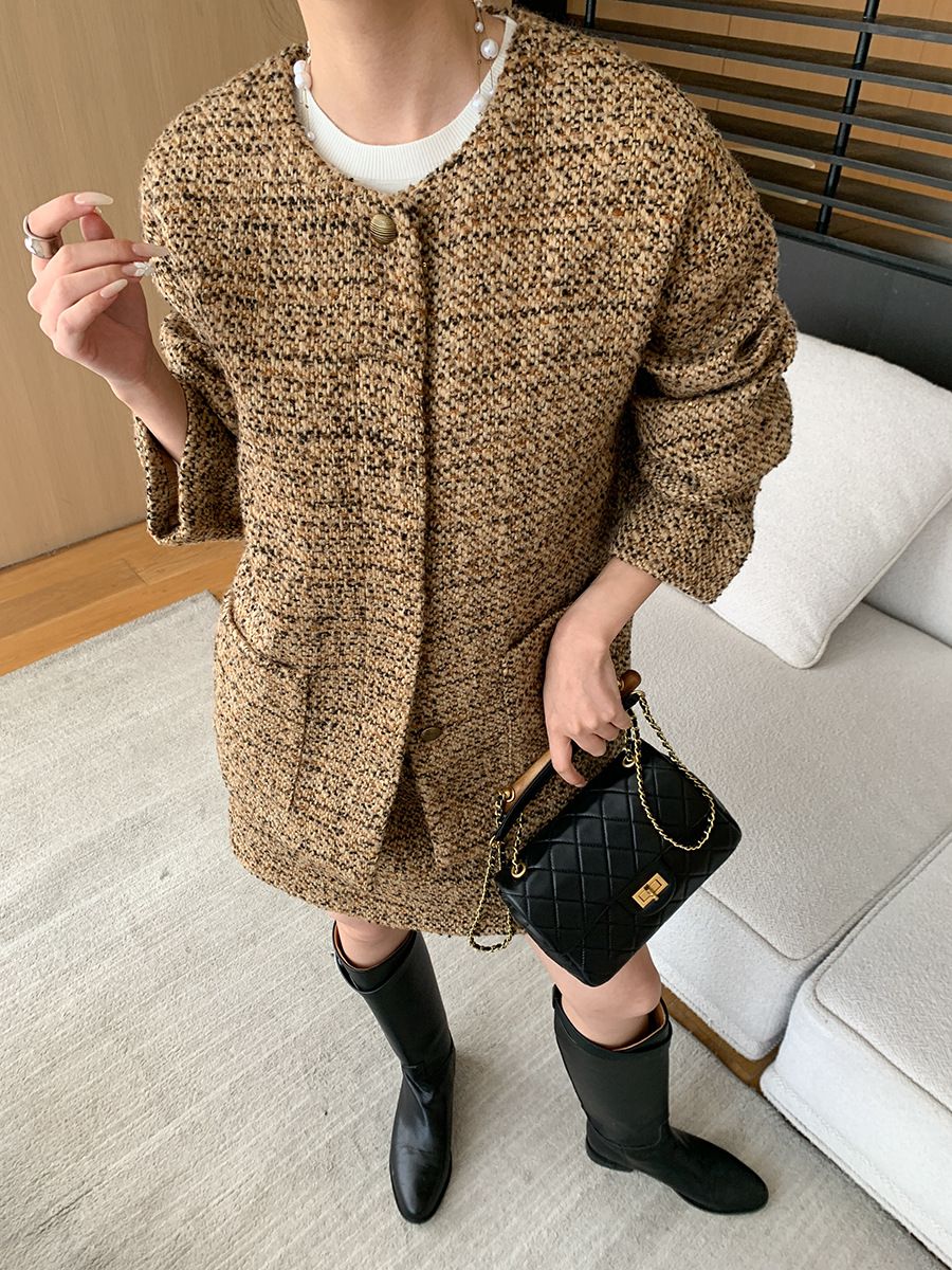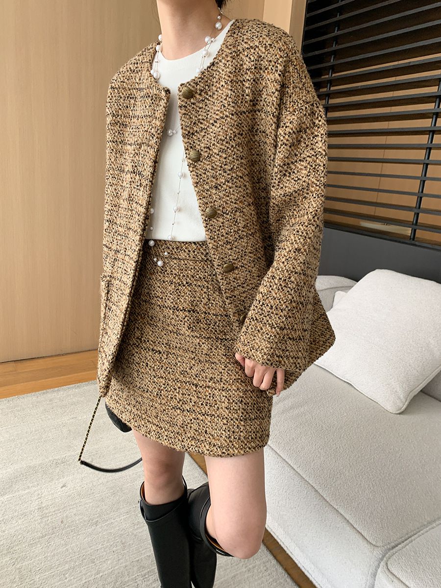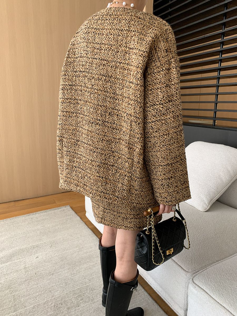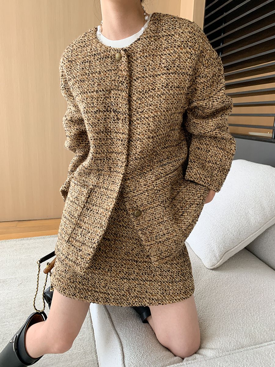 【C60045】品牌 小香風套裝-格紋毛呢長袖長版外套+拉鍊短裙子