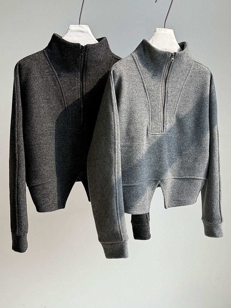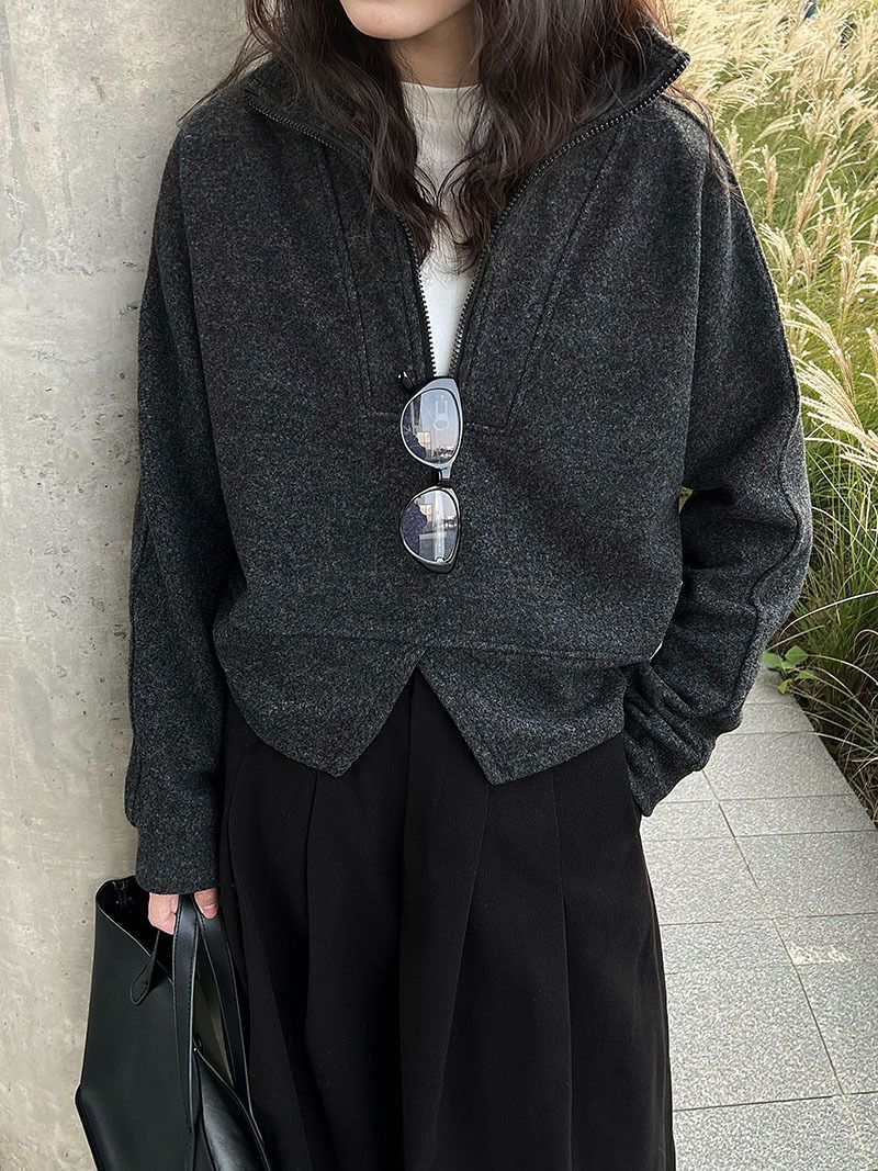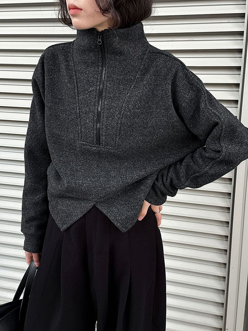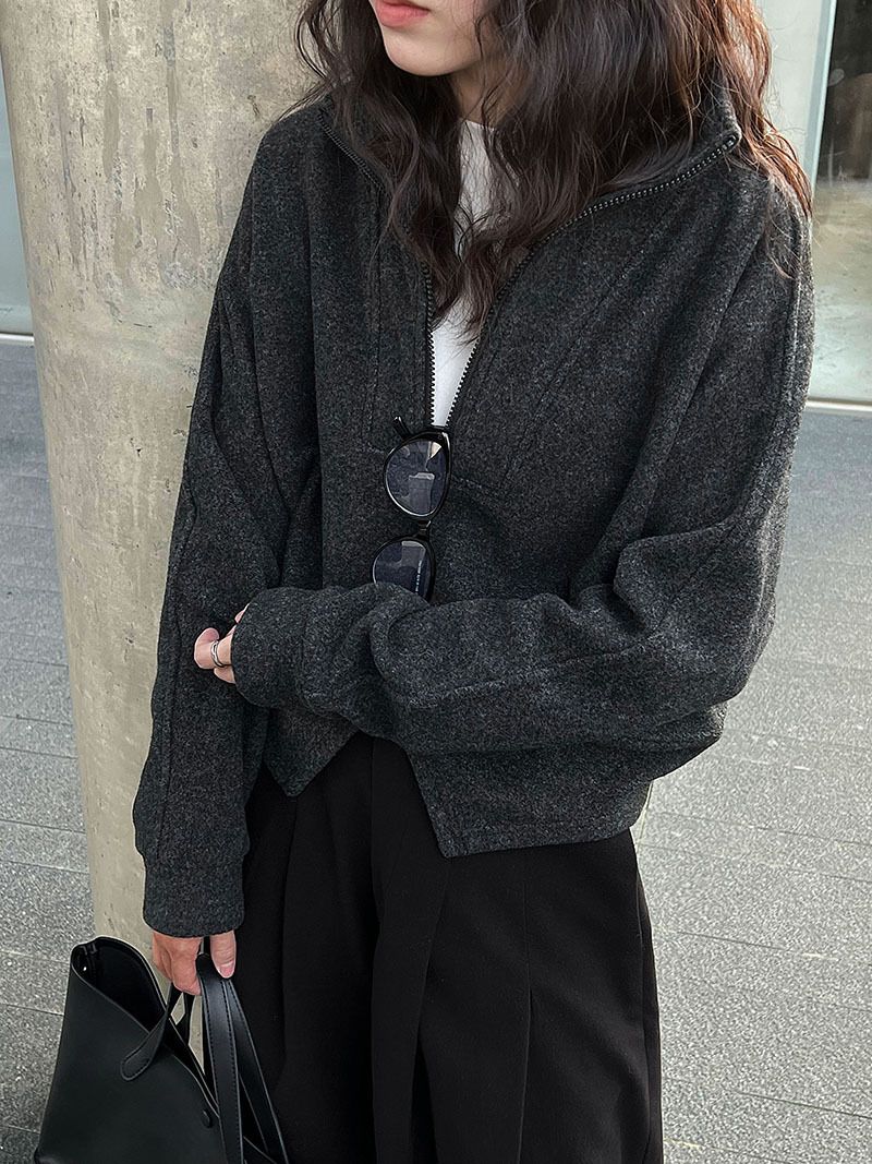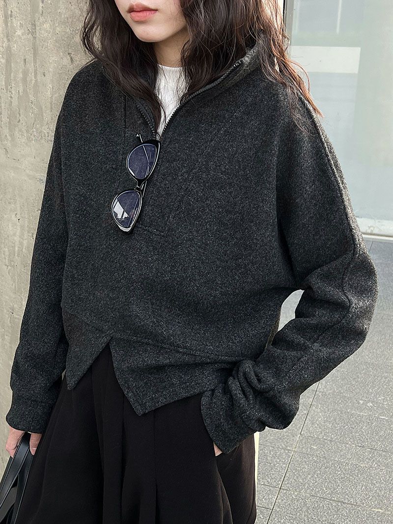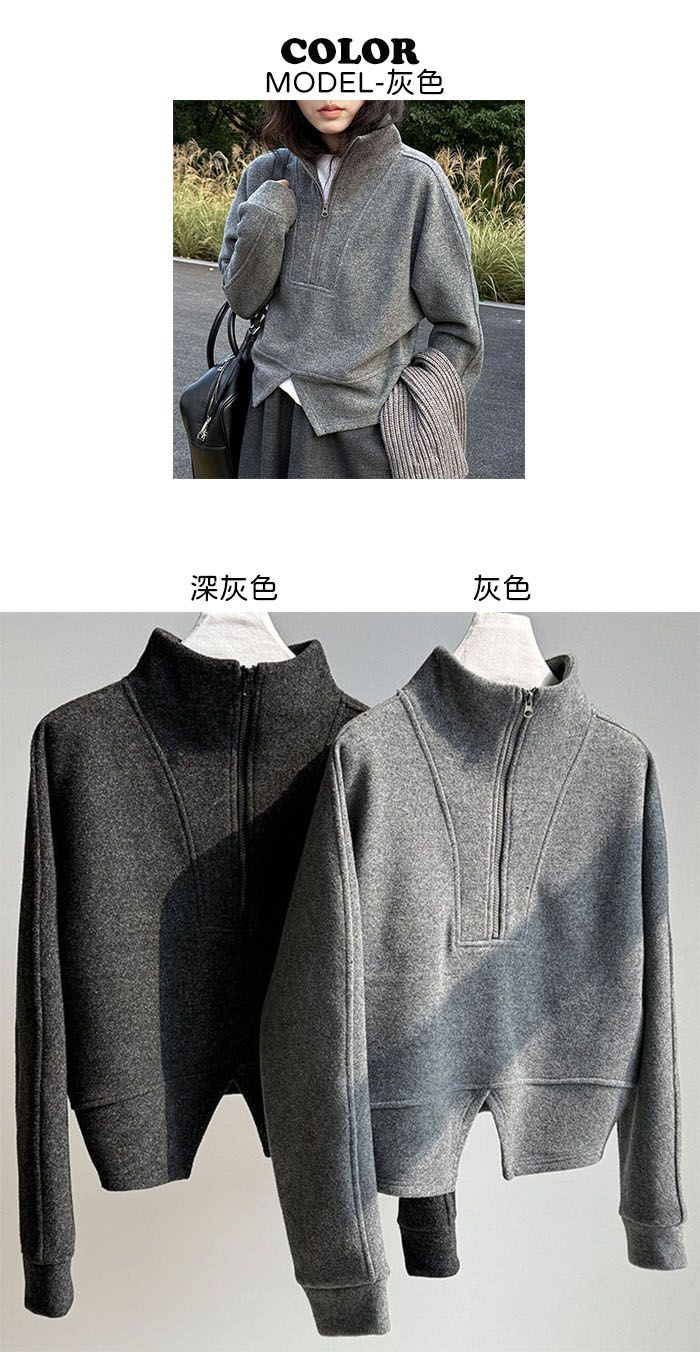 【C60052】品牌 拉鍊立領上衣-厚磅毛呢素面半開襟寬鬆開衩長袖★★