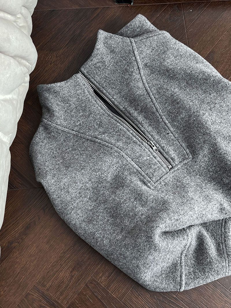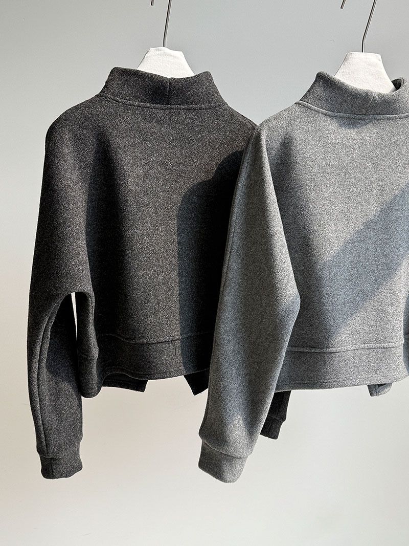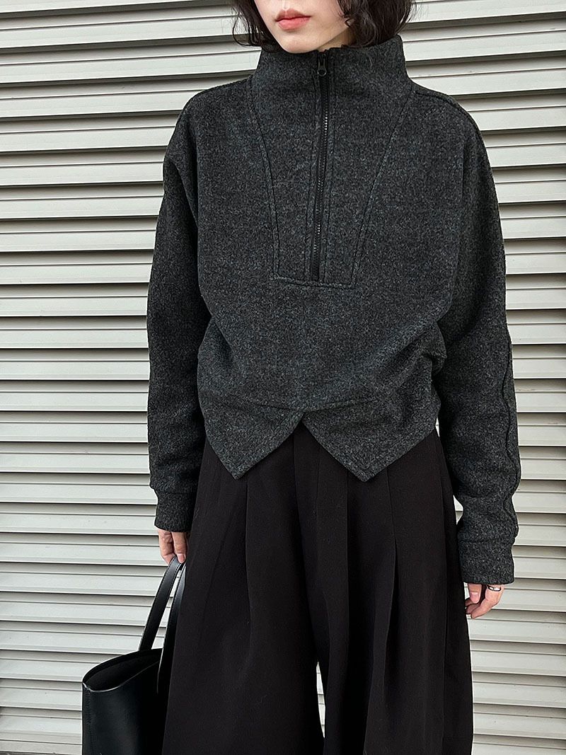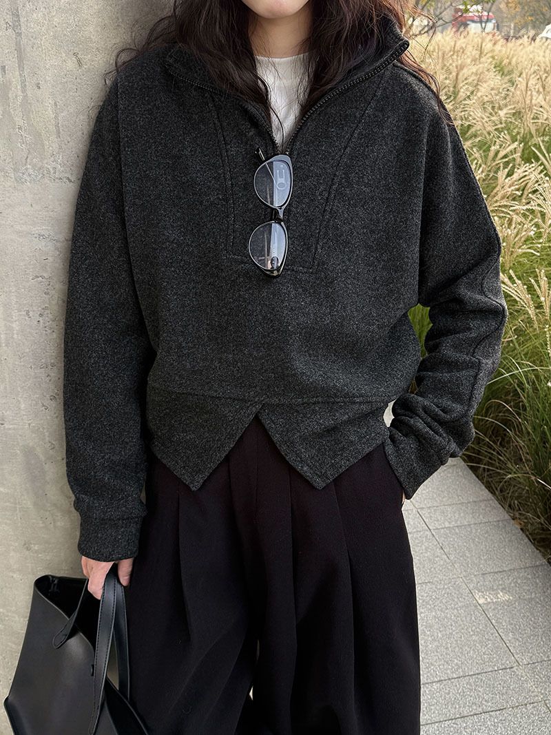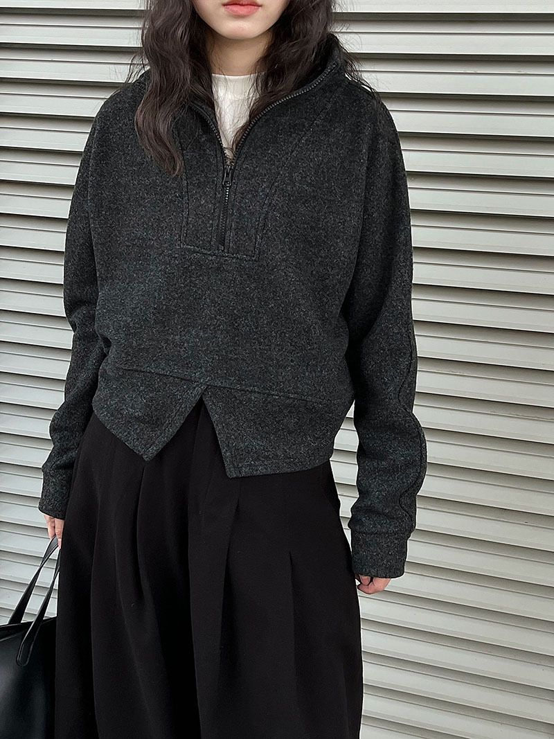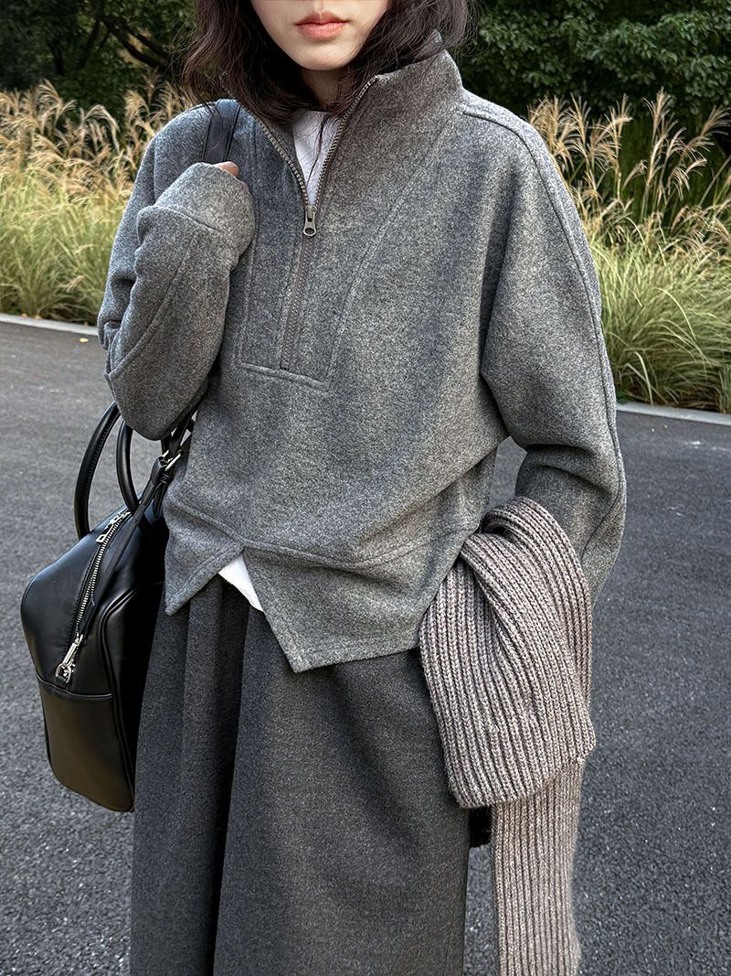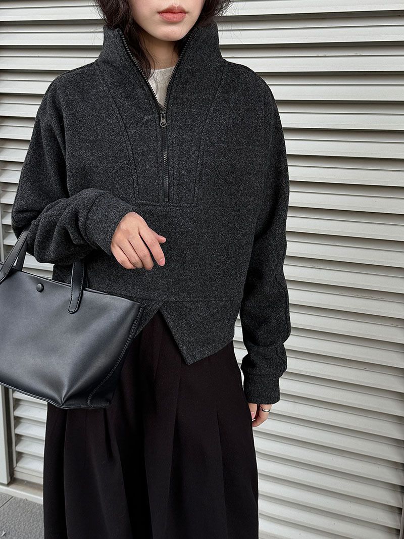 【C60052】品牌 拉鍊立領上衣-厚磅毛呢素面半開襟寬鬆開衩長袖★★