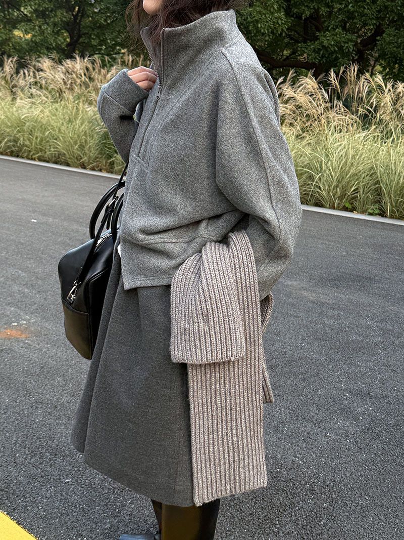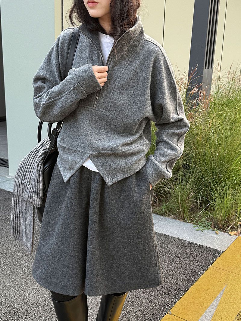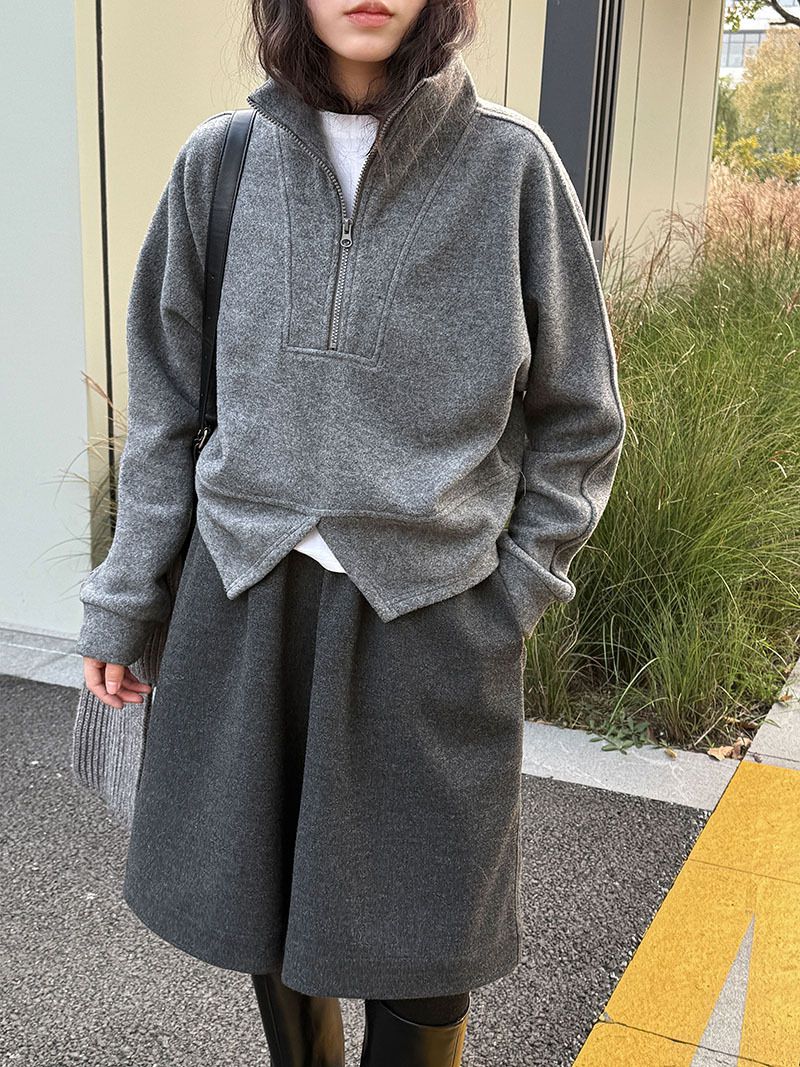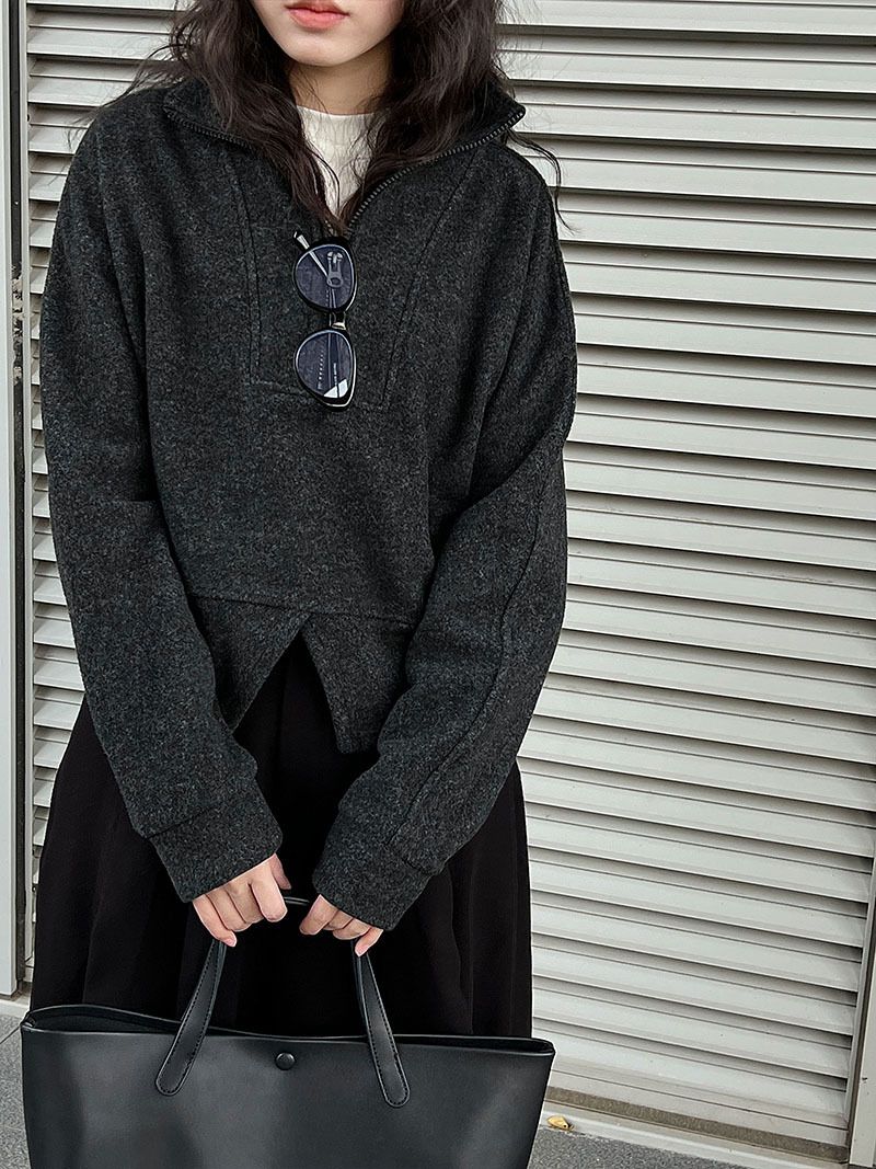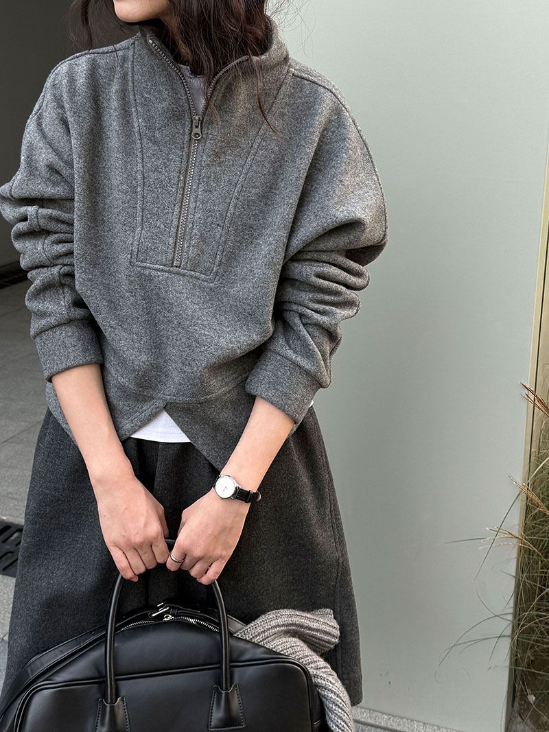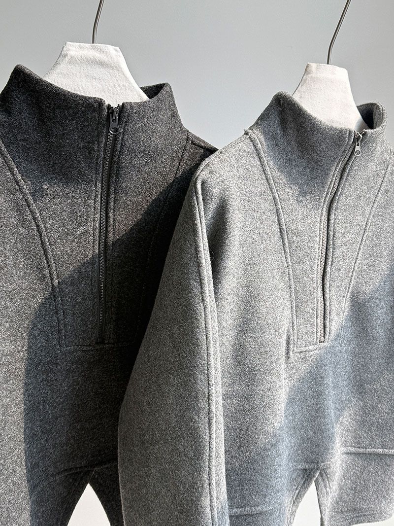 【C60052】品牌 拉鍊立領上衣-厚磅毛呢素面半開襟寬鬆開衩長袖★★