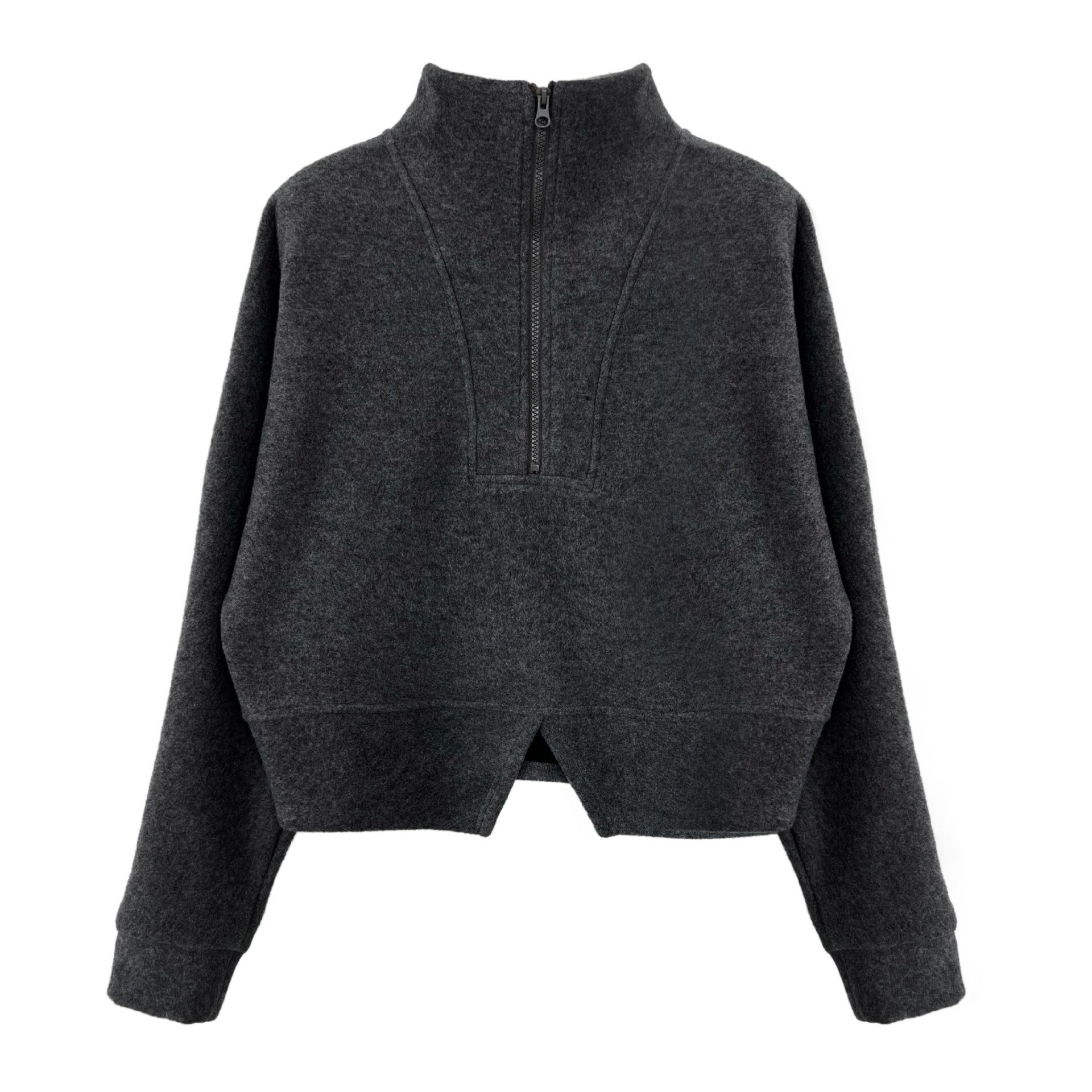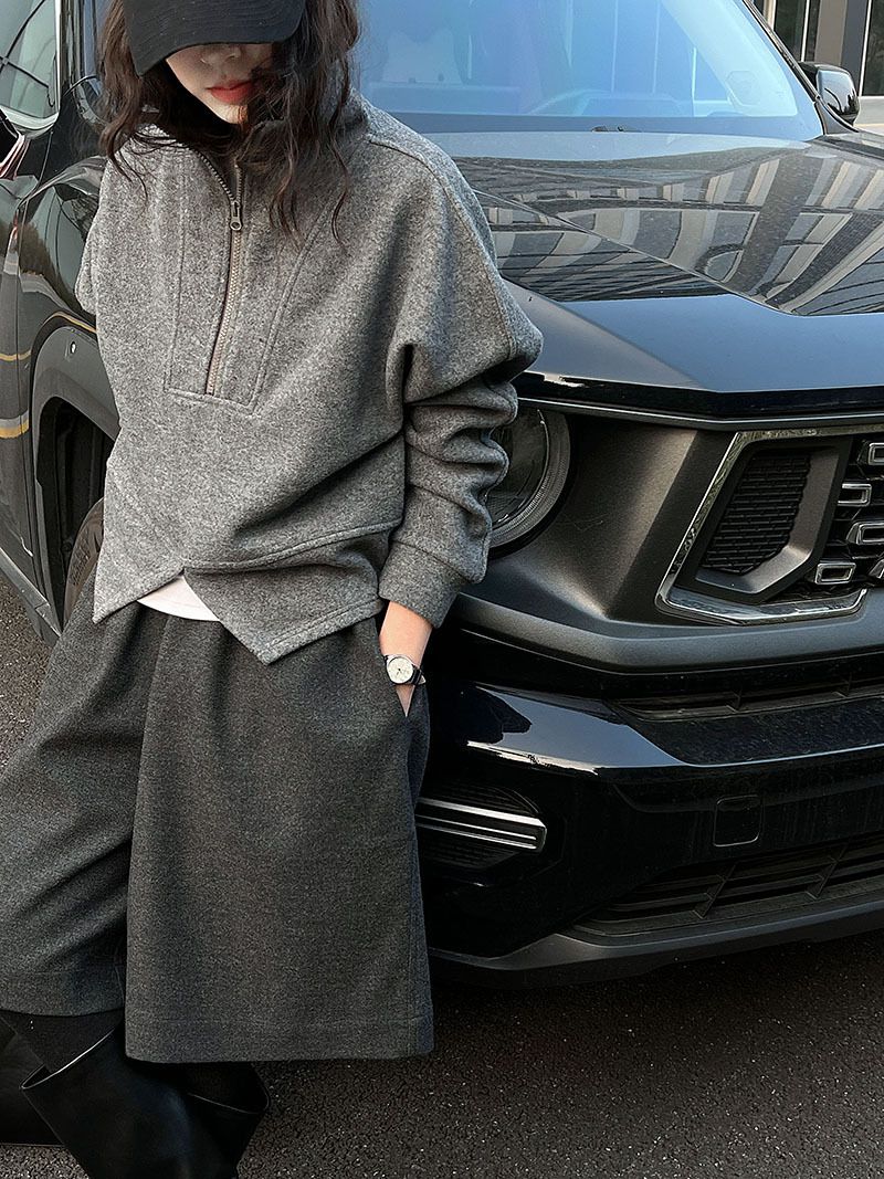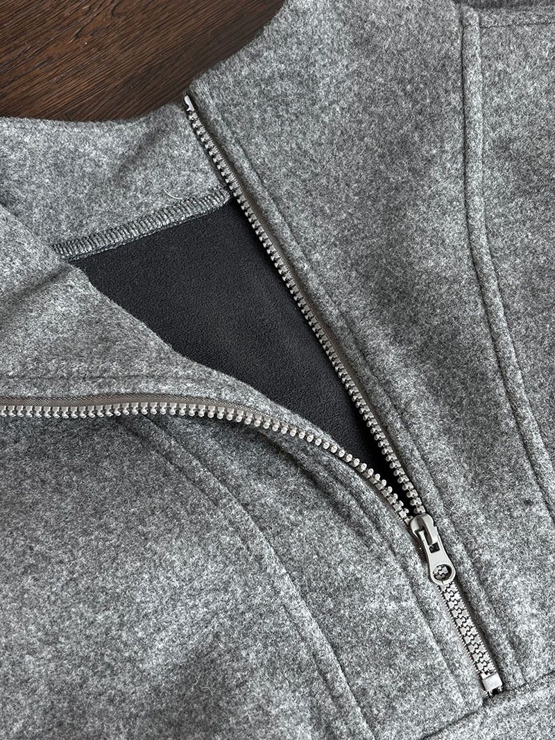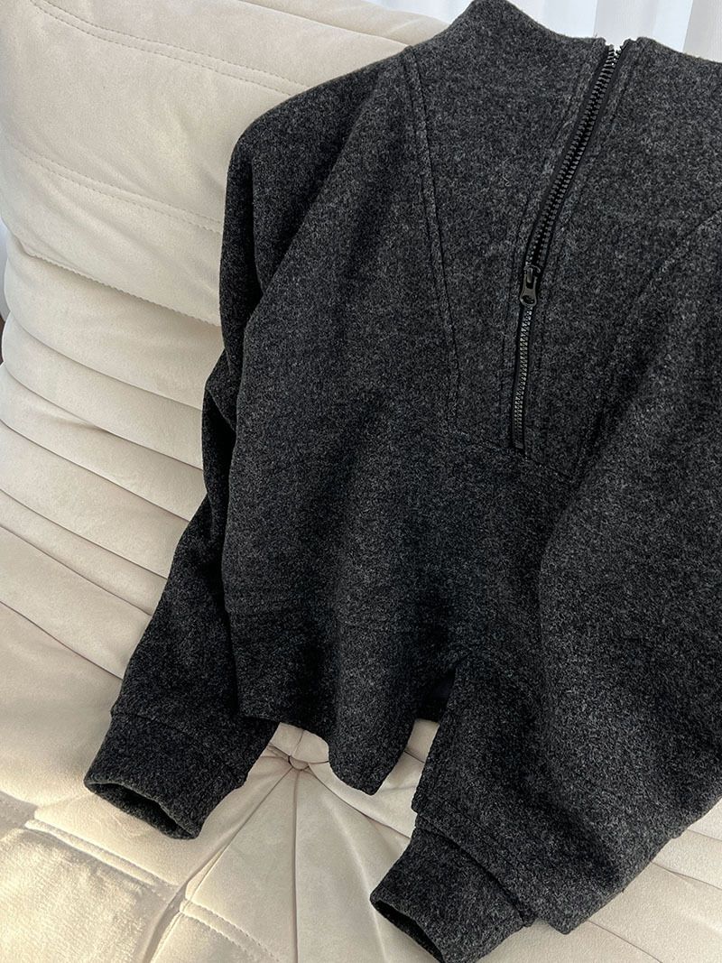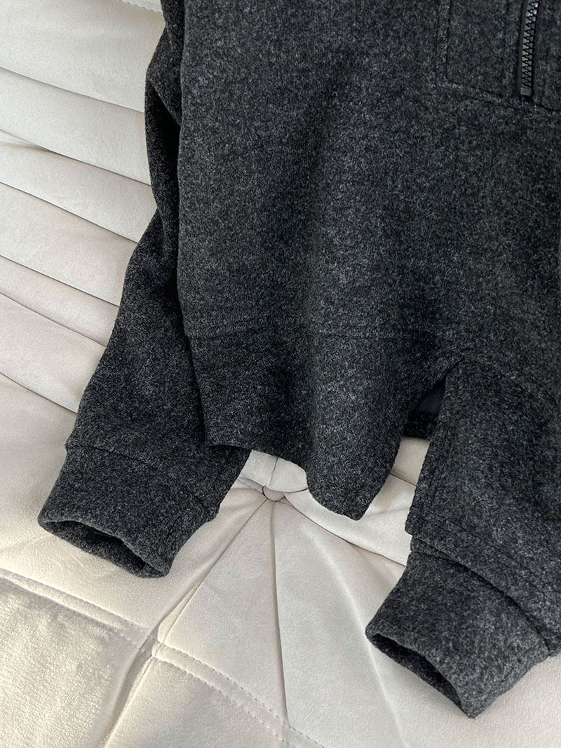 兩種尺寸/厚磅毛呢面料/內毛絨/半開襟拉鍊領/V領/正面開衩/三角切口/連肩袖/寬鬆短版 - 休閒居家簡約百搭素面拉鍊立領上衣長袖上衣內刷毛上衣寬鬆大尺碼上衣短版上衣多尺寸ML灰色深灰色