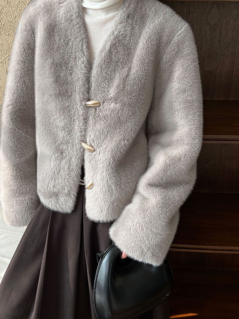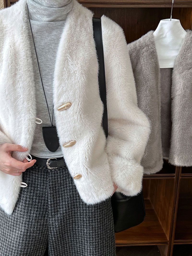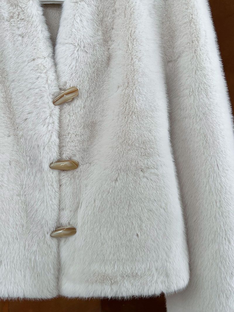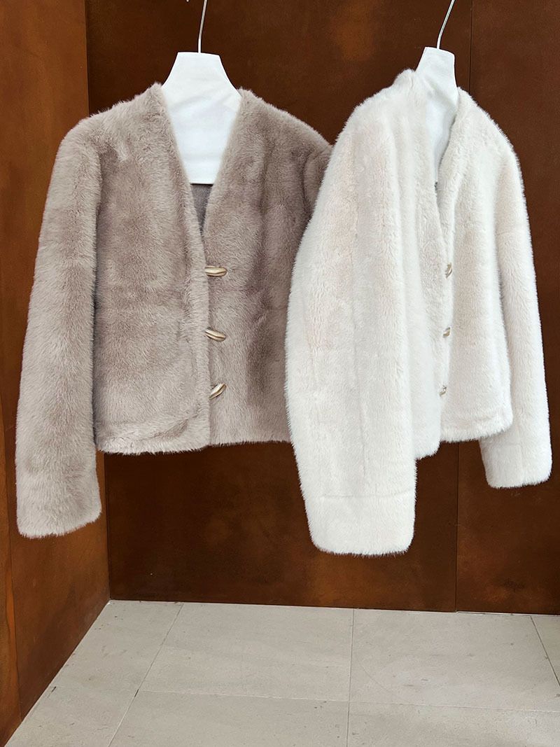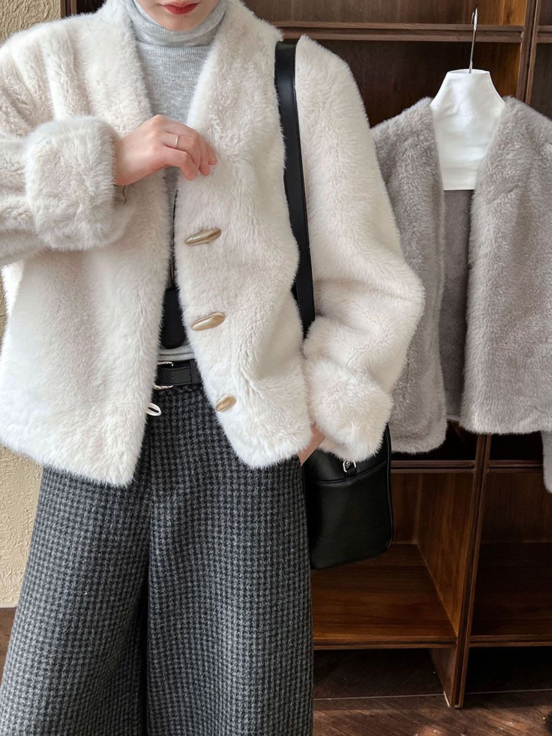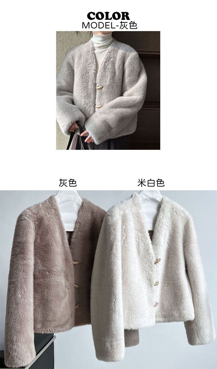 兩種尺寸/絲滑水貂毛/V領/開襟排釦/羊角釦/雙口袋/內麂皮 - 休閒婚禮簡約百搭素面水貂毛外套長袖外套長袖夾克刷毛外套毛毛外套多尺寸ML米白色灰色