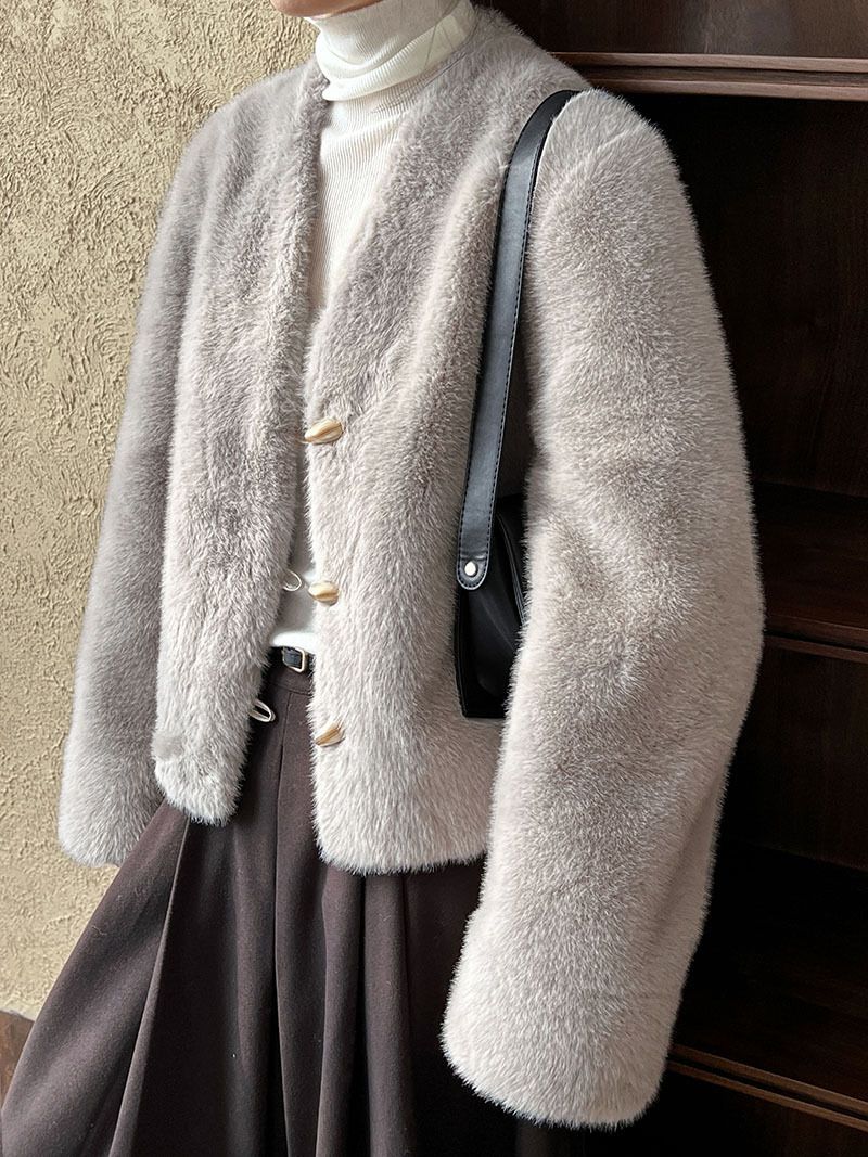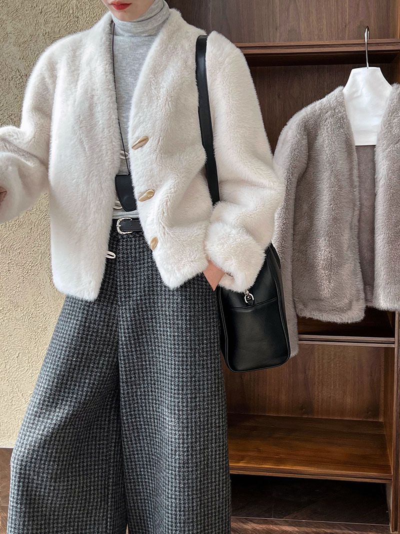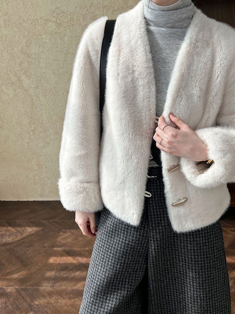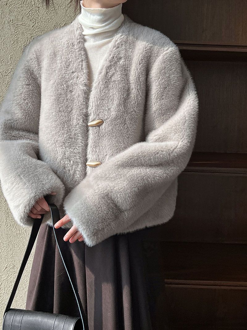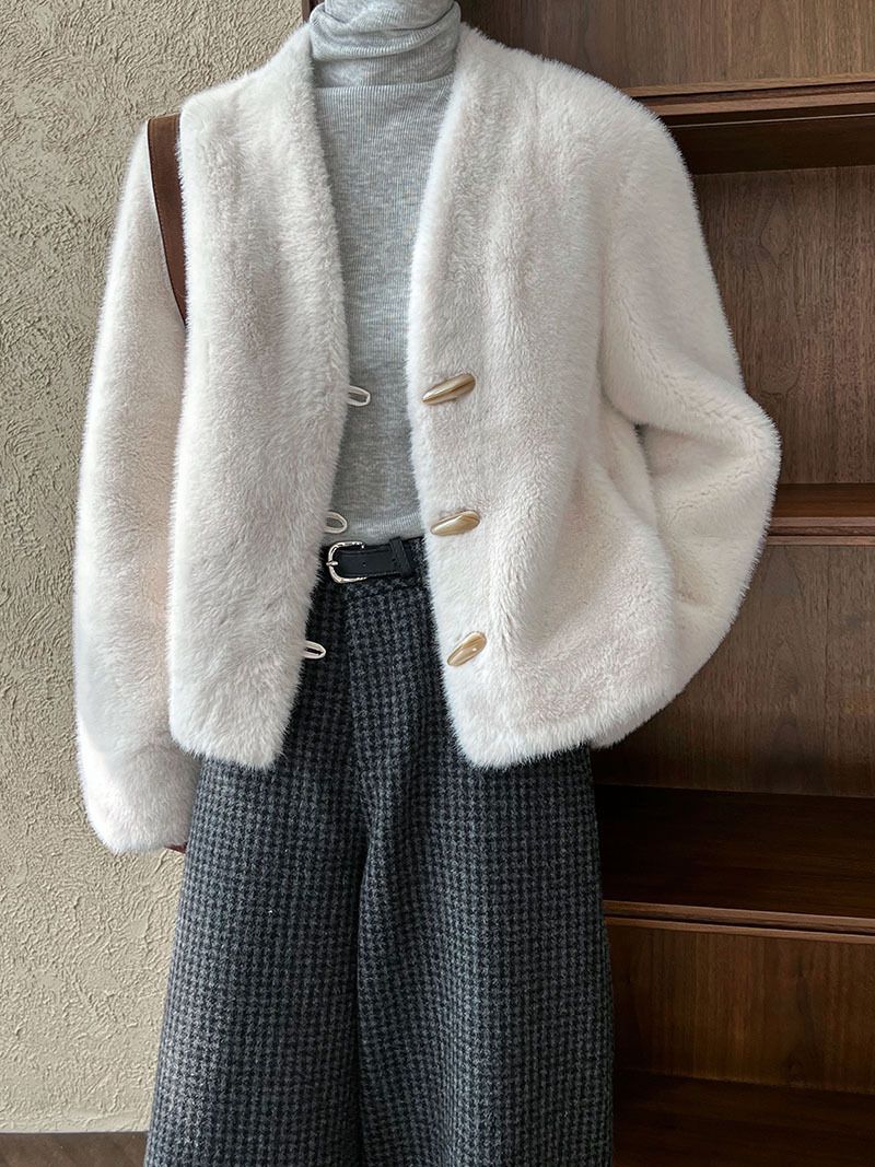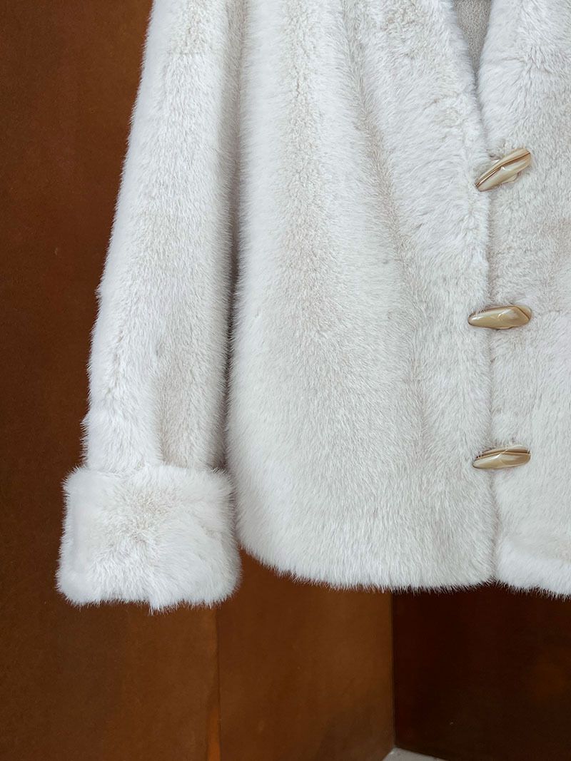 兩種尺寸/絲滑水貂毛/V領/開襟排釦/羊角釦/雙口袋/內麂皮 - 休閒婚禮簡約百搭素面水貂毛外套長袖外套長袖夾克刷毛外套毛毛外套多尺寸ML米白色灰色