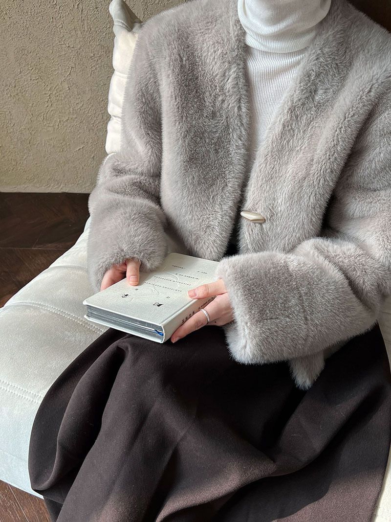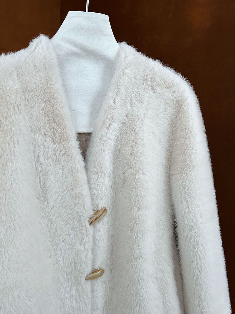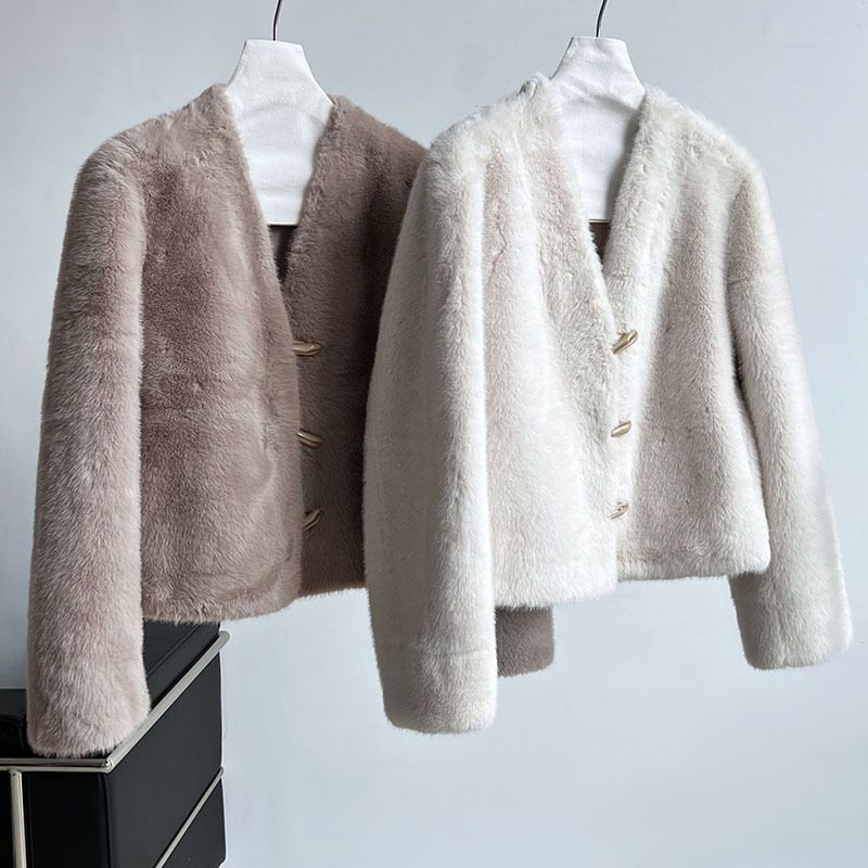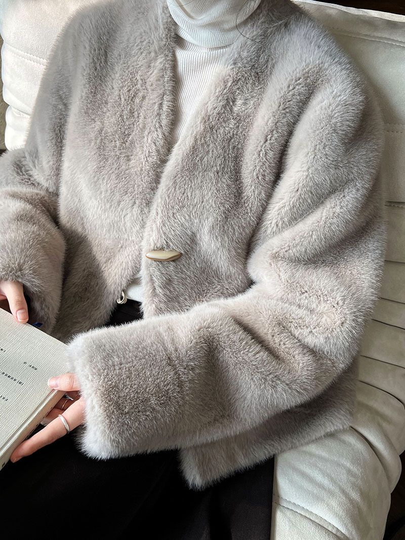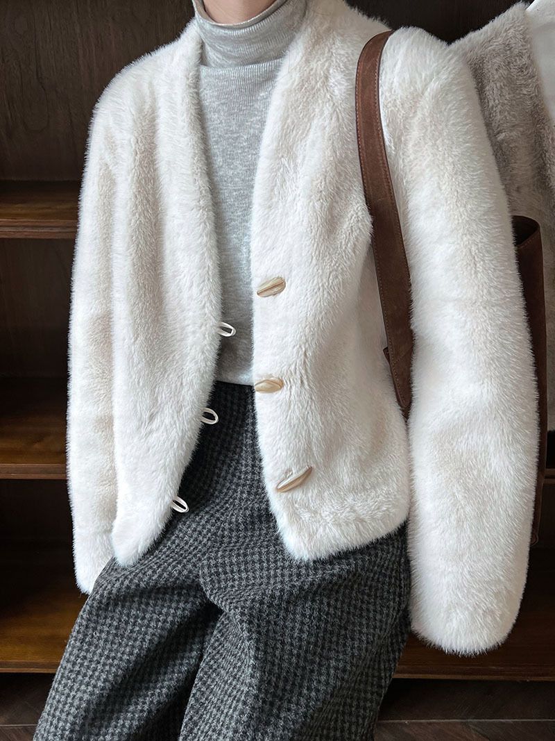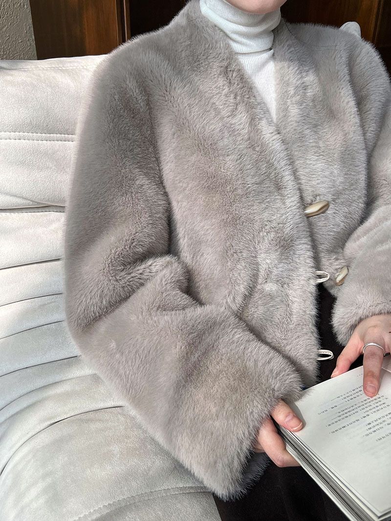 兩種尺寸/絲滑水貂毛/V領/開襟排釦/羊角釦/雙口袋/內麂皮 - 休閒婚禮簡約百搭素面水貂毛外套長袖外套長袖夾克刷毛外套毛毛外套多尺寸ML米白色灰色