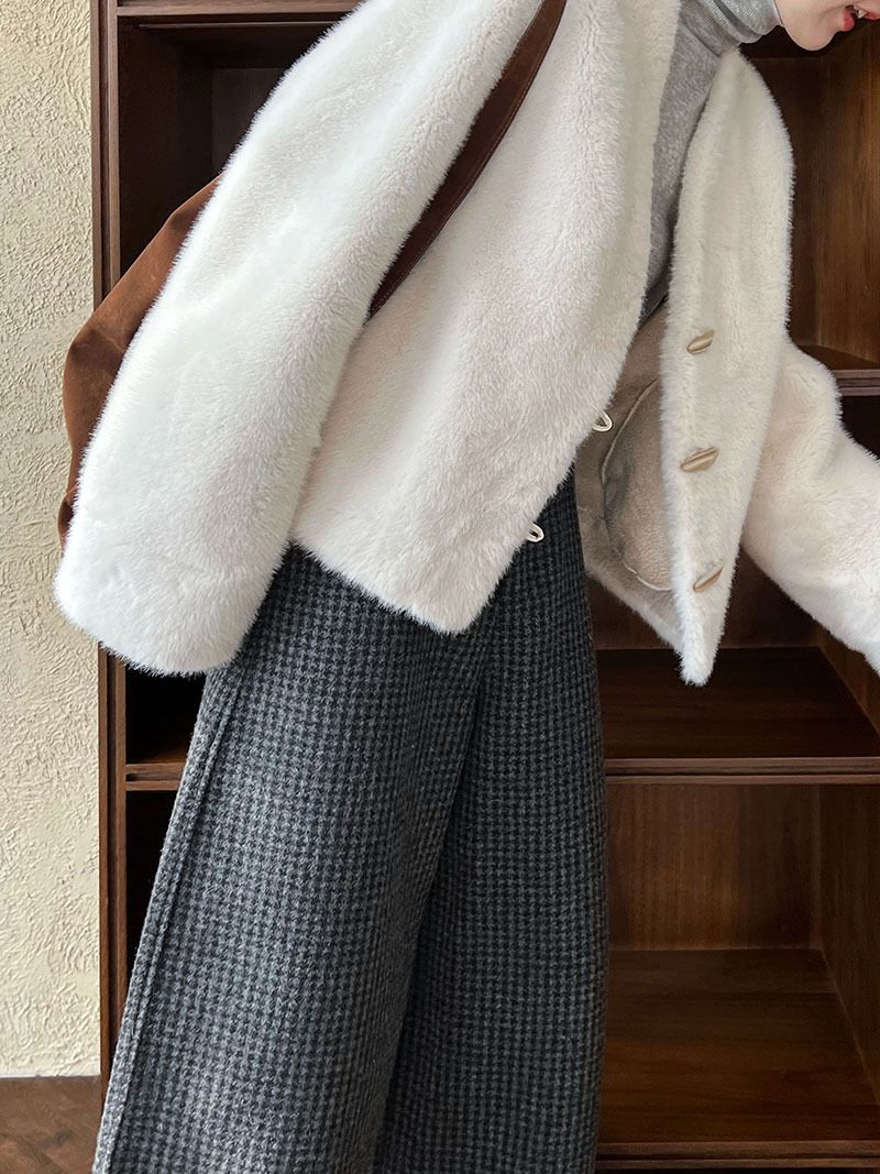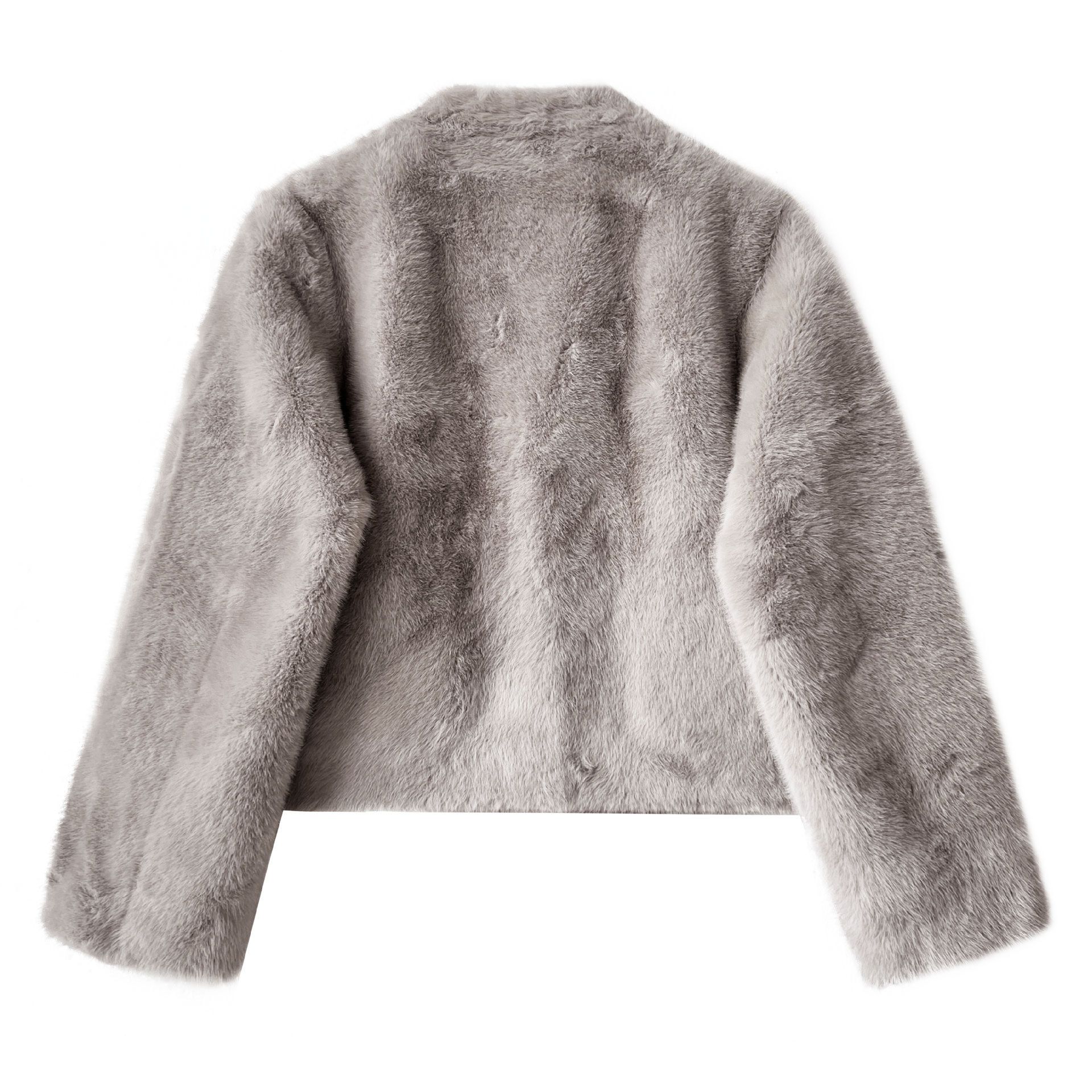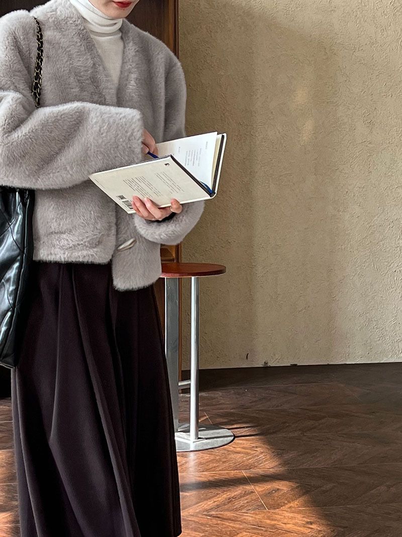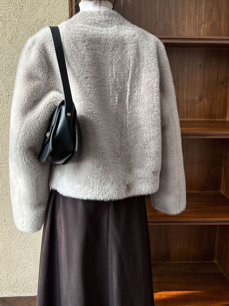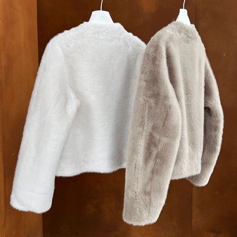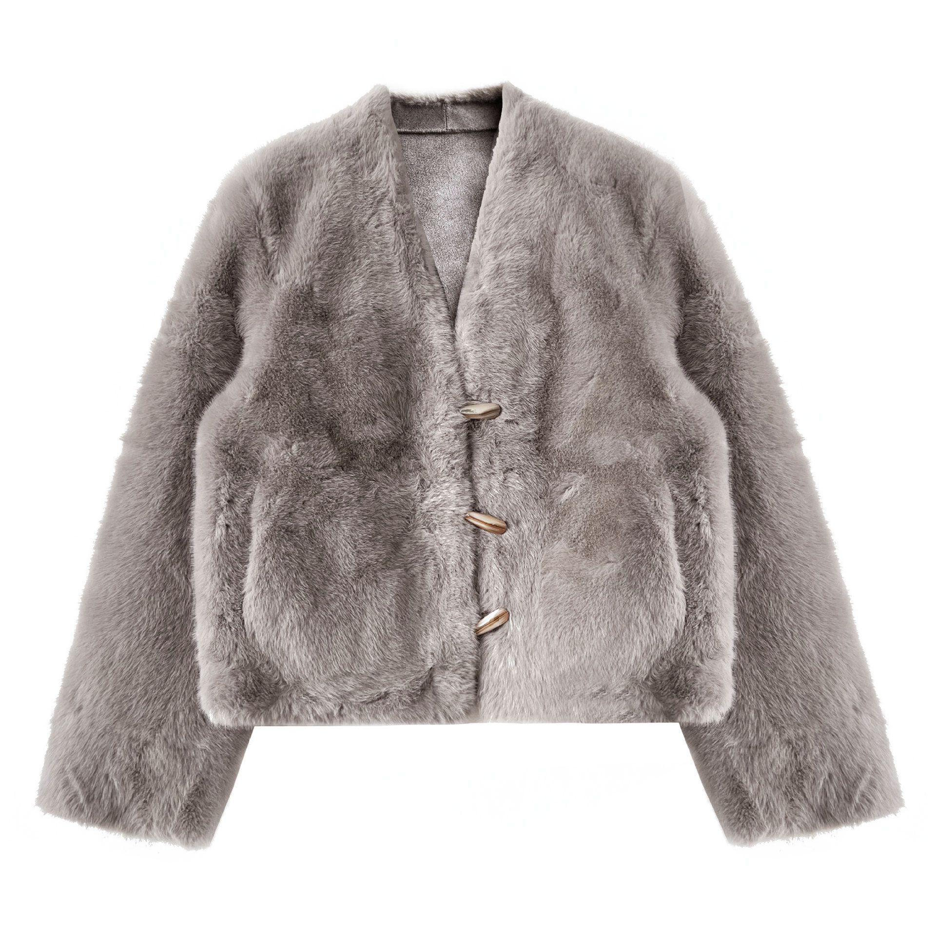 兩種尺寸/絲滑水貂毛/V領/開襟排釦/羊角釦/雙口袋/內麂皮 - 休閒婚禮簡約百搭素面水貂毛外套長袖外套長袖夾克刷毛外套毛毛外套多尺寸ML米白色灰色