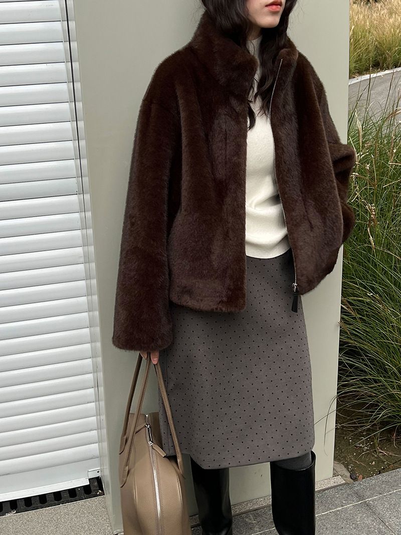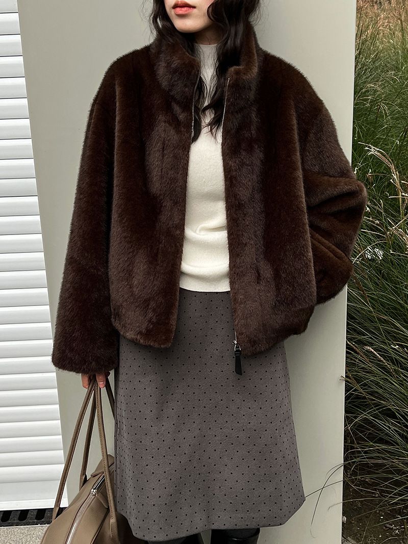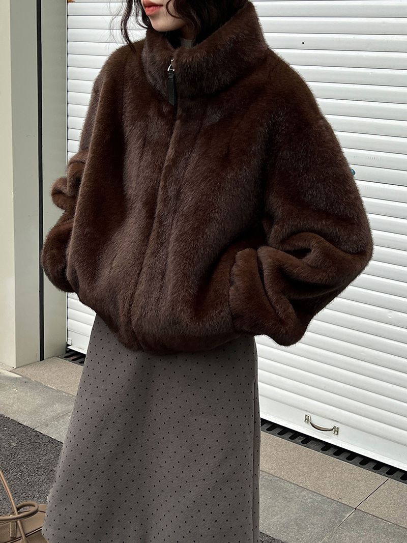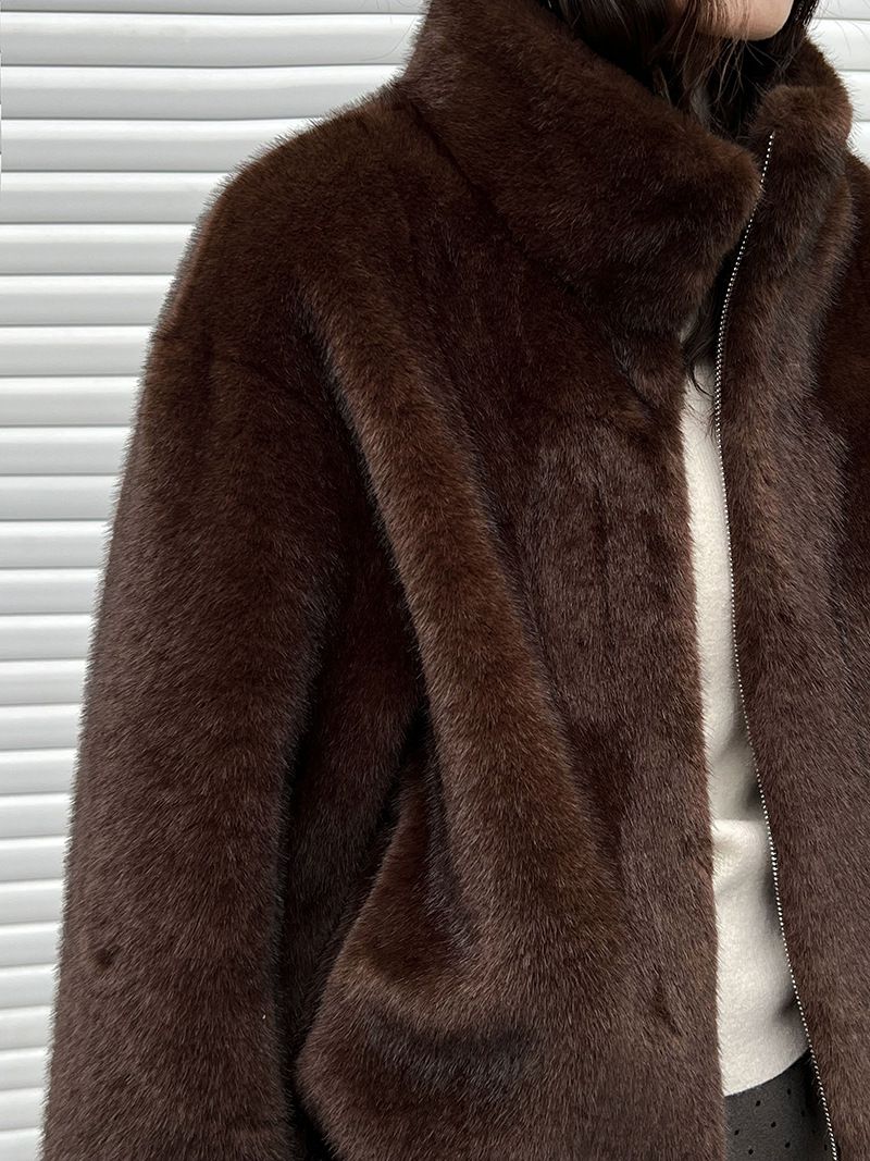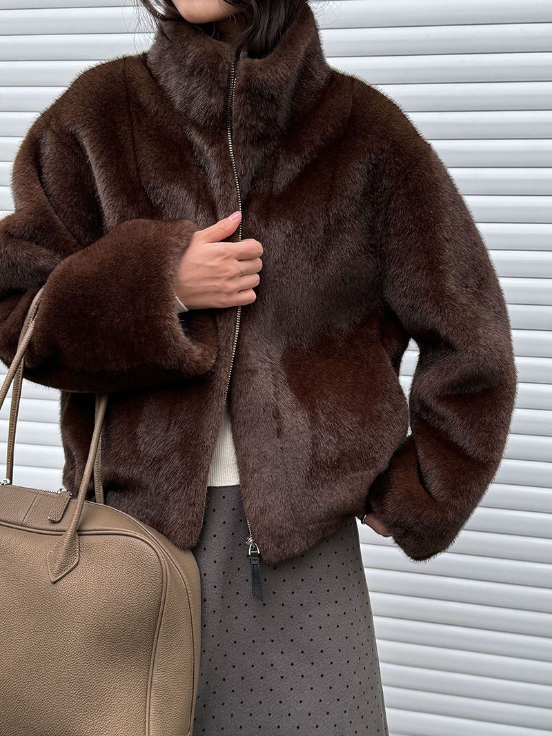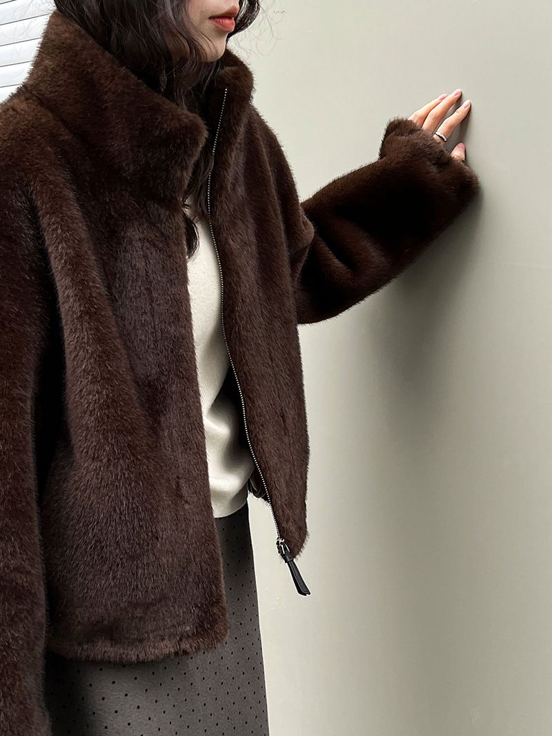 【C60066】品牌 束袖水貂毛外套-拉鍊立領素面雙口袋長袖收腰夾克★★