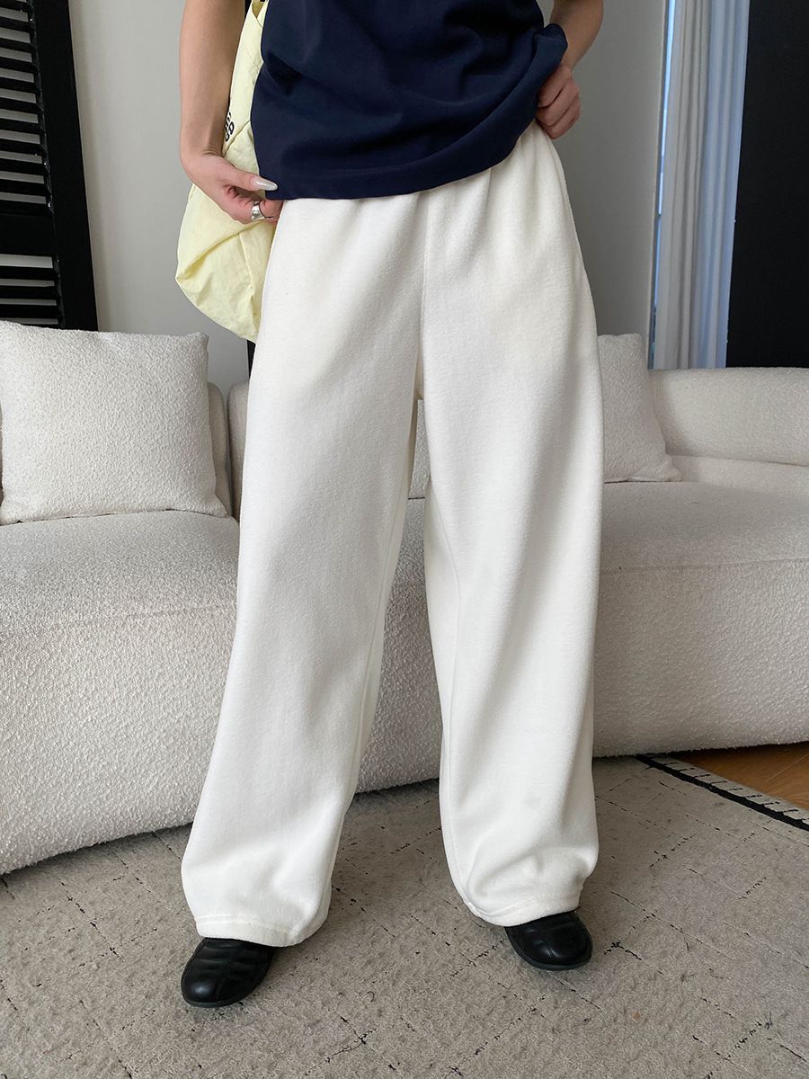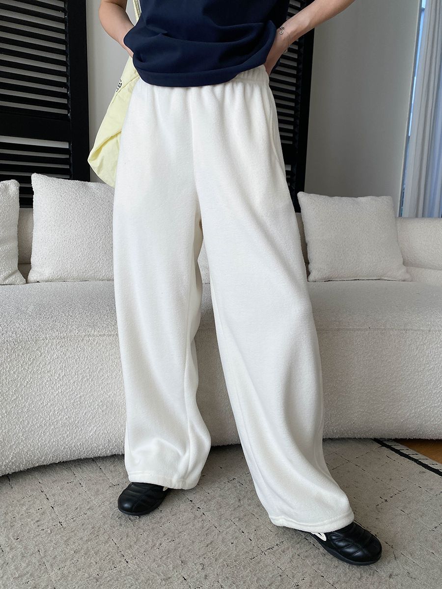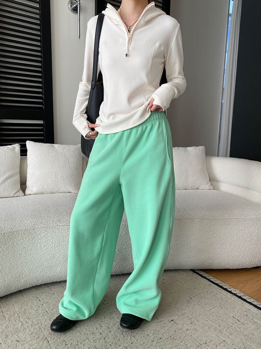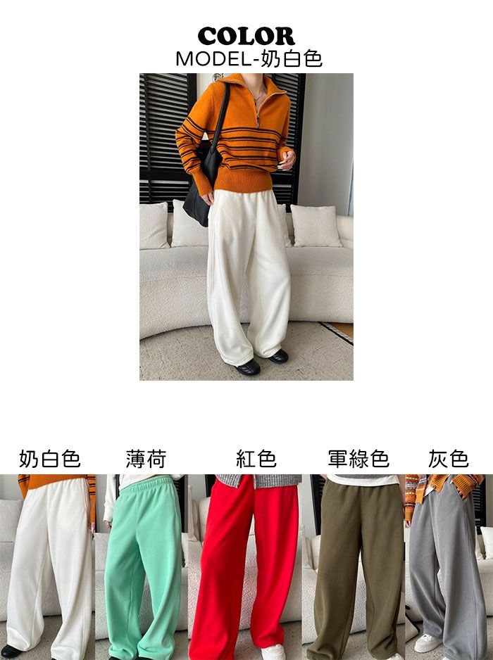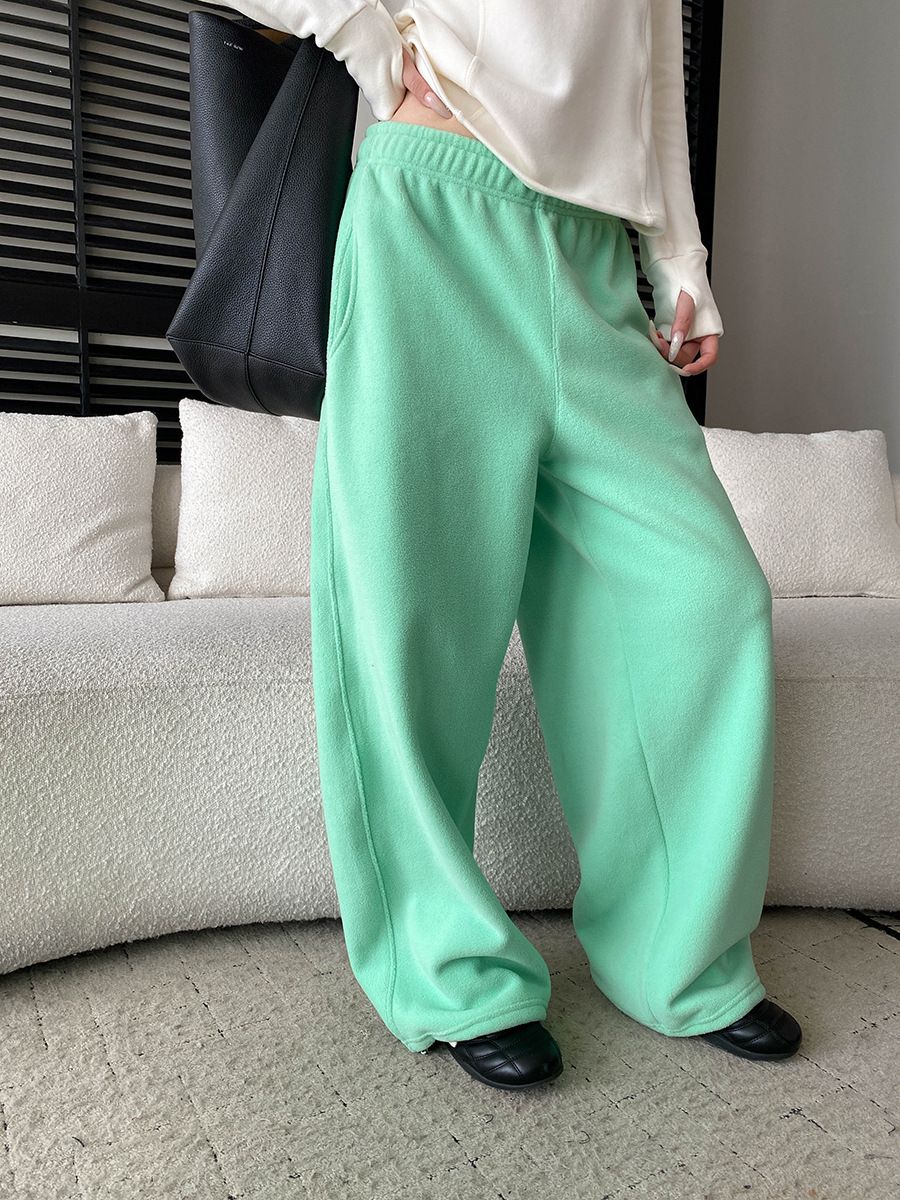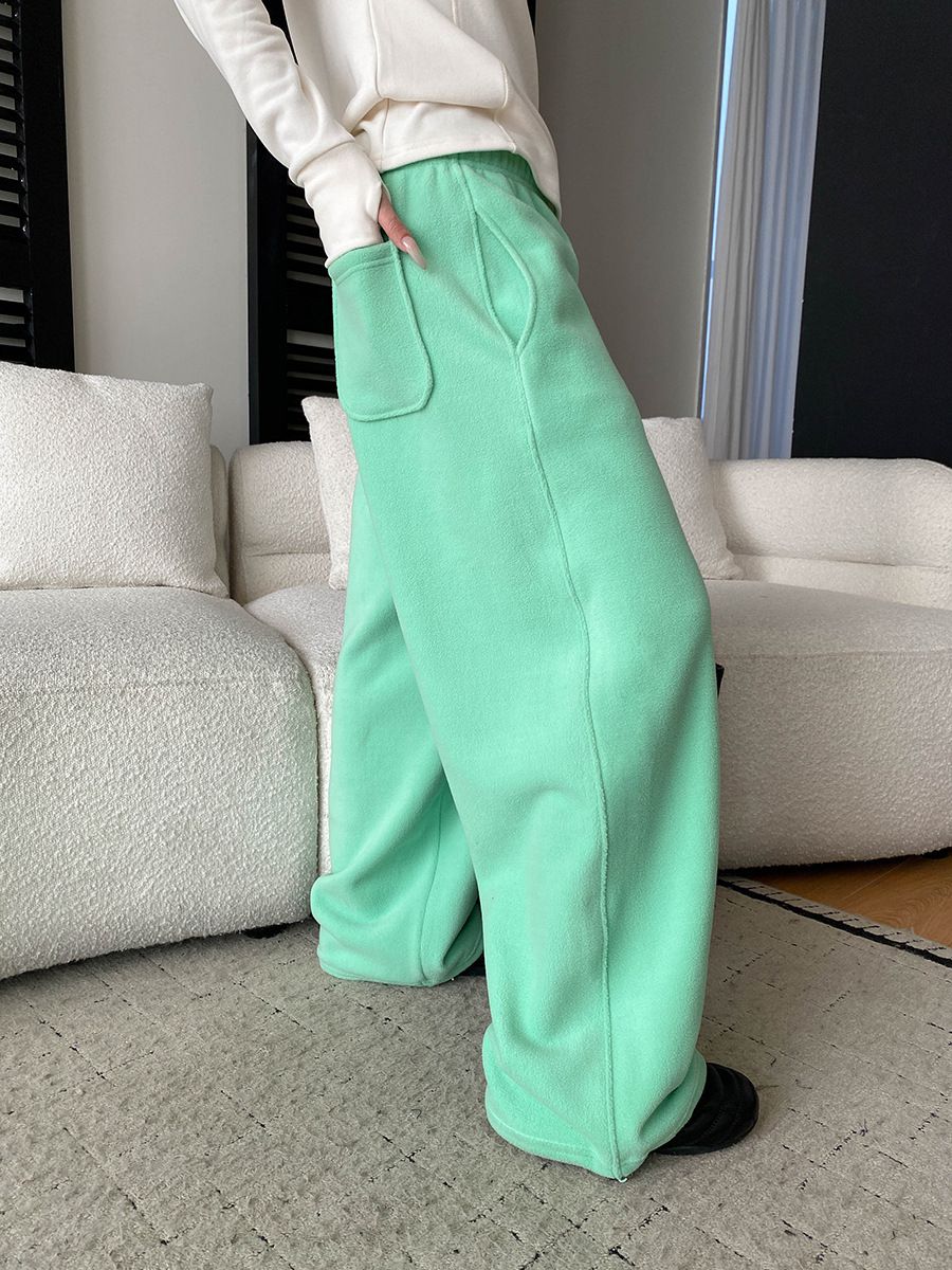 兩種尺寸/厚磅毛呢面料/全腰鬆緊/褲頭腰內抽繩/雙口袋/抽繩束口褲腳 - 休閒居家簡約百搭素面毛呢寬褲束口長褲多尺寸ML奶白色薄荷色紅色灰色軍綠色