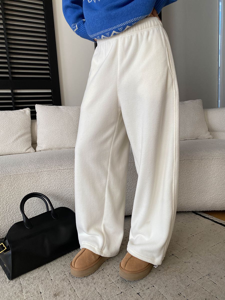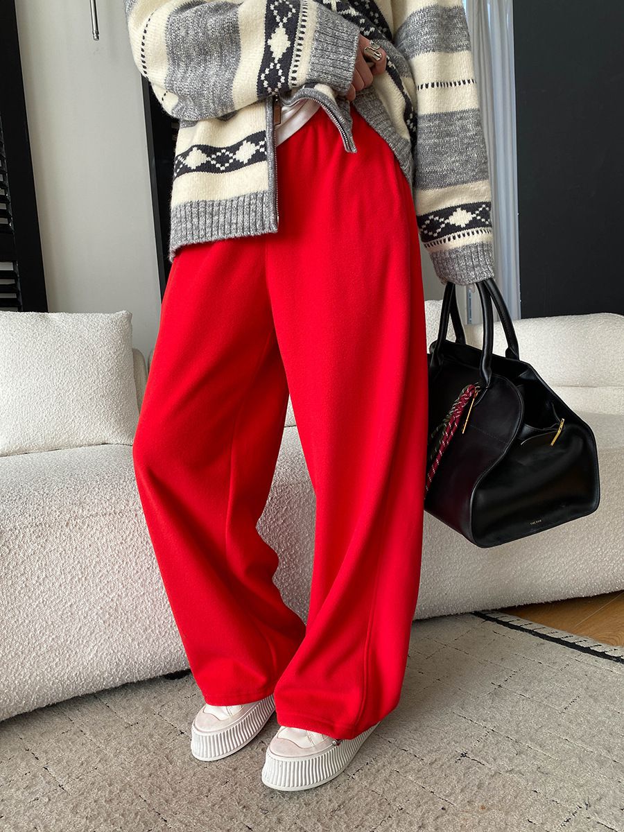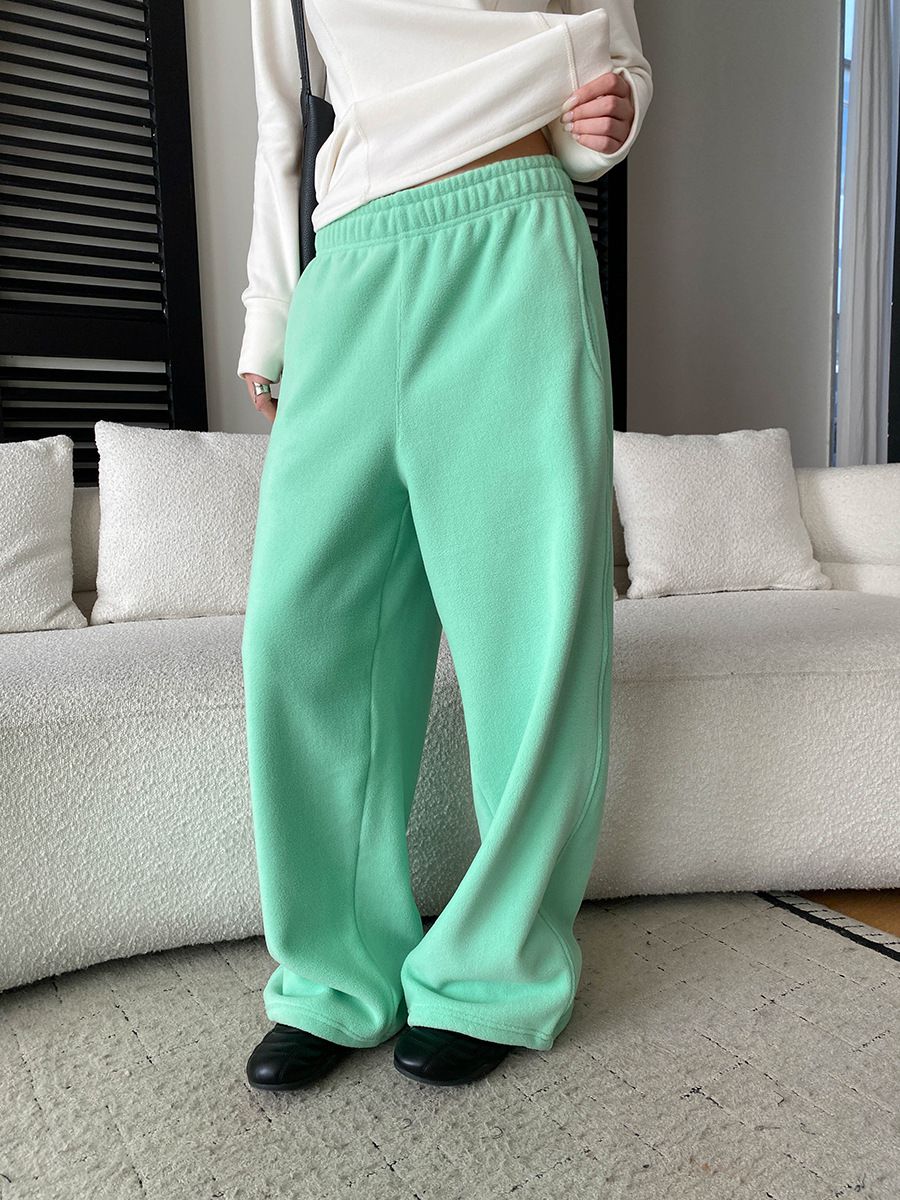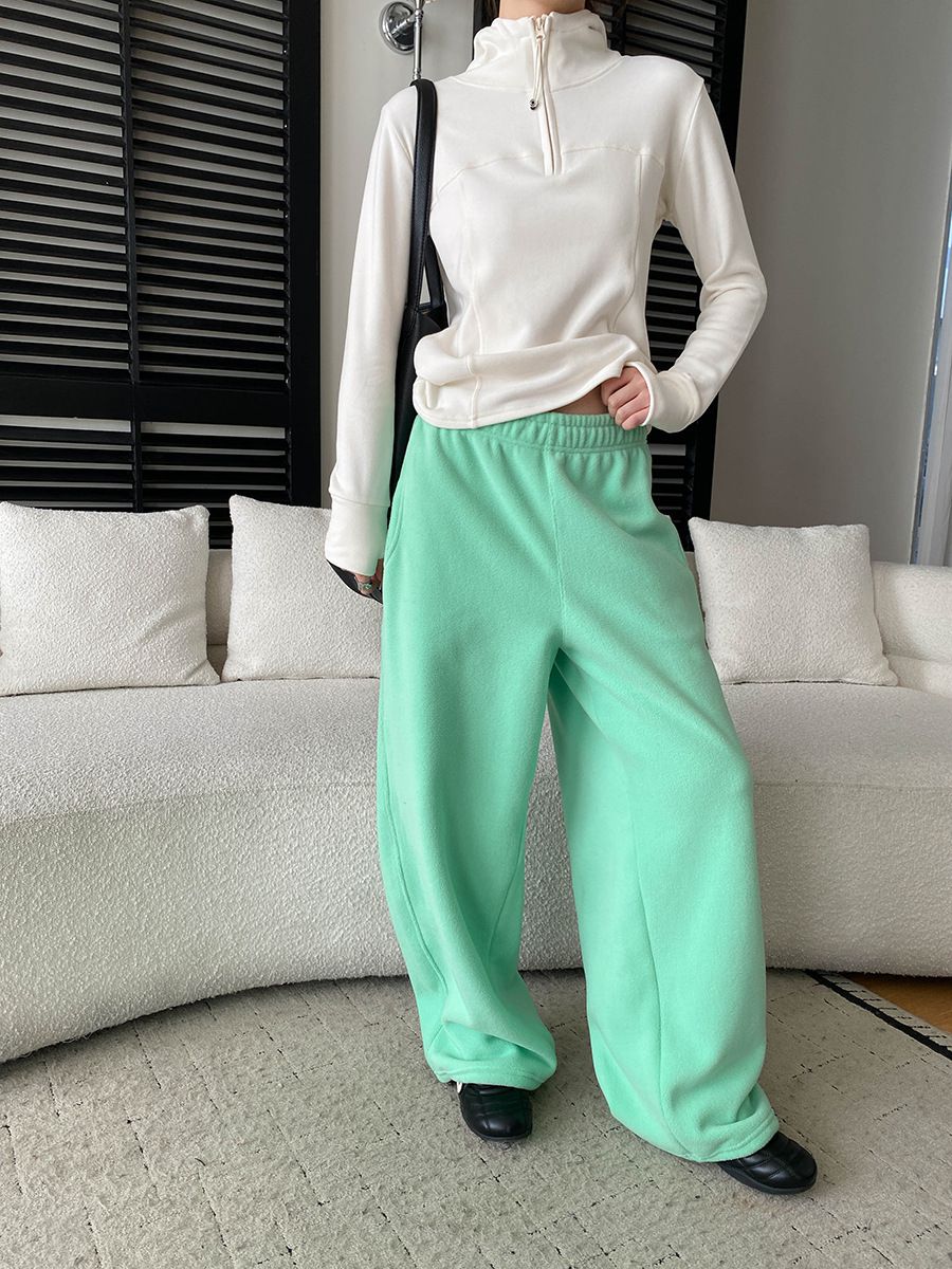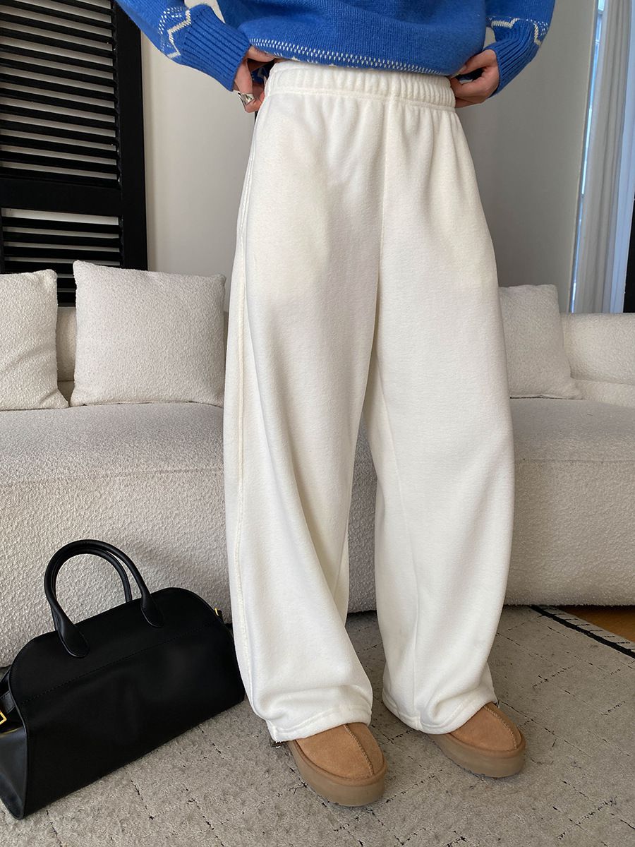 兩種尺寸/厚磅毛呢面料/全腰鬆緊/褲頭腰內抽繩/雙口袋/抽繩束口褲腳 - 休閒居家簡約百搭素面毛呢寬褲束口長褲多尺寸ML奶白色薄荷色紅色灰色軍綠色