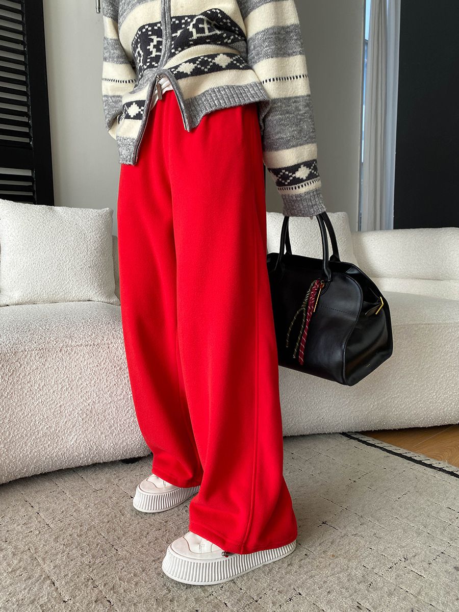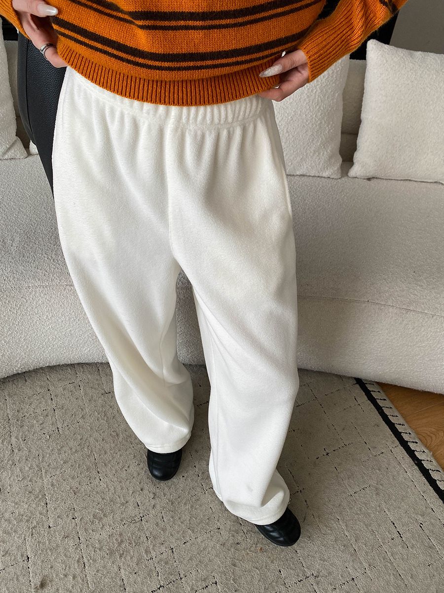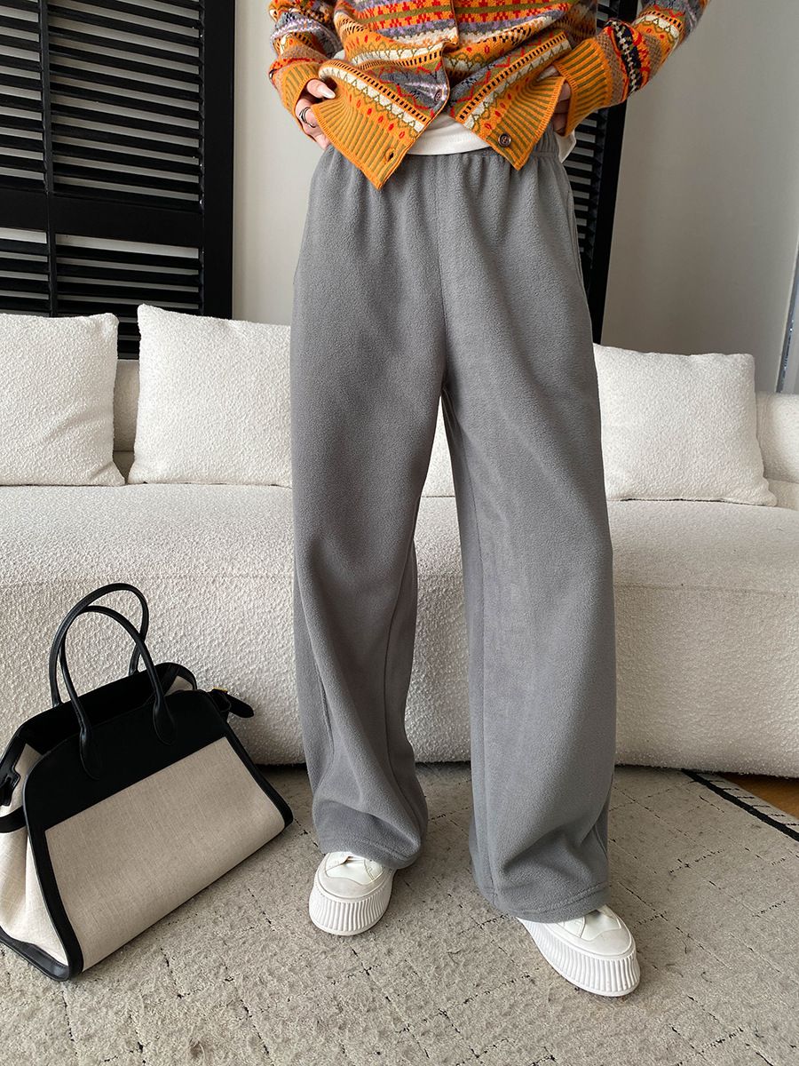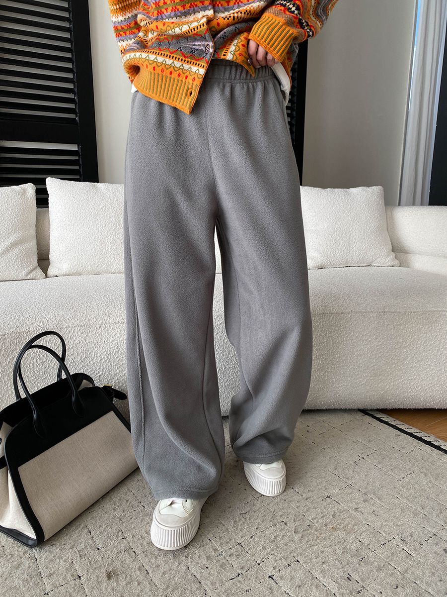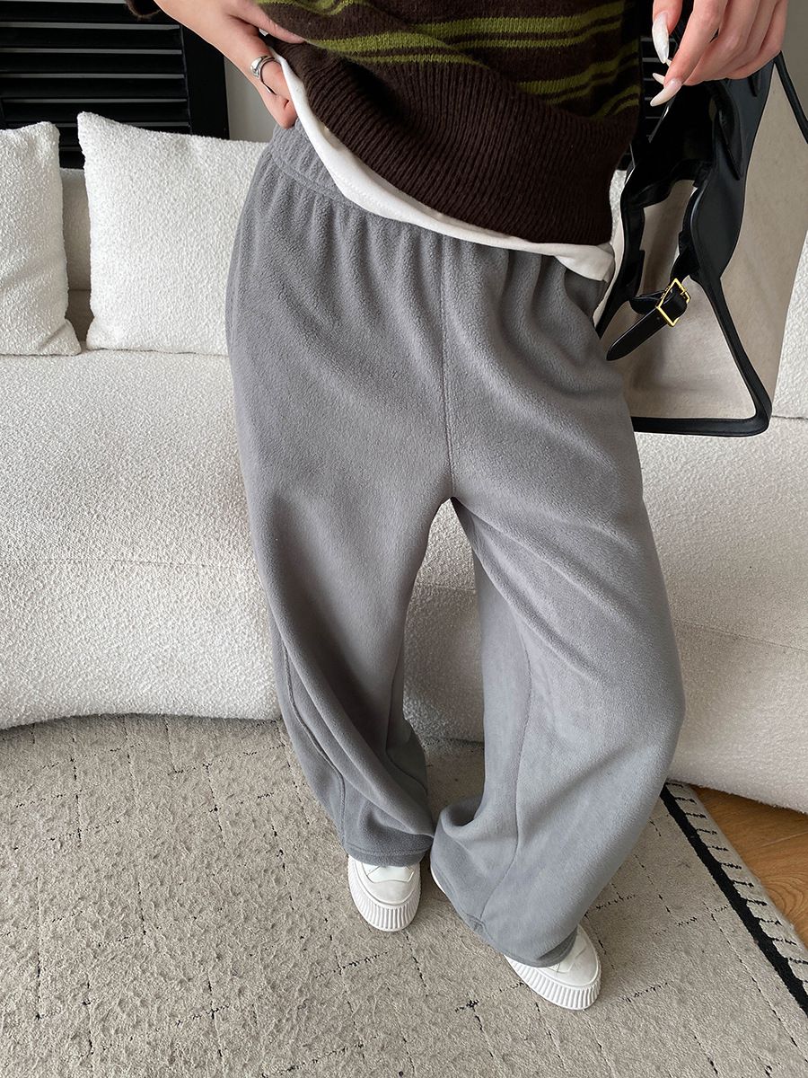 兩種尺寸/厚磅毛呢面料/全腰鬆緊/褲頭腰內抽繩/雙口袋/抽繩束口褲腳 - 休閒居家簡約百搭素面毛呢寬褲束口長褲多尺寸ML奶白色薄荷色紅色灰色軍綠色