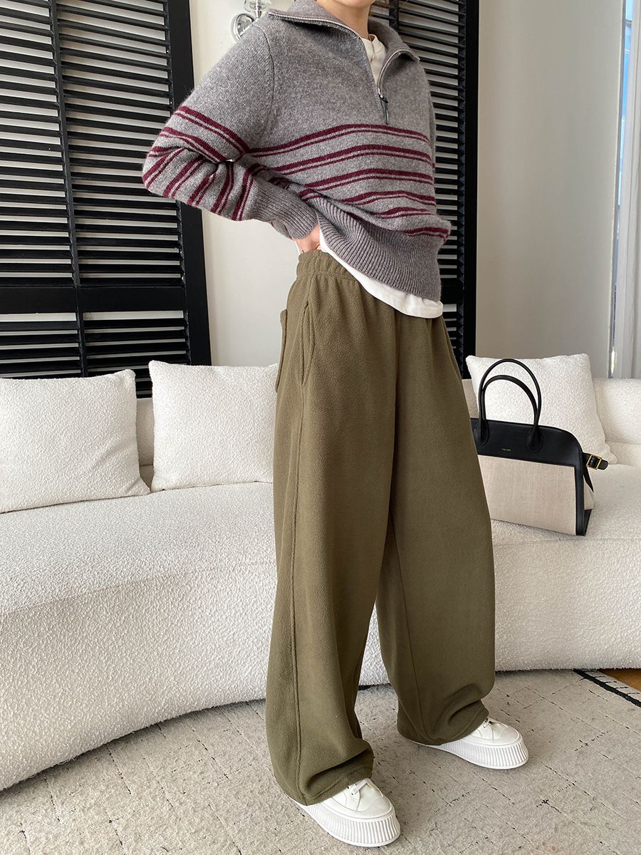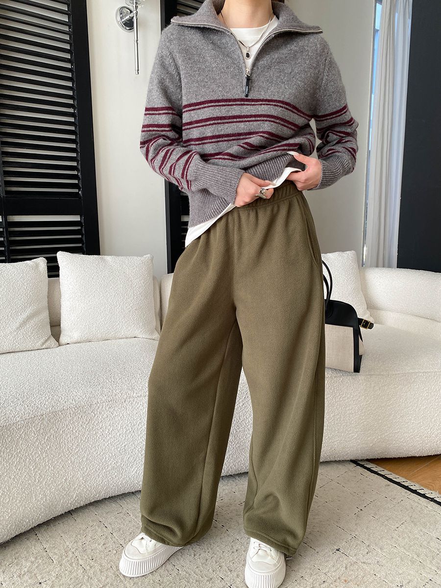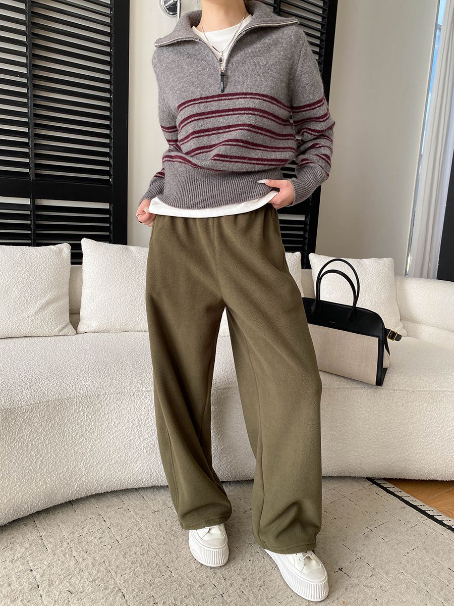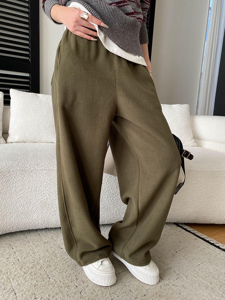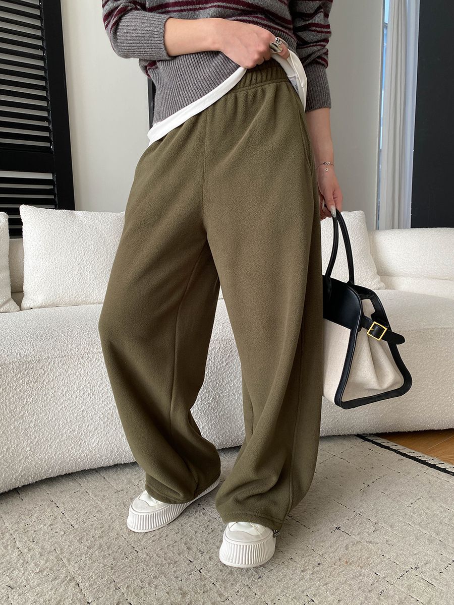 兩種尺寸/厚磅毛呢面料/全腰鬆緊/褲頭腰內抽繩/雙口袋/抽繩束口褲腳 - 休閒居家簡約百搭素面毛呢寬褲束口長褲多尺寸ML奶白色薄荷色紅色灰色軍綠色