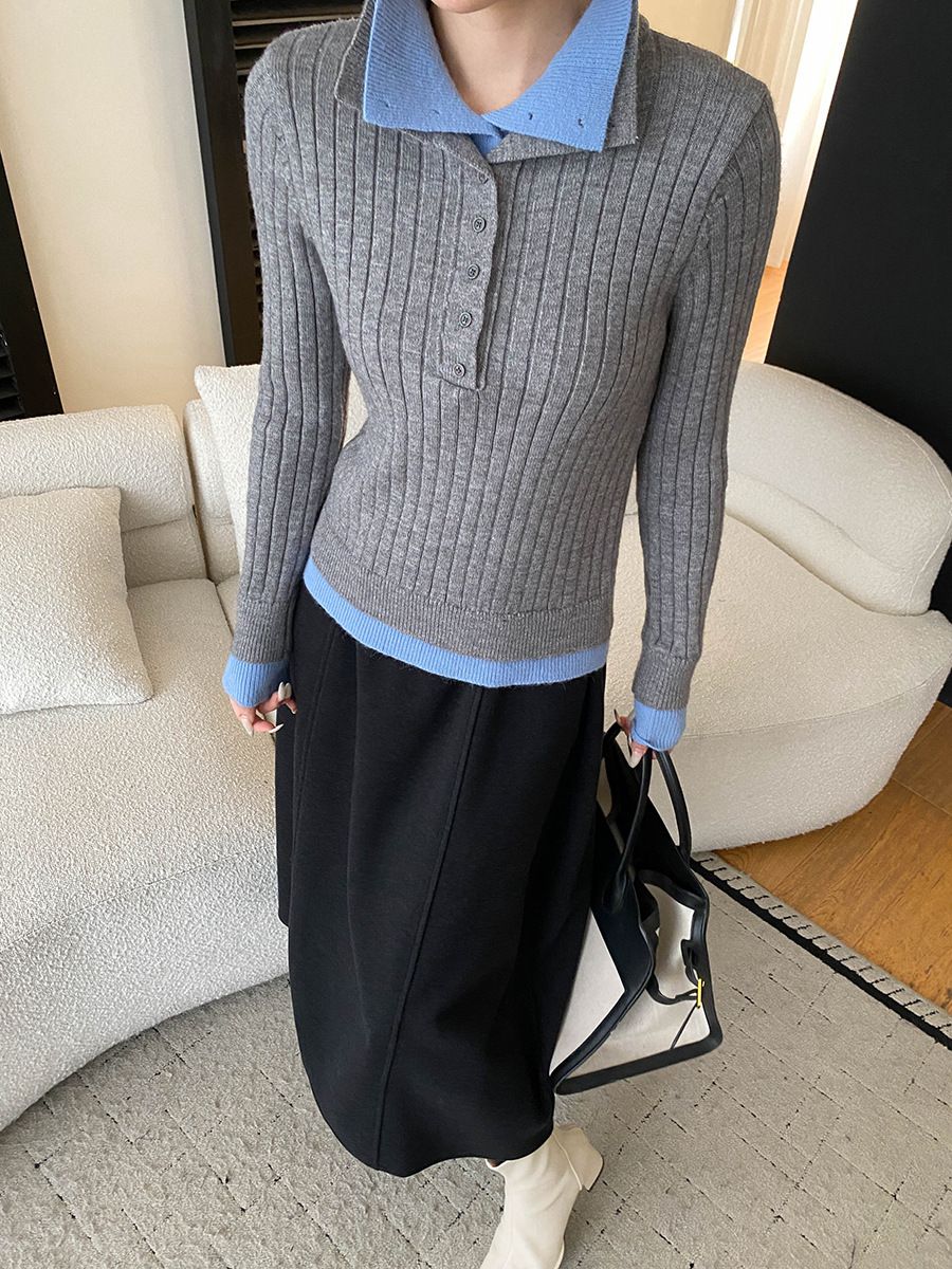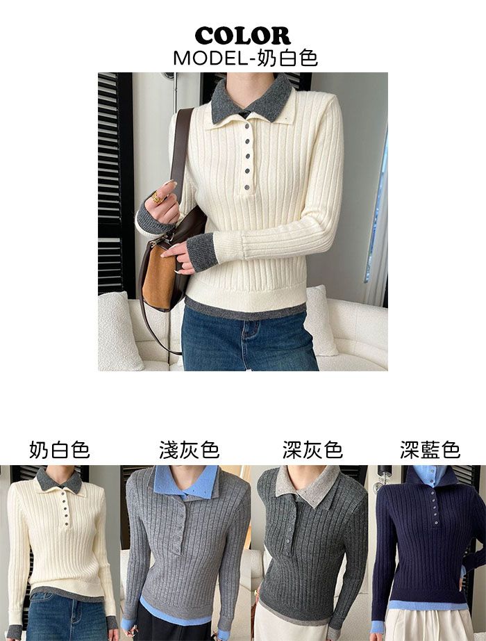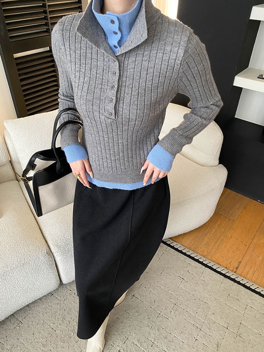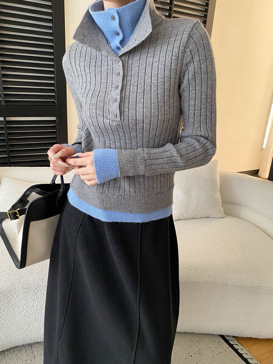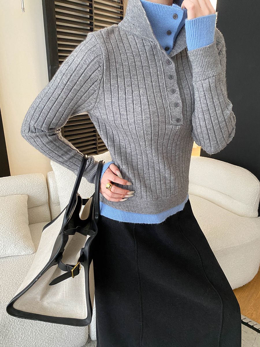 假兩件拼接/坑條面料/雙層領/立領.高領/半開襟排釦領 - 休閒居家簡約百搭素面雙層領針織衫針織上衣長袖上衣奶白色淺灰色深灰色深藍色