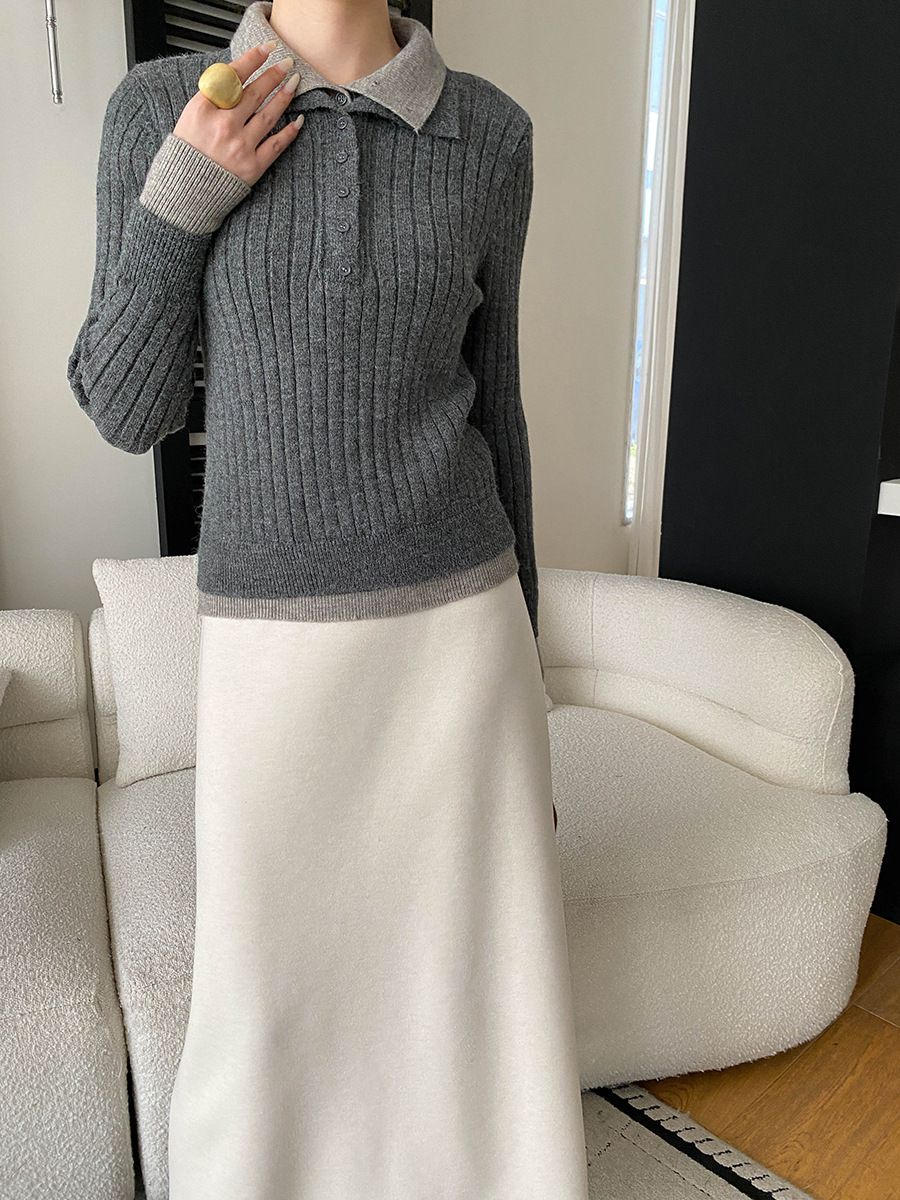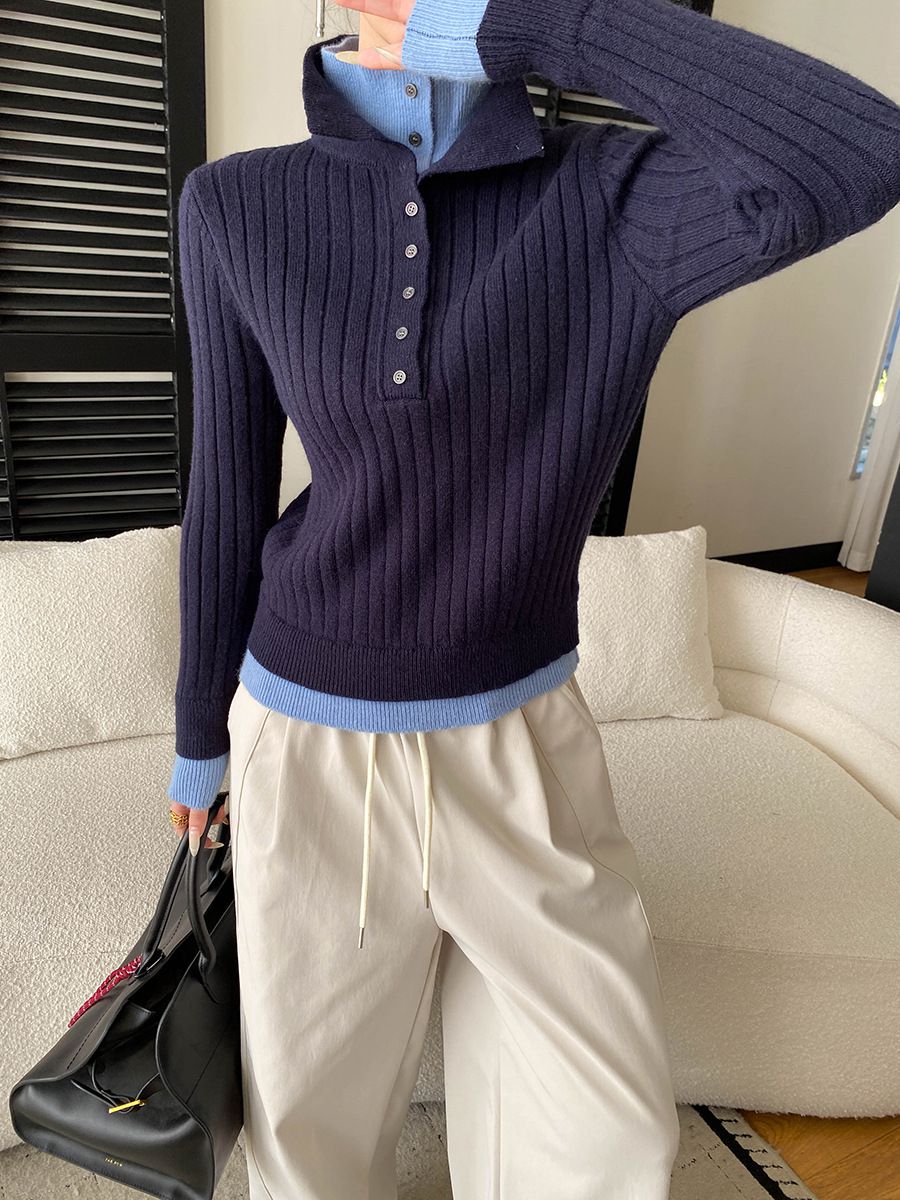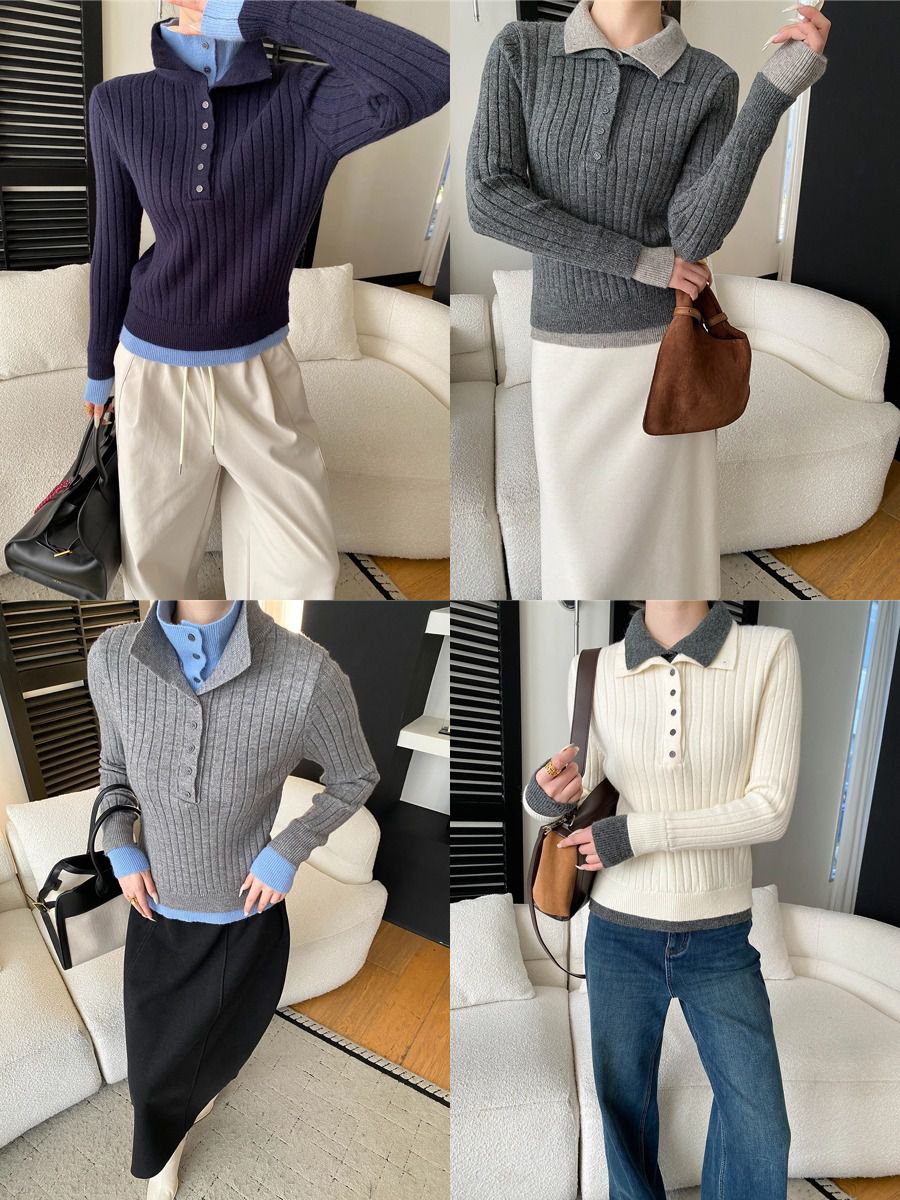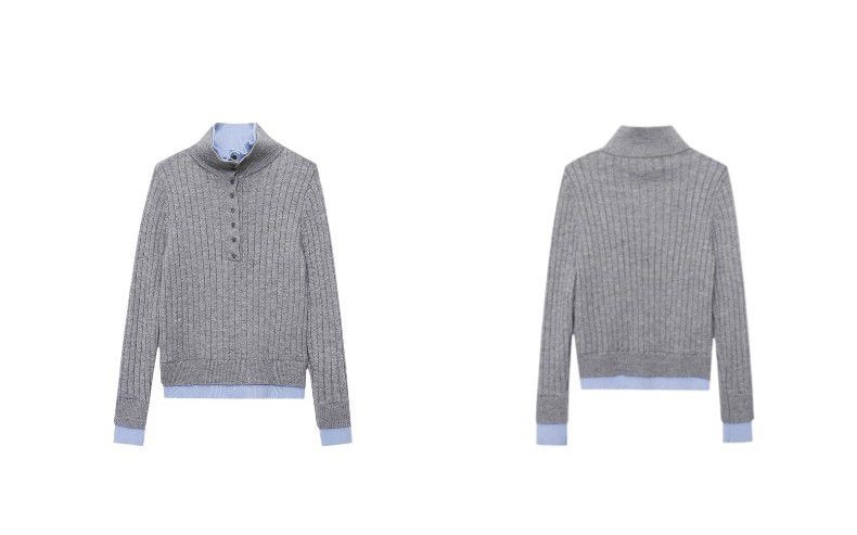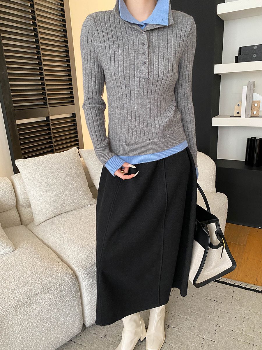 假兩件拼接/坑條面料/雙層領/立領.高領/半開襟排釦領 - 休閒居家簡約百搭素面雙層領針織衫針織上衣長袖上衣奶白色淺灰色深灰色深藍色