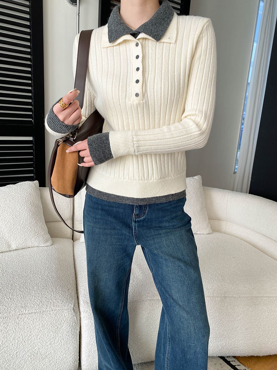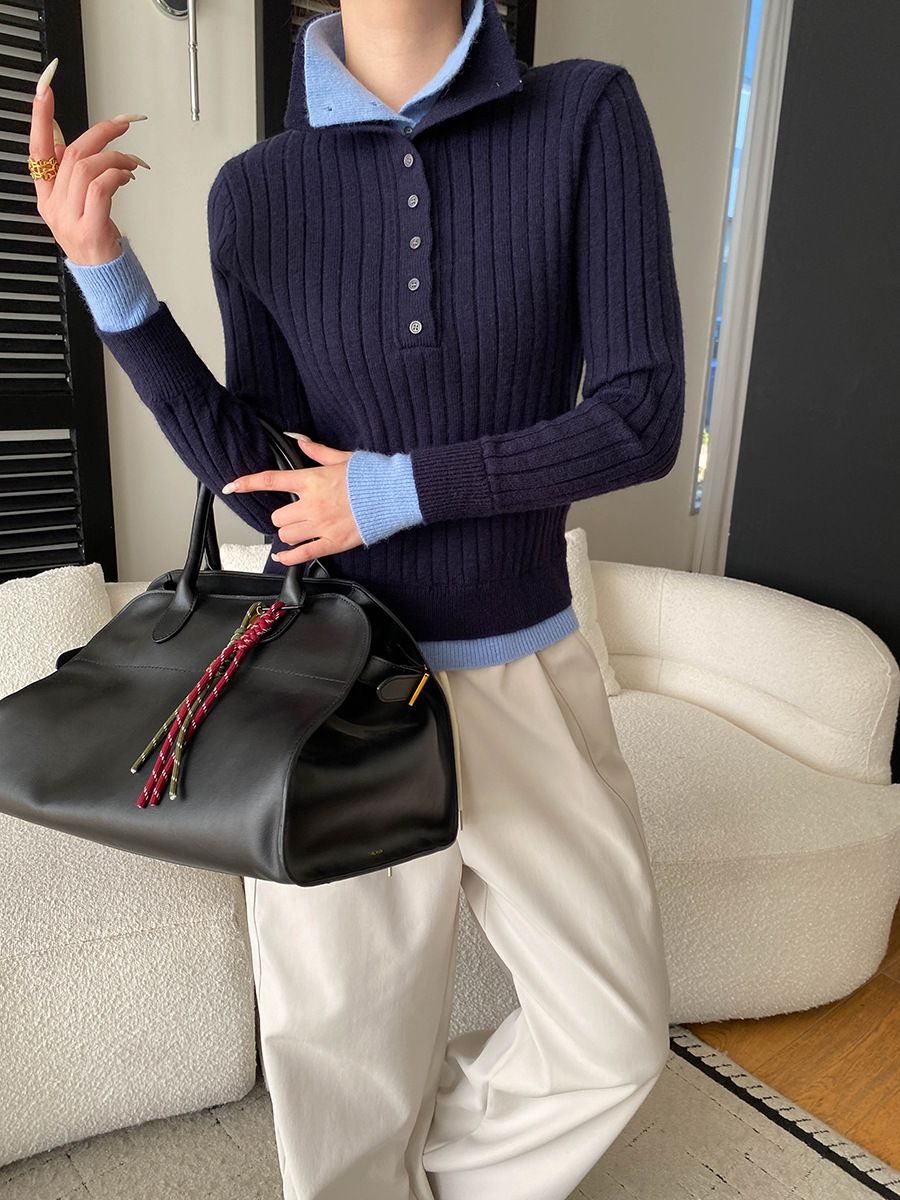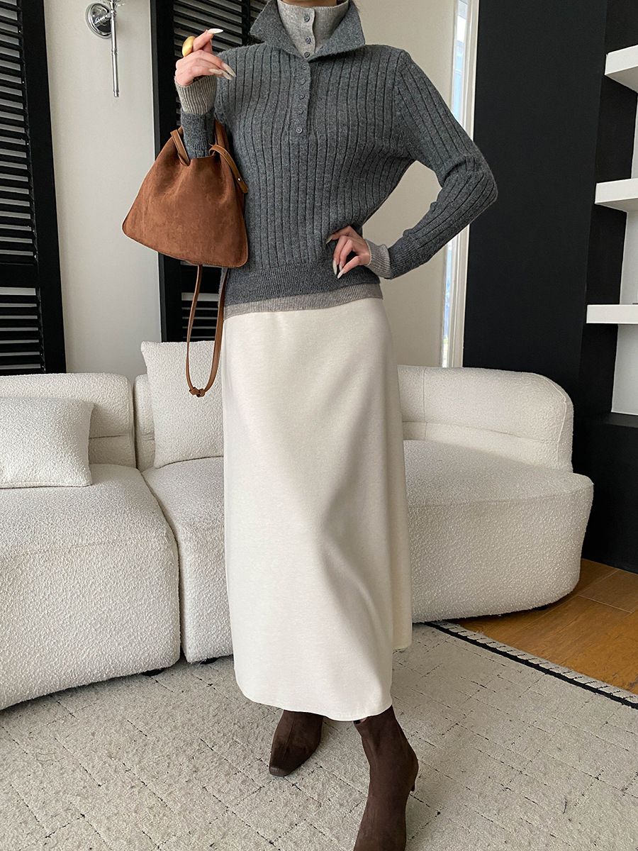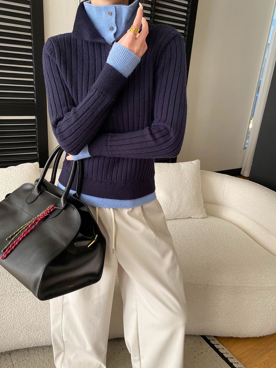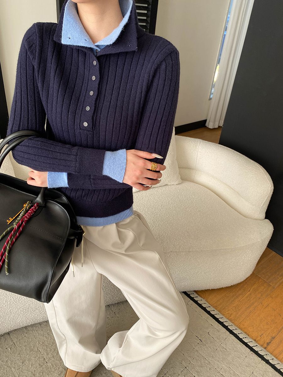 假兩件拼接/坑條面料/雙層領/立領.高領/半開襟排釦領 - 休閒居家簡約百搭素面雙層領針織衫針織上衣長袖上衣奶白色淺灰色深灰色深藍色