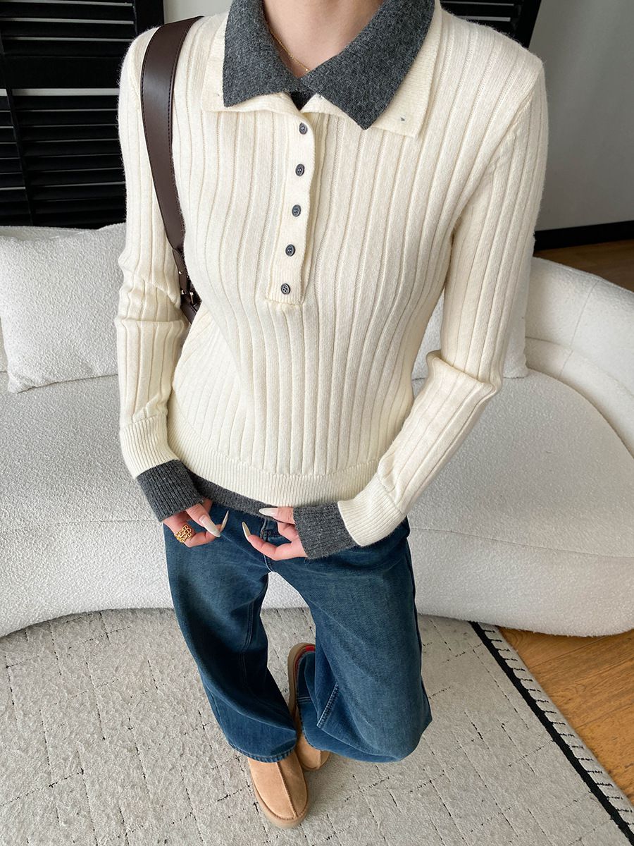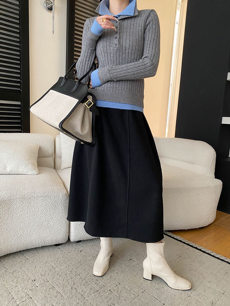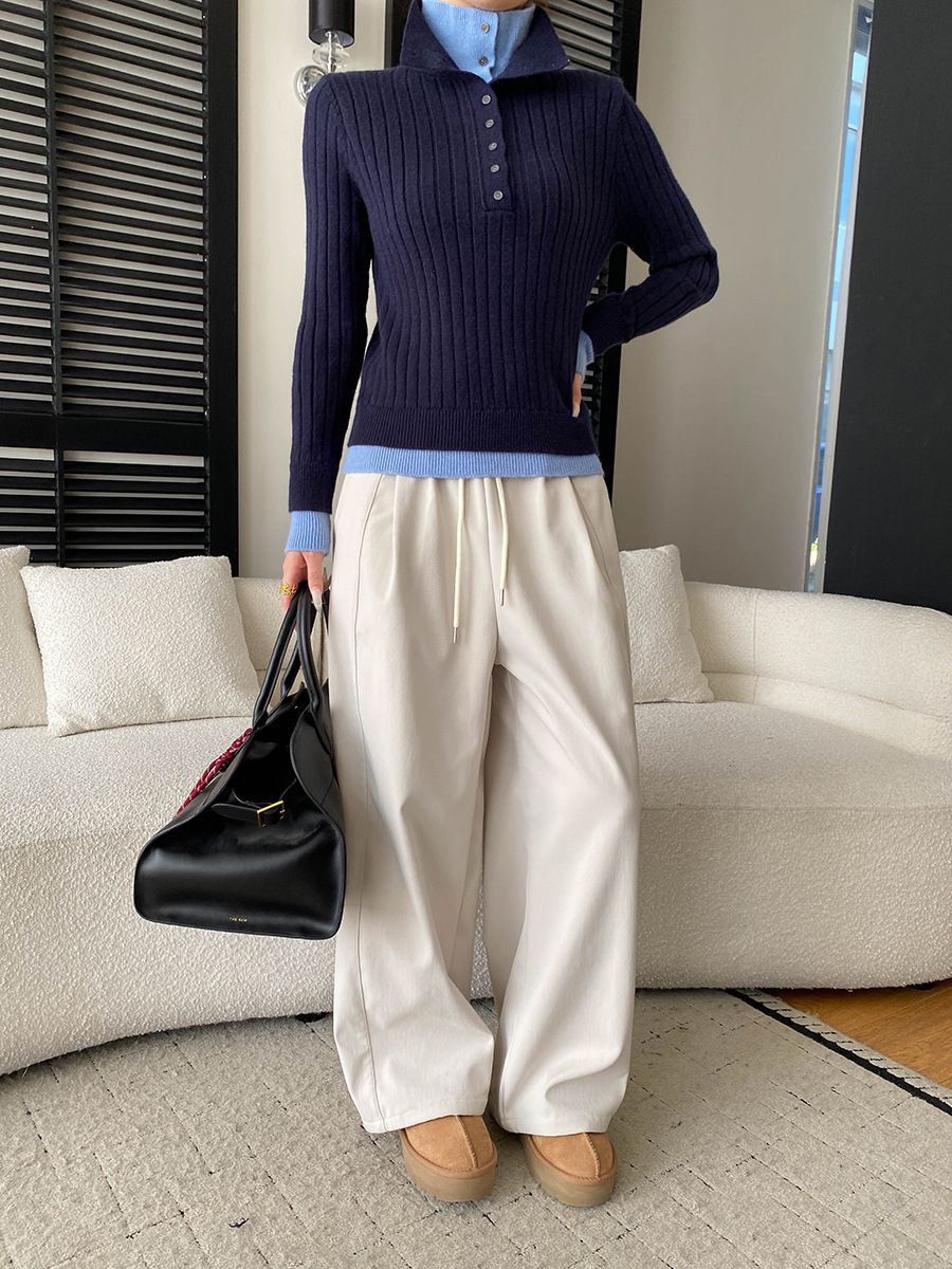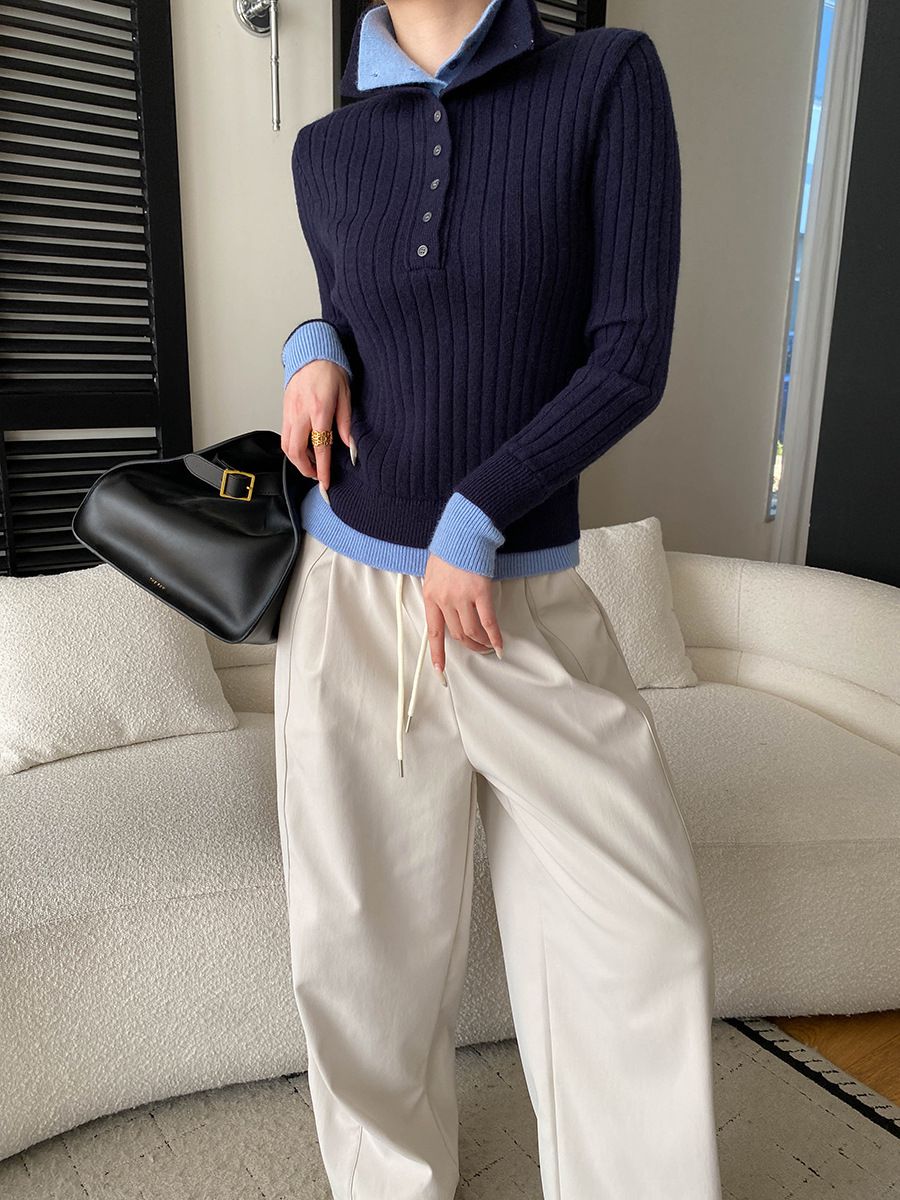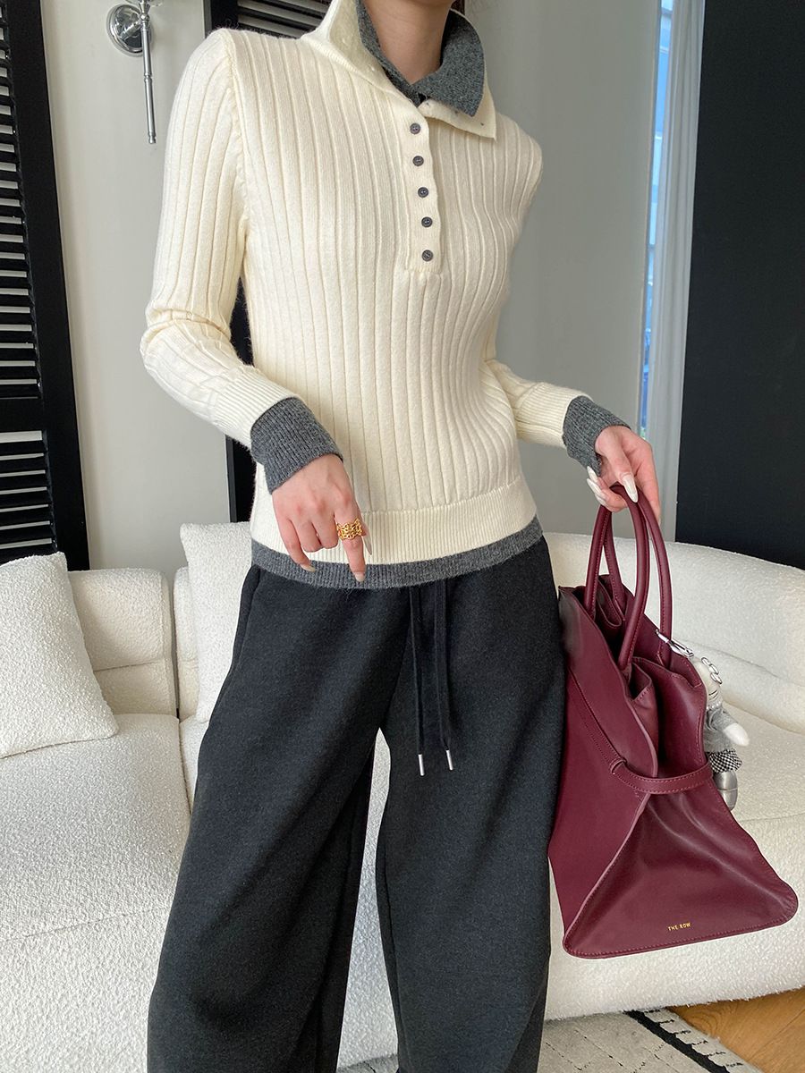 假兩件拼接/坑條面料/雙層領/立領.高領/半開襟排釦領 - 休閒居家簡約百搭素面雙層領針織衫針織上衣長袖上衣奶白色淺灰色深灰色深藍色