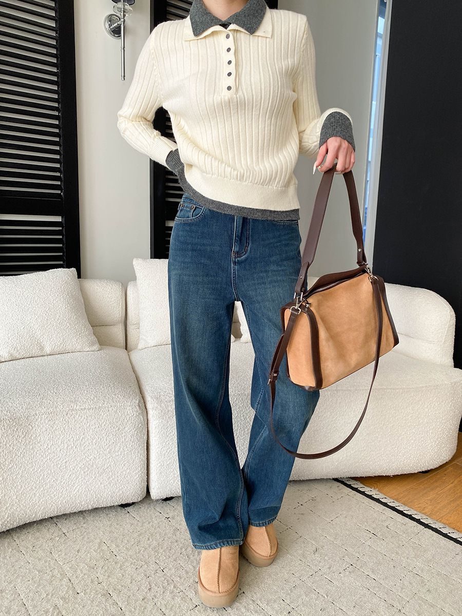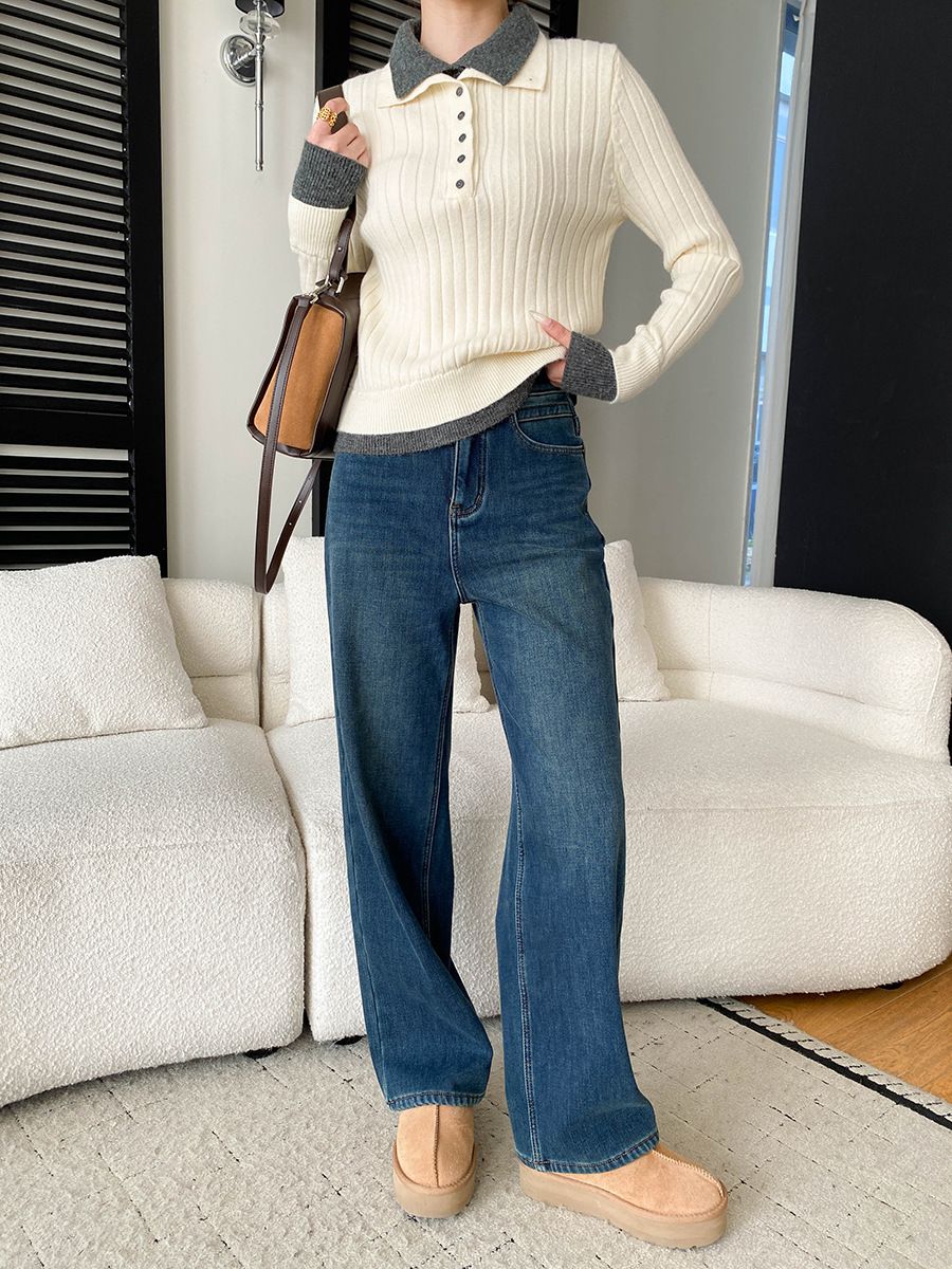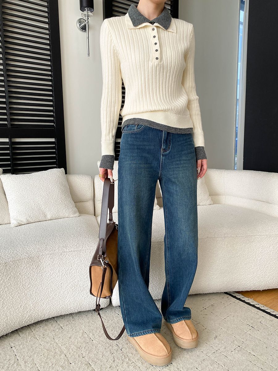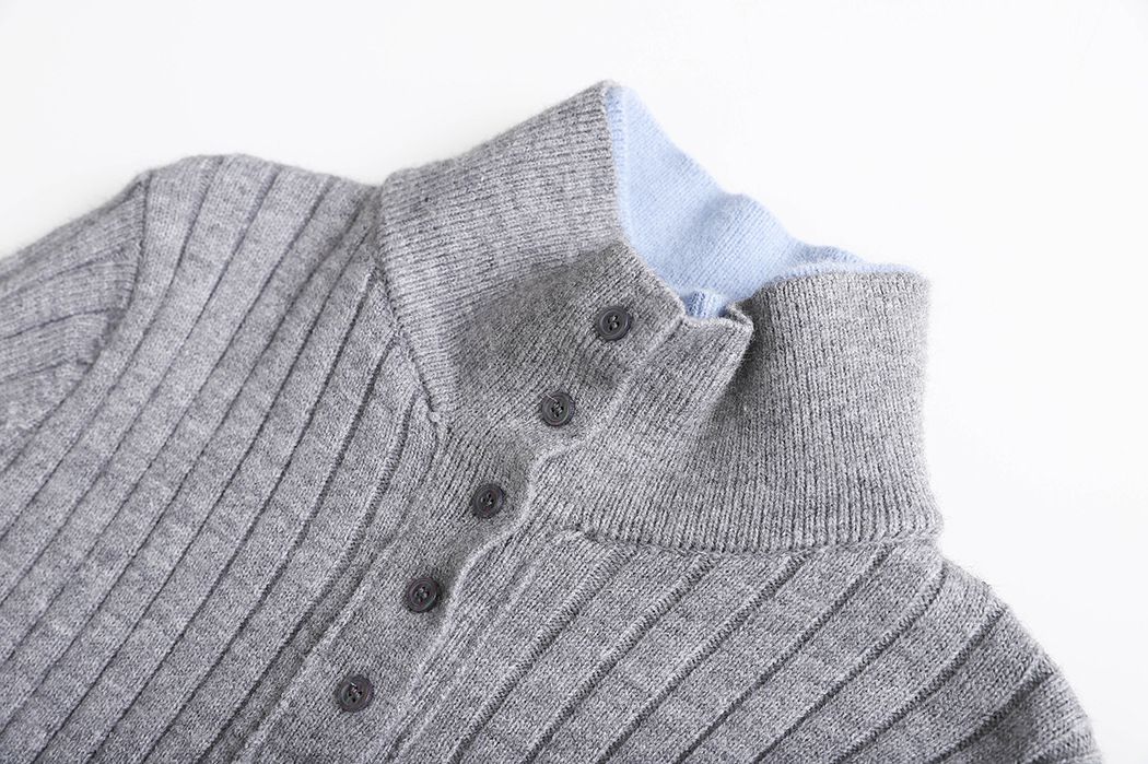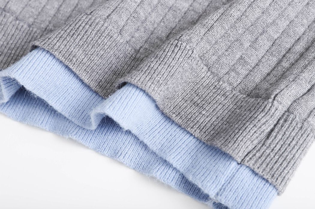 假兩件拼接/坑條面料/雙層領/立領.高領/半開襟排釦領 - 休閒居家簡約百搭素面雙層領針織衫針織上衣長袖上衣奶白色淺灰色深灰色深藍色