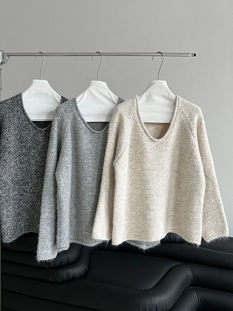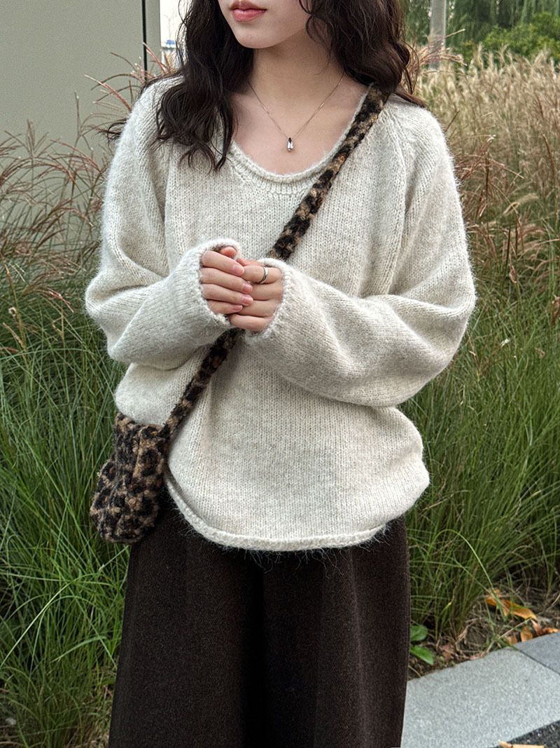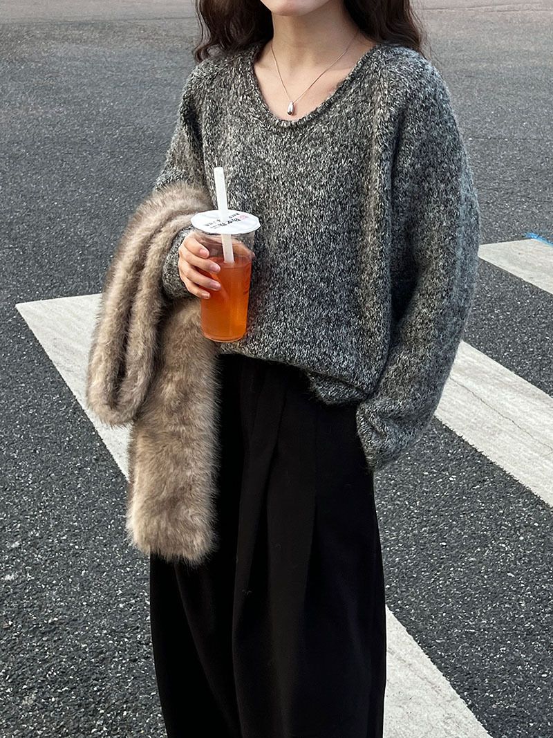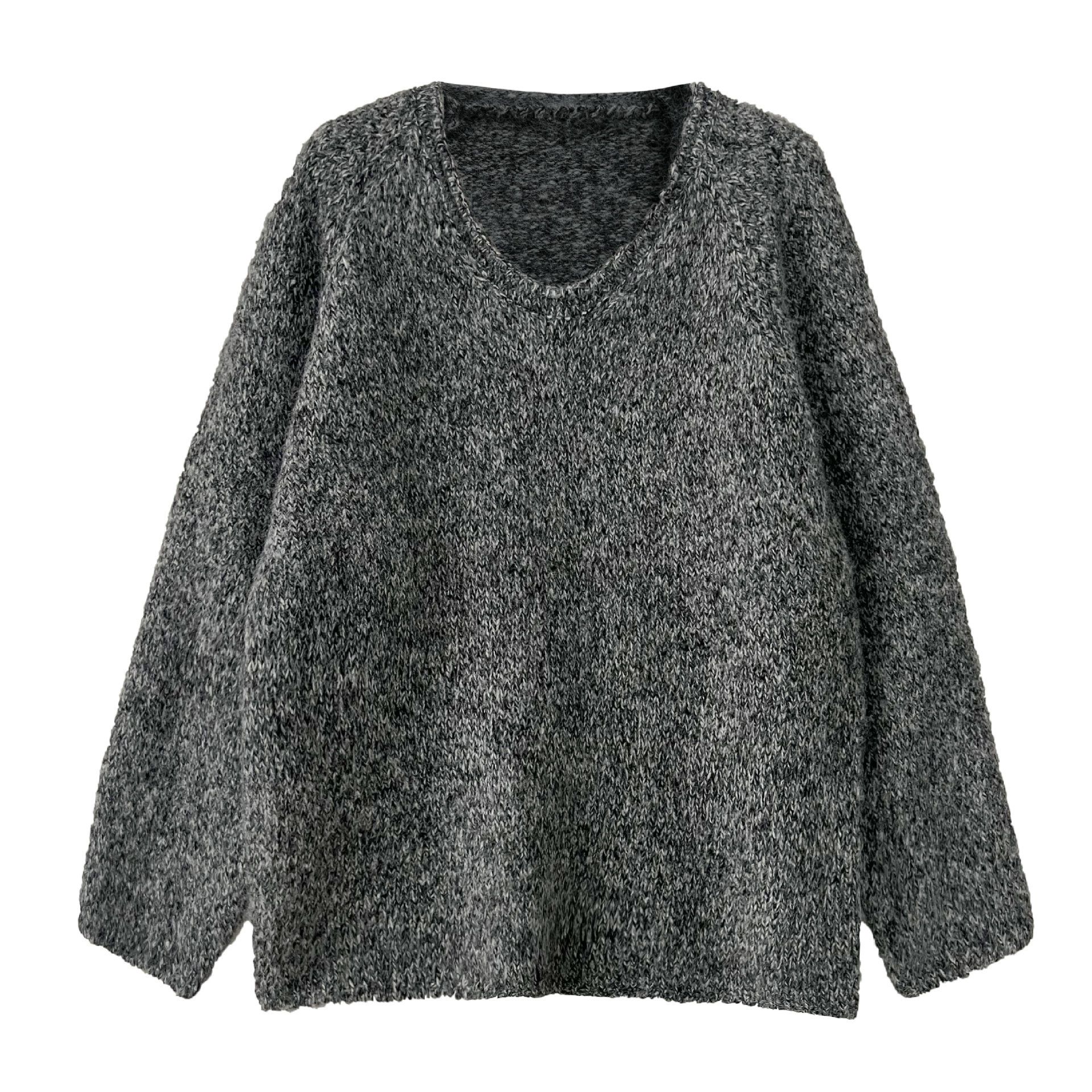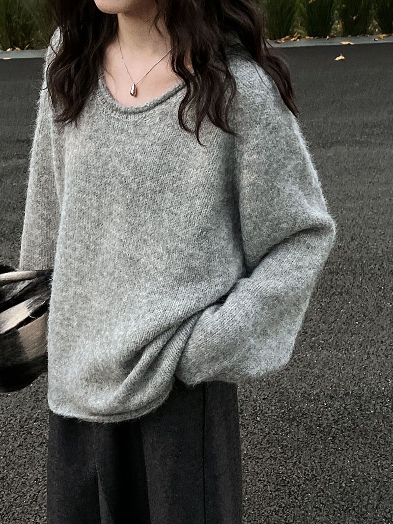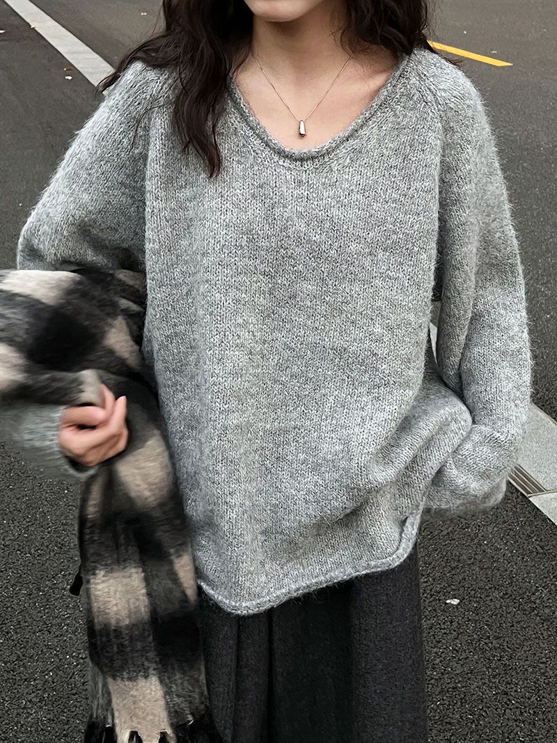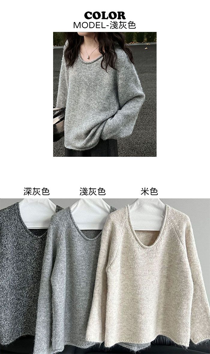 慵懶毛衣/鉤針編織/V領U領/連肩袖/混羊毛上衣/寬鬆版型 - 休閒居家簡約百搭素面混羊毛V領上衣寬鬆大尺碼上衣長袖上衣針織衫針織上衣米色淺灰色深灰色