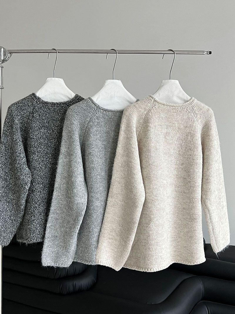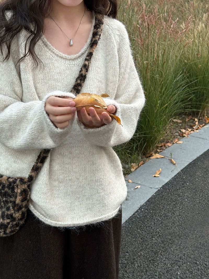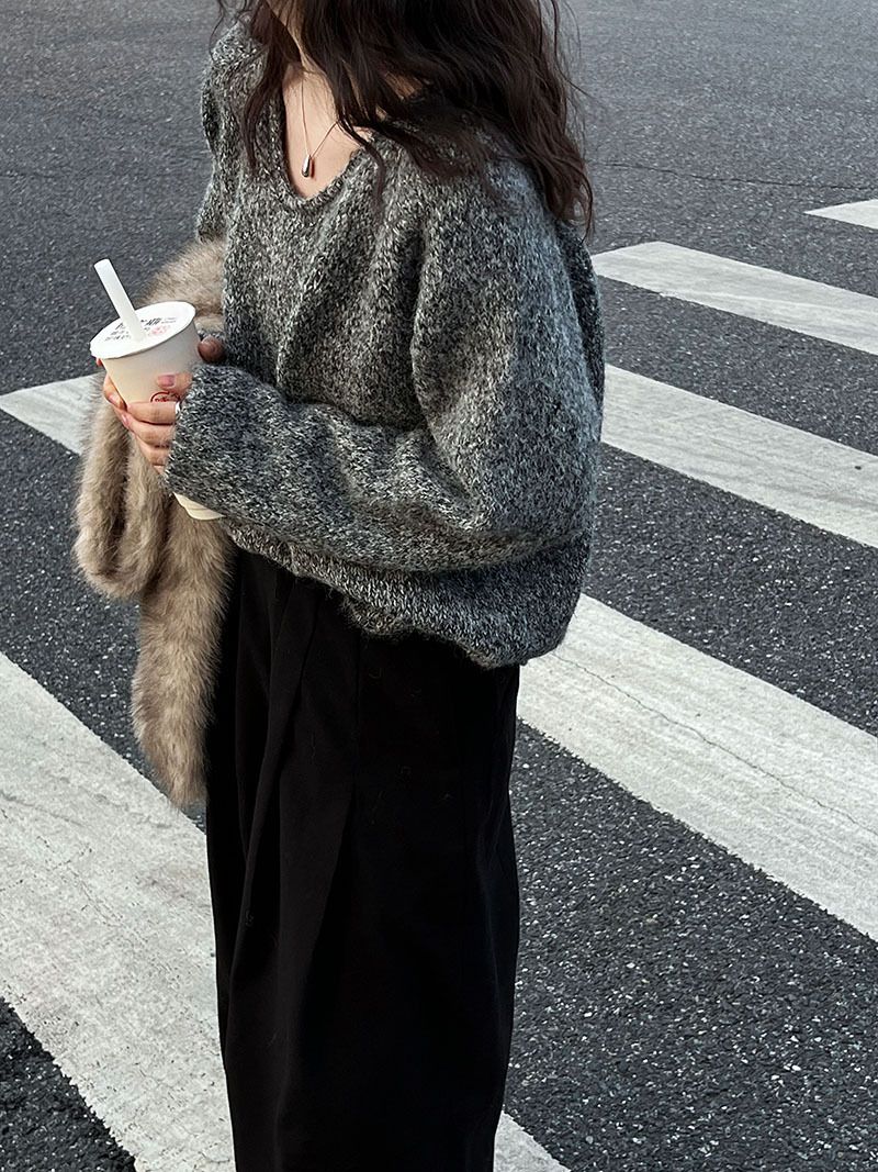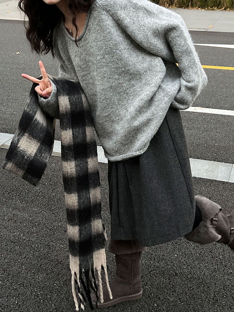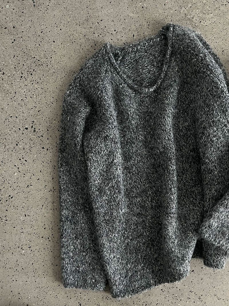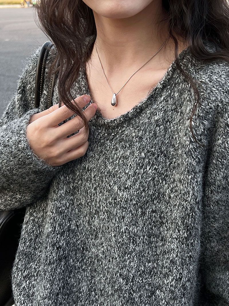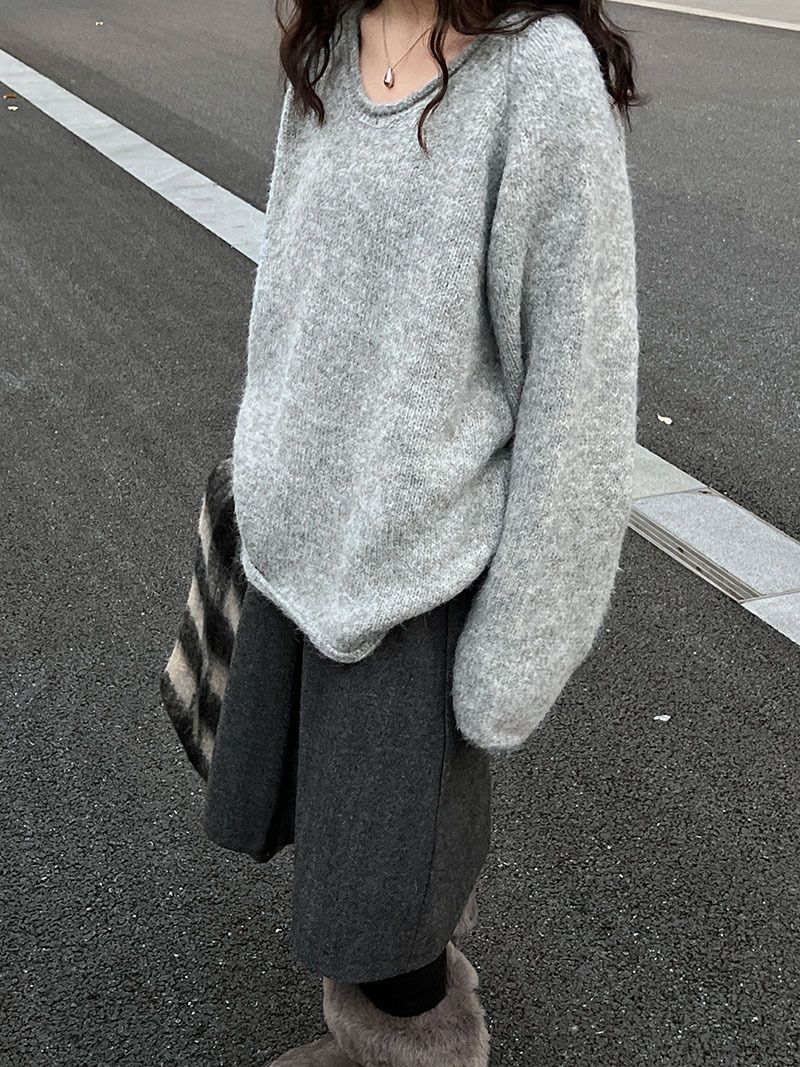 慵懶毛衣/鉤針編織/V領U領/連肩袖/混羊毛上衣/寬鬆版型 - 休閒居家簡約百搭素面混羊毛V領上衣寬鬆大尺碼上衣長袖上衣針織衫針織上衣米色淺灰色深灰色