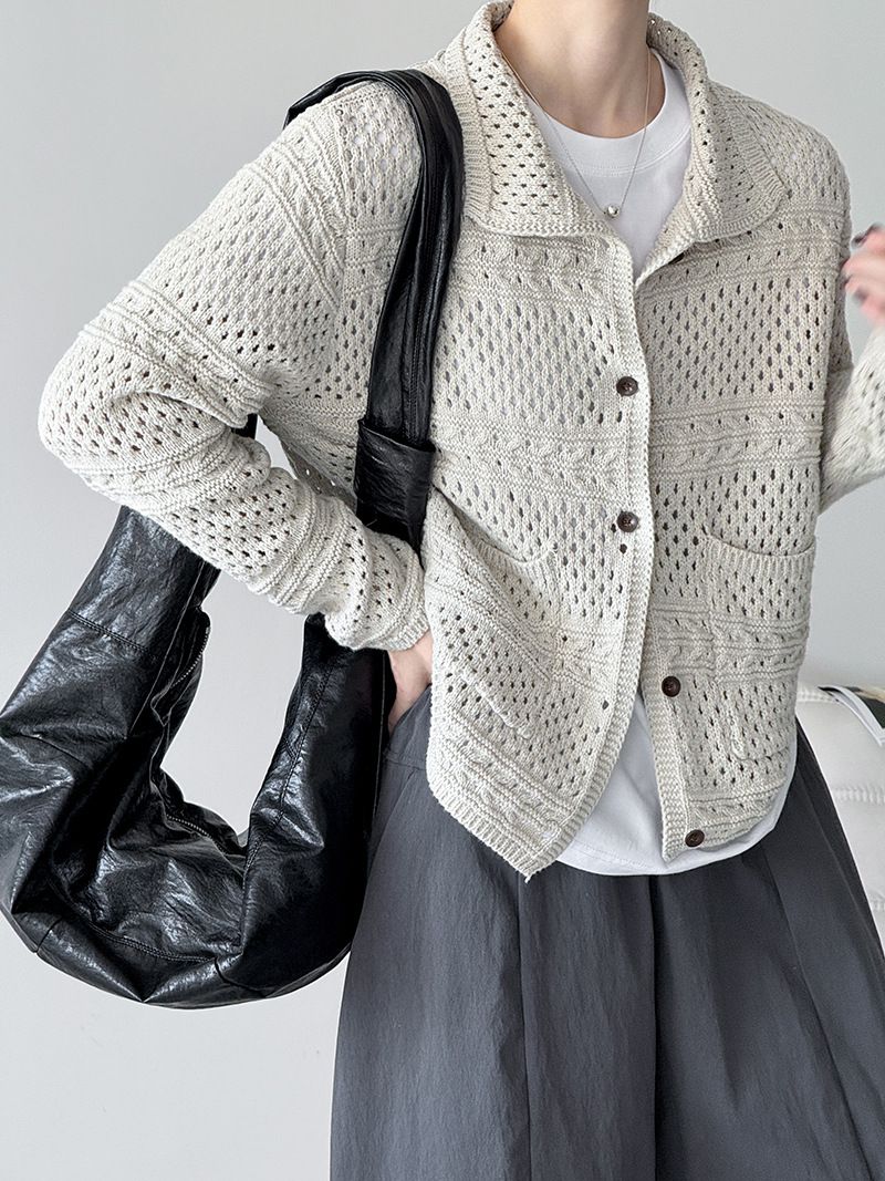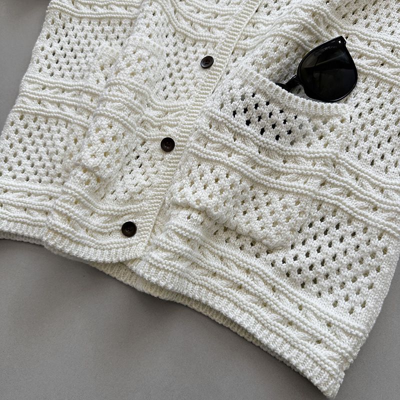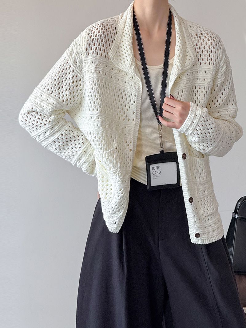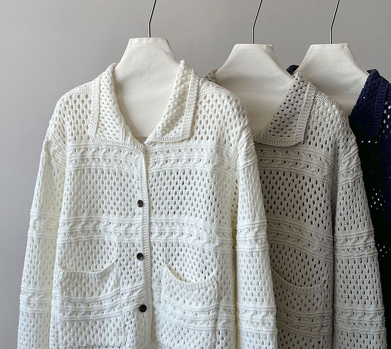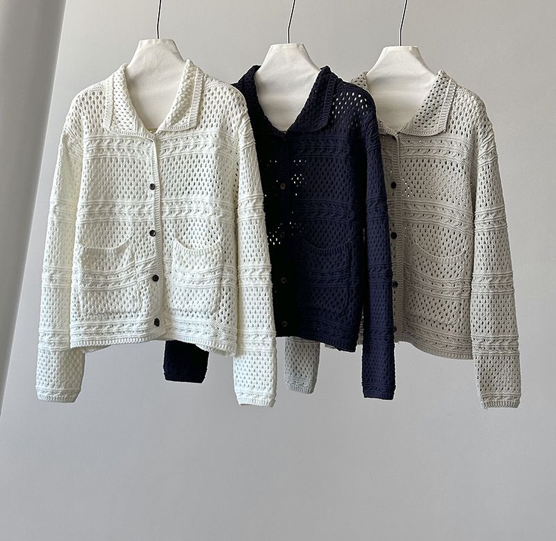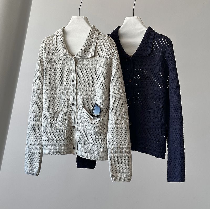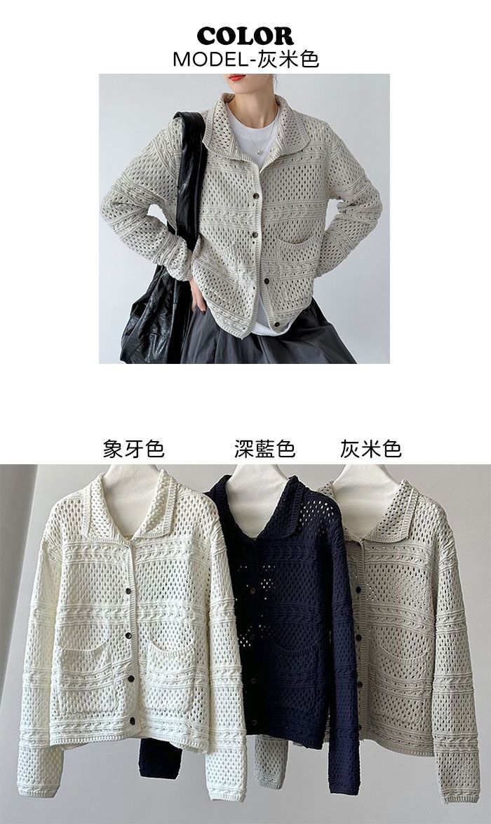 【C60076】品牌 縷空雕花針織衫-素面翻領開襟排釦雙口袋長袖外套