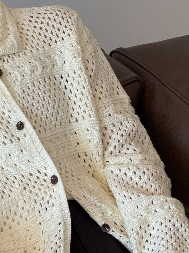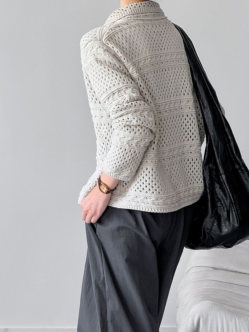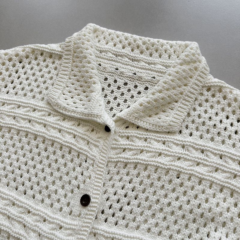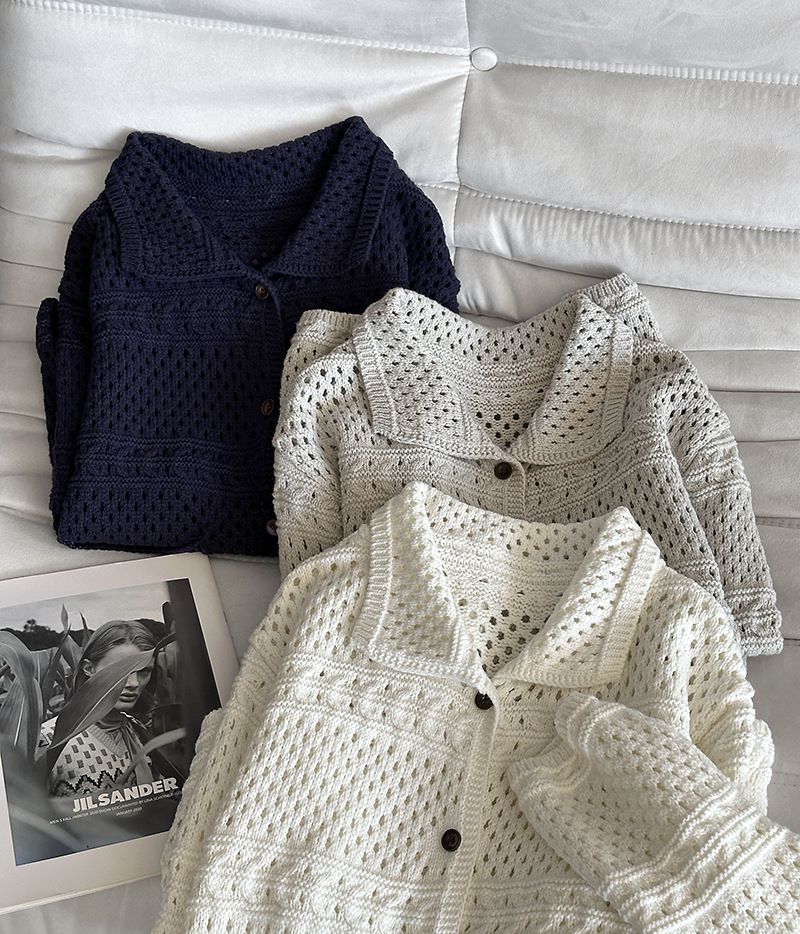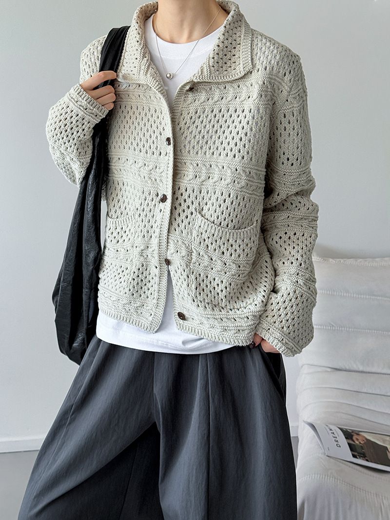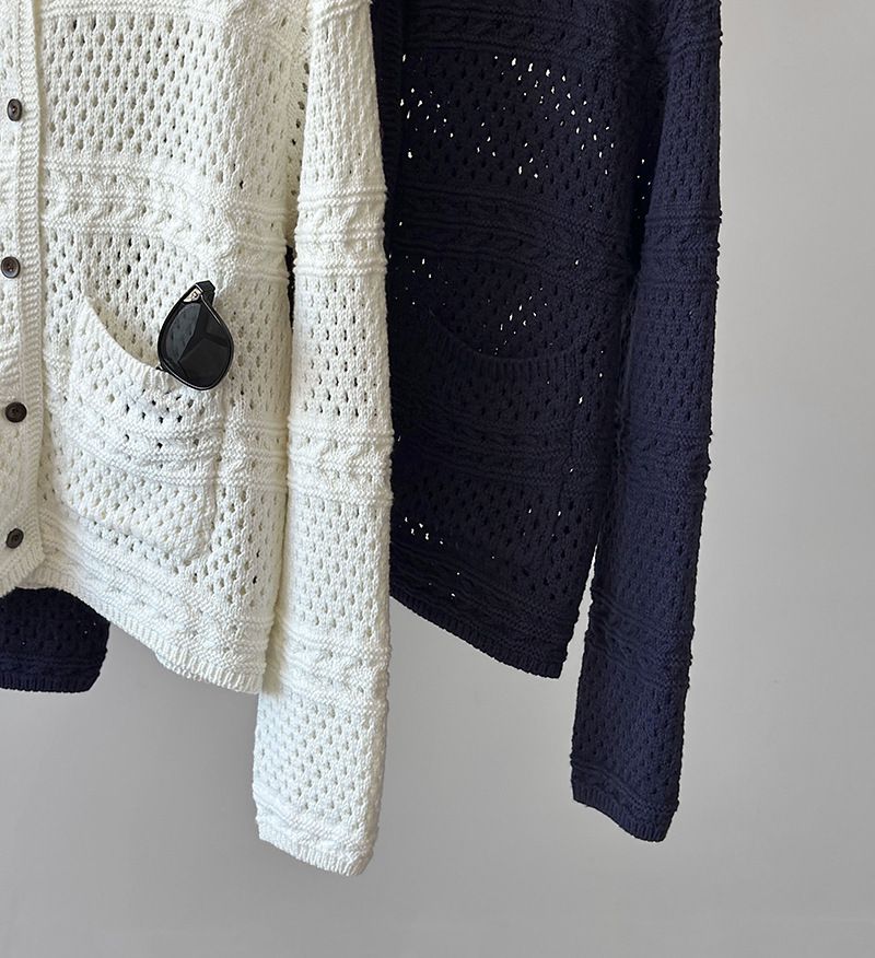 【C60076】品牌 縷空雕花針織衫-素面翻領開襟排釦雙口袋長袖外套