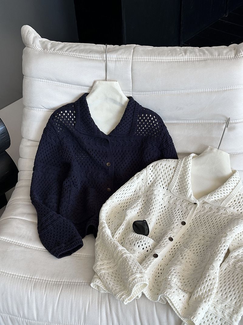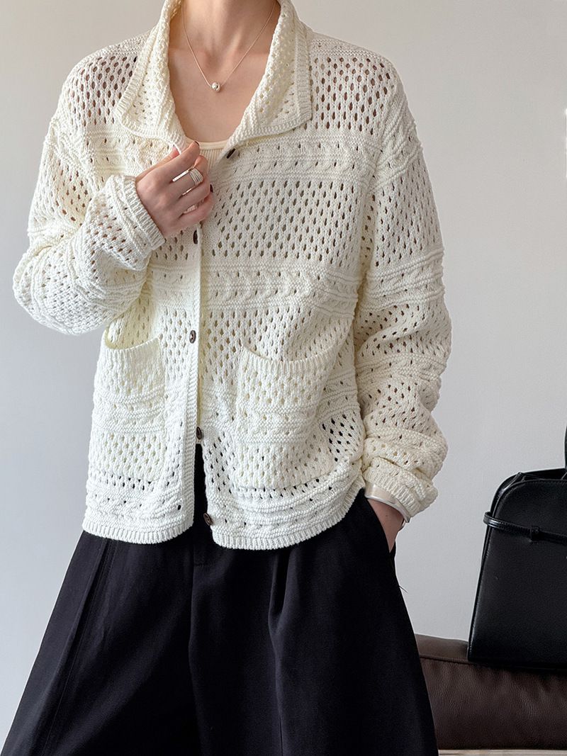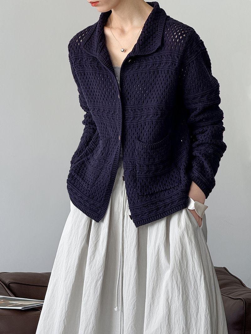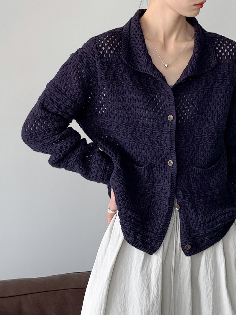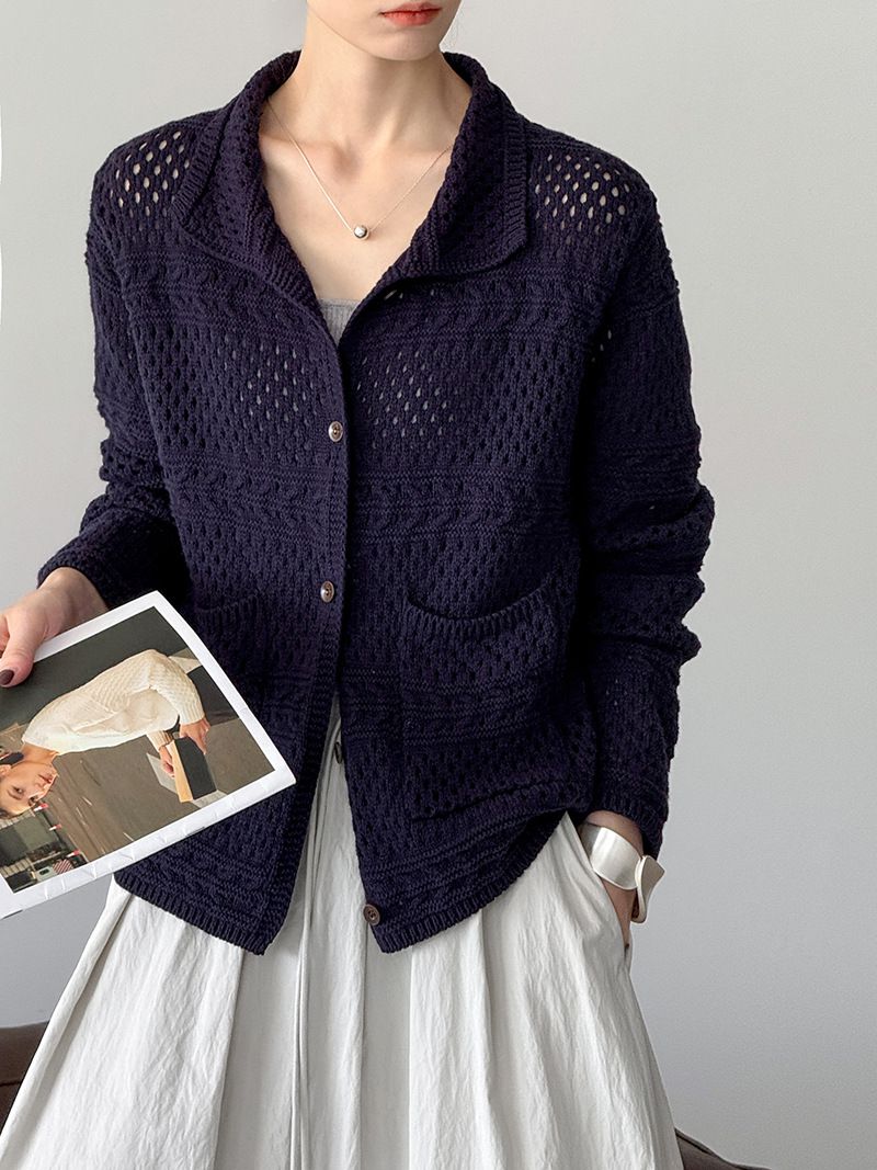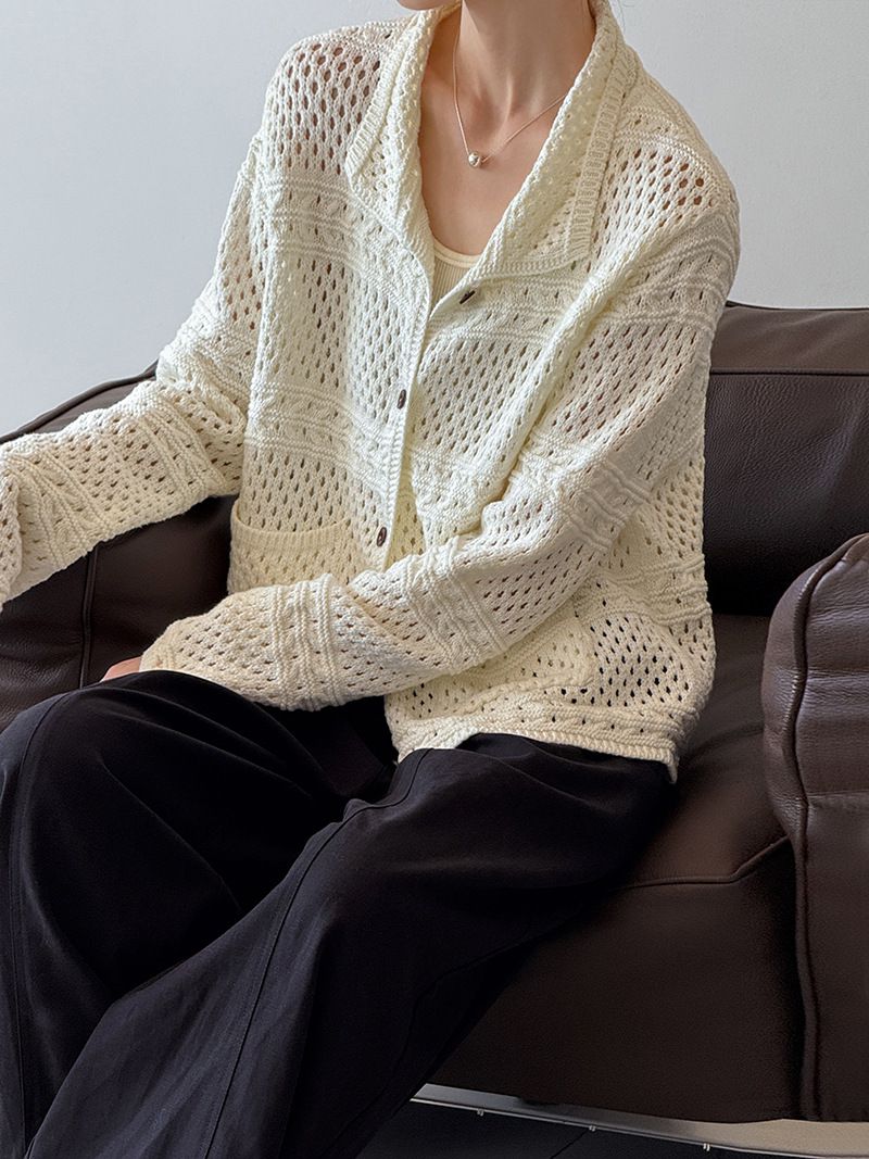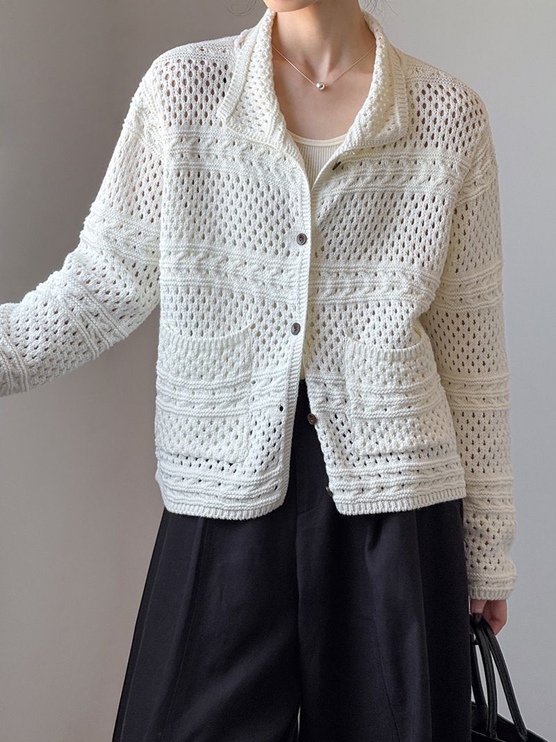 粗鉤針編織/洞洞裝/縷空蕾絲雕花/翻領/開襟排釦/雙口袋 - 休閒居家渡假婚禮簡約百搭素面縷空雕花針織衫外套長袖外套米色象牙色深藍色