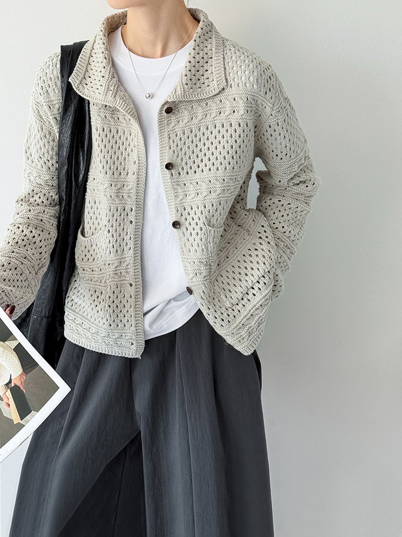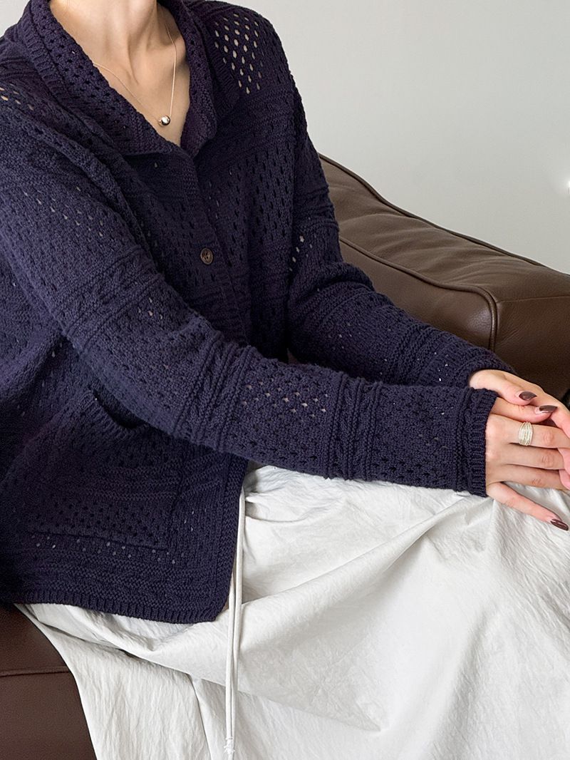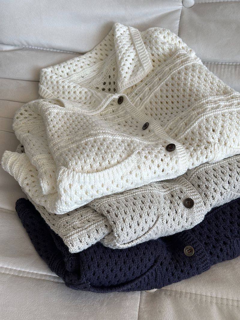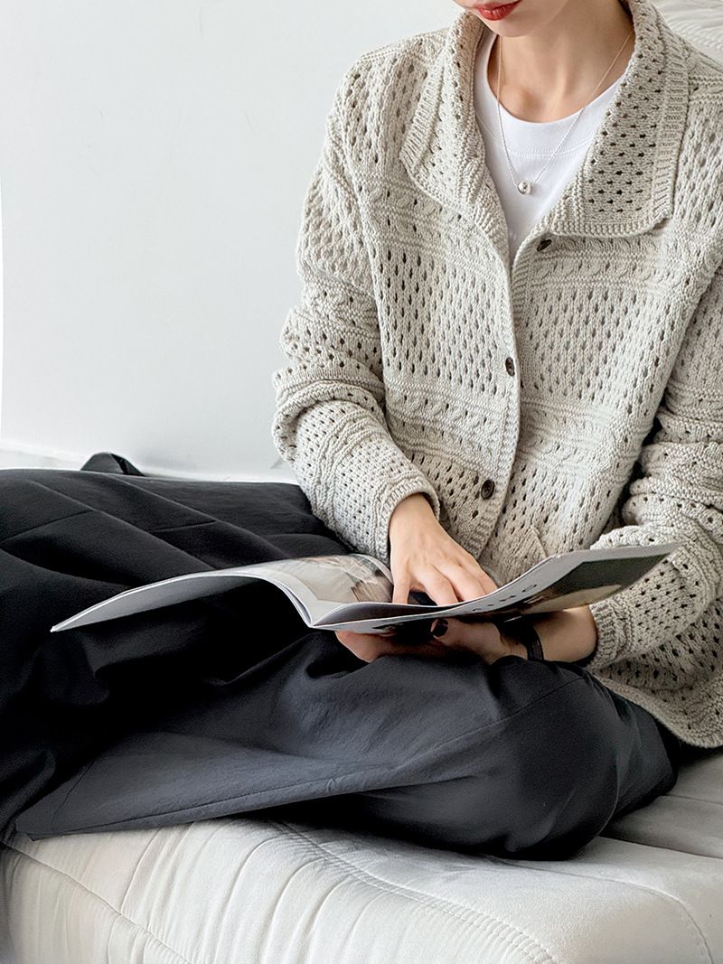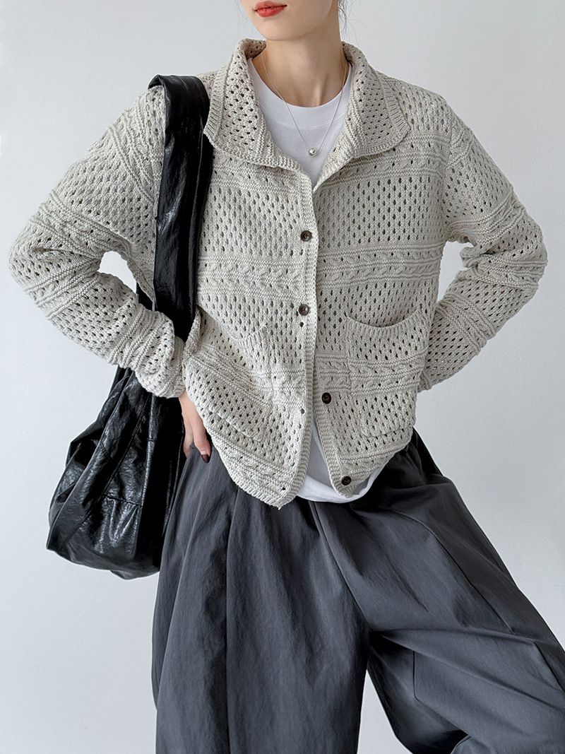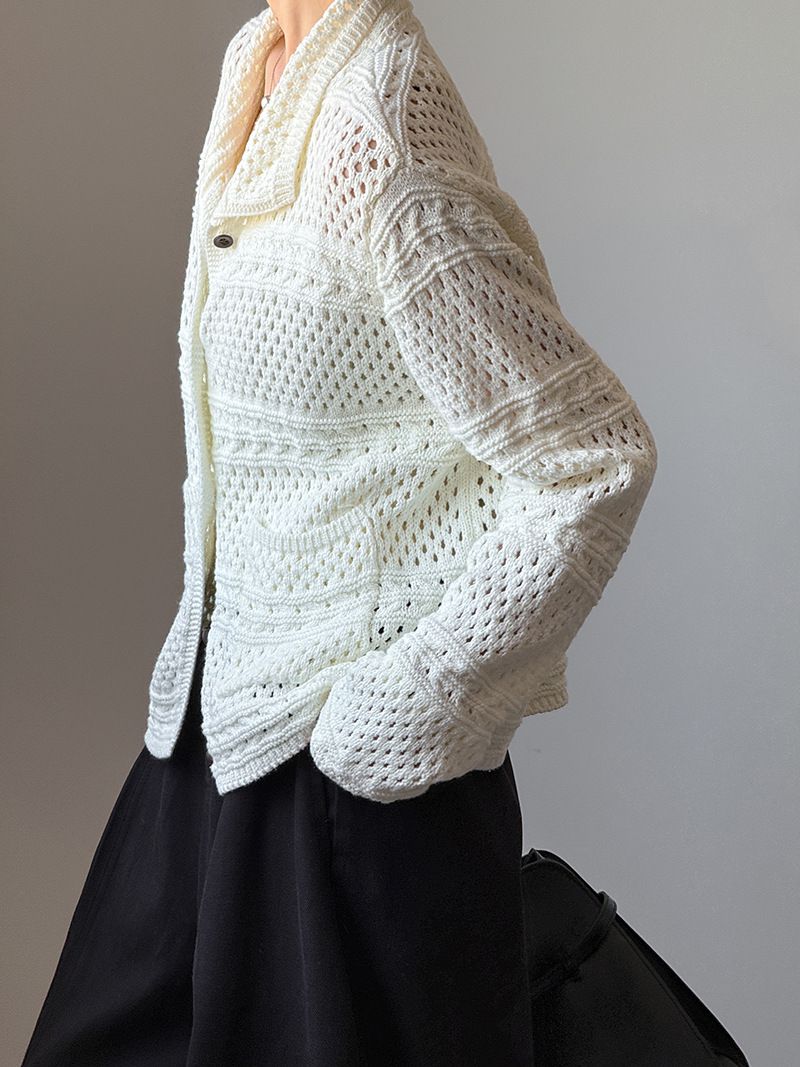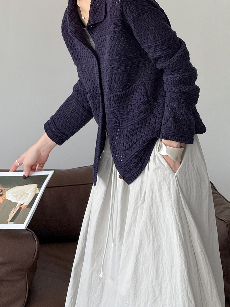 粗鉤針編織/洞洞裝/縷空蕾絲雕花/翻領/開襟排釦/雙口袋 - 休閒居家渡假婚禮簡約百搭素面縷空雕花針織衫外套長袖外套米色象牙色深藍色