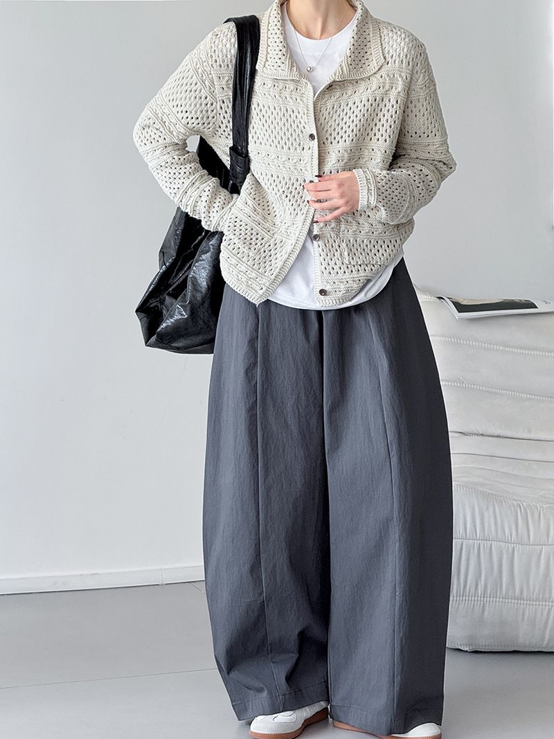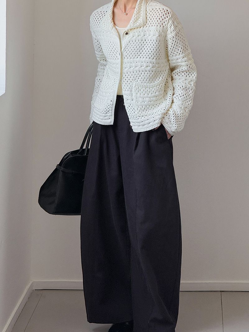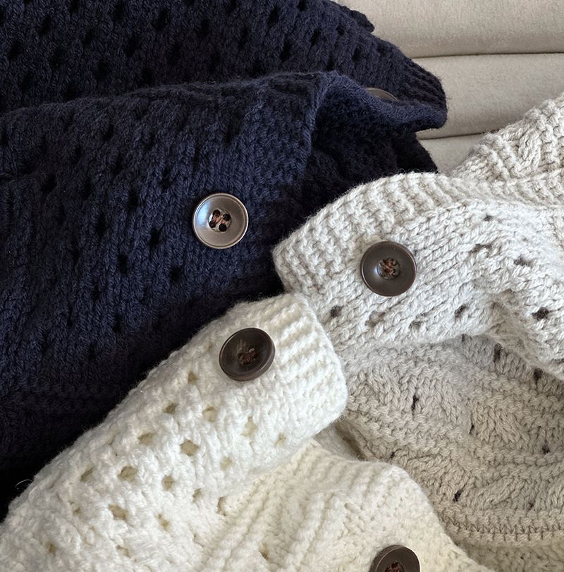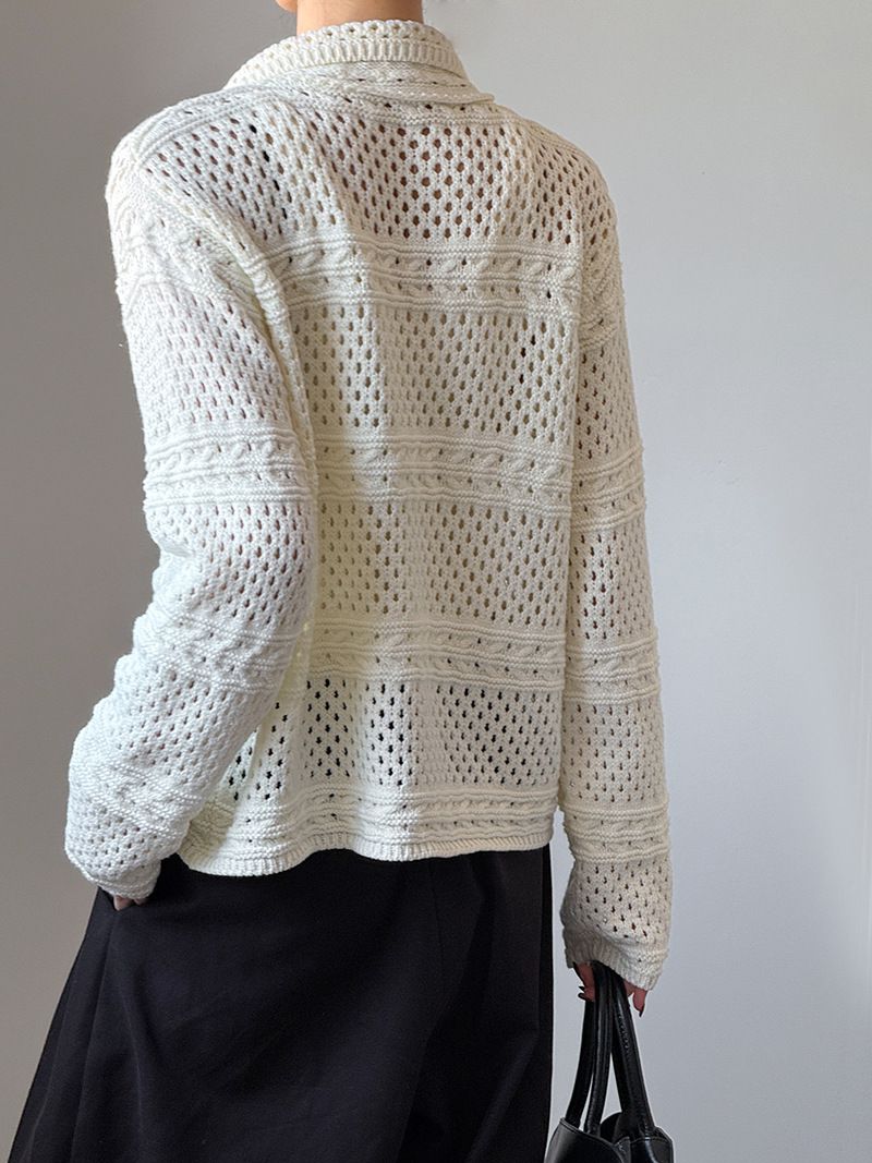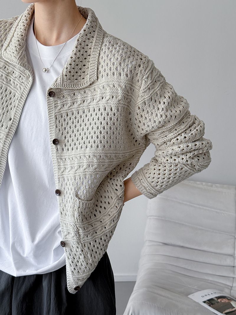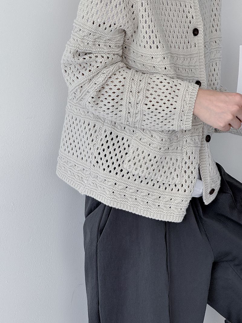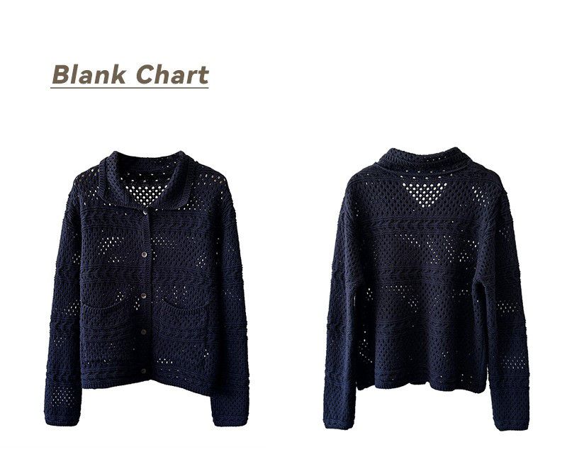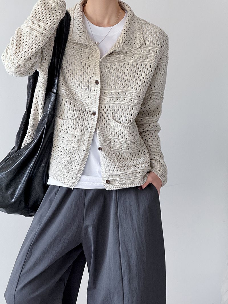 粗鉤針編織/洞洞裝/縷空蕾絲雕花/翻領/開襟排釦/雙口袋 - 休閒居家渡假婚禮簡約百搭素面縷空雕花針織衫外套長袖外套米色象牙色深藍色