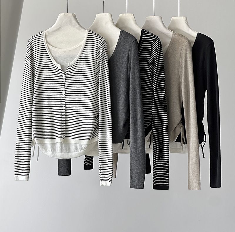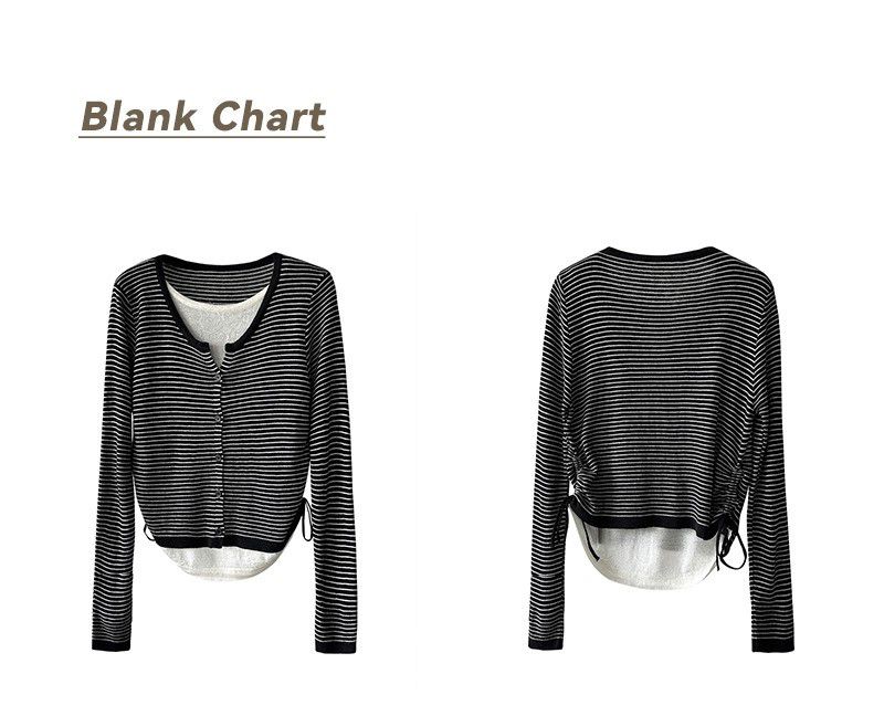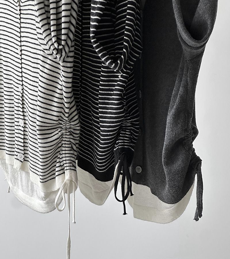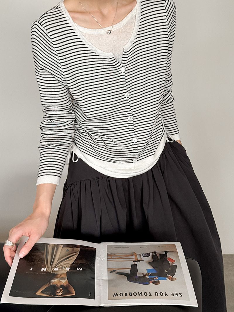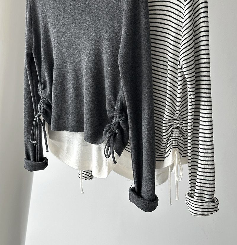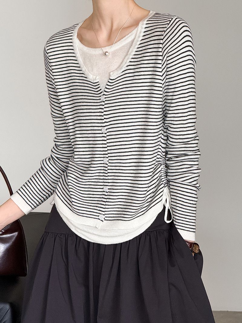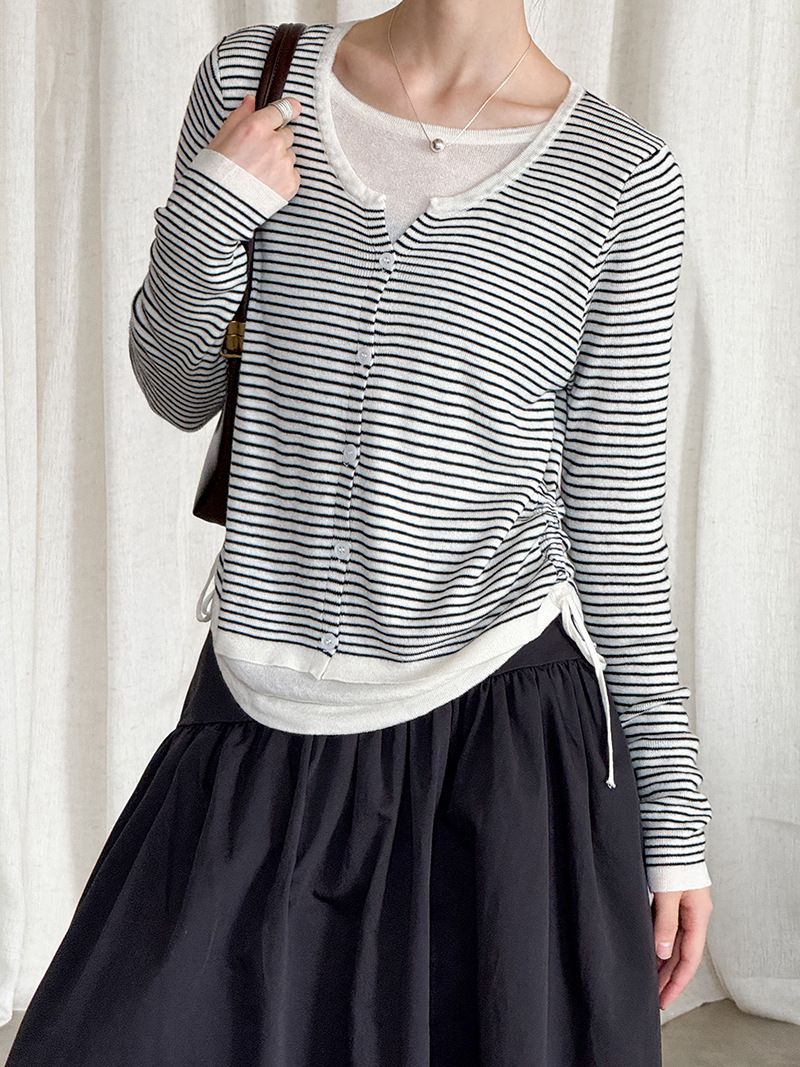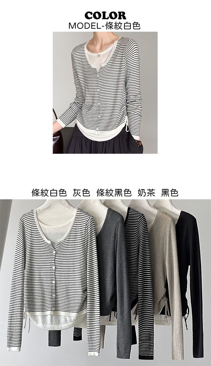兩種花色/假兩件拼接/條紋素面/側邊抽繩收腰/抽繩抓皺/V領U領/排釦造型(可開)/弧形下襬 - 閒居家簡約百搭素面條紋上衣條紋針織衫假兩件針織衫針織上衣長袖上衣條紋白色條紋黑色灰色黑色奶茶色