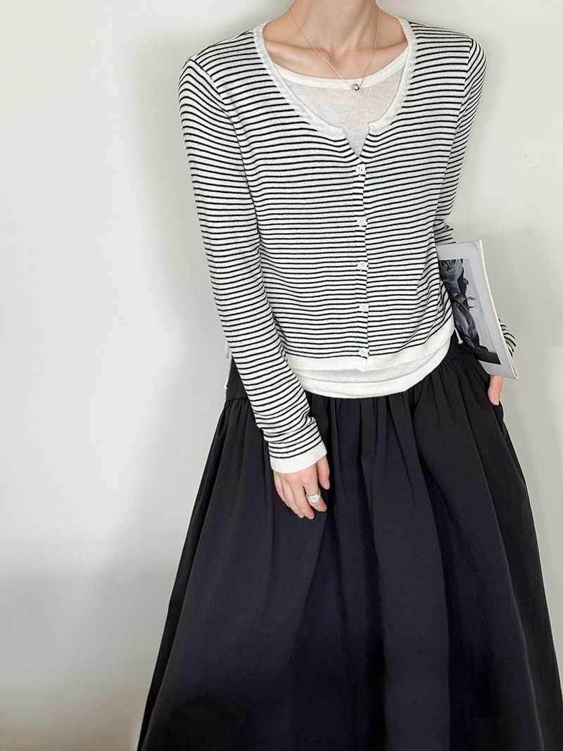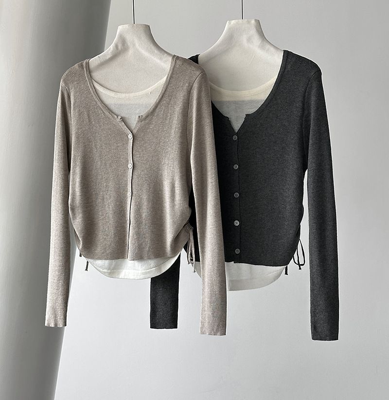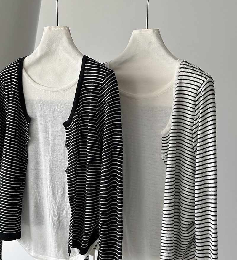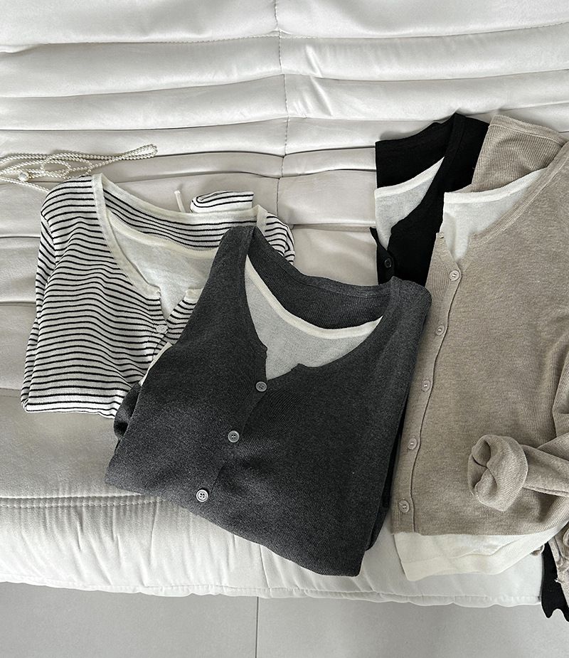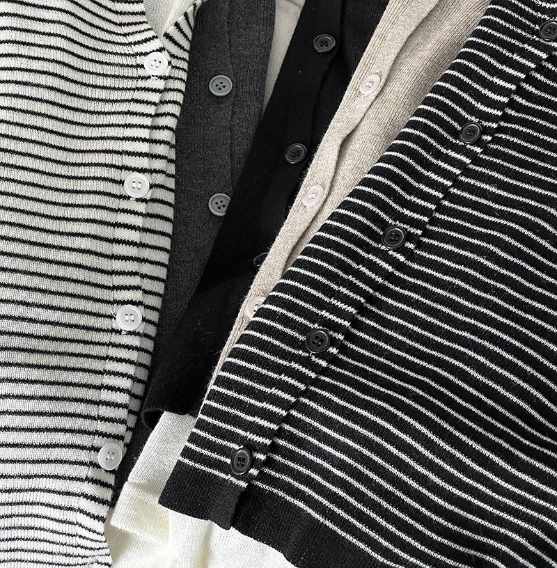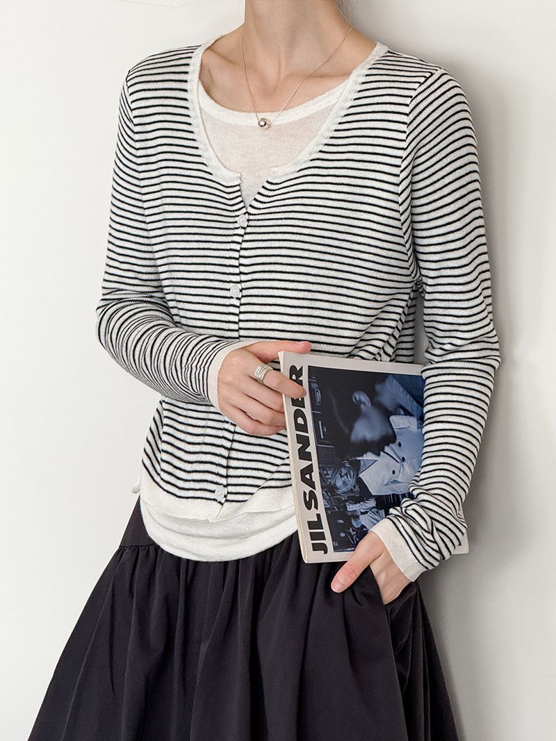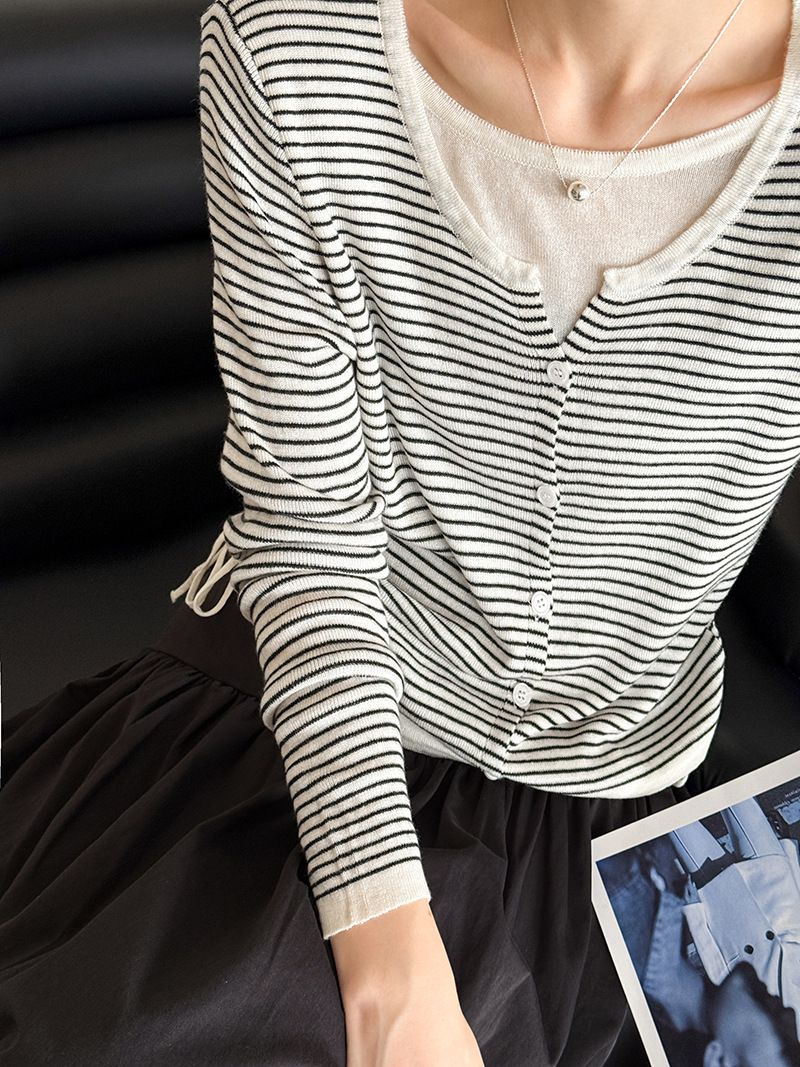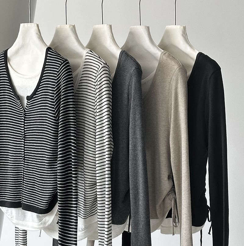 兩種花色/假兩件拼接/條紋素面/側邊抽繩收腰/抽繩抓皺/V領U領/排釦造型(可開)/弧形下襬 - 閒居家簡約百搭素面條紋上衣條紋針織衫假兩件針織衫針織上衣長袖上衣條紋白色條紋黑色灰色黑色奶茶色