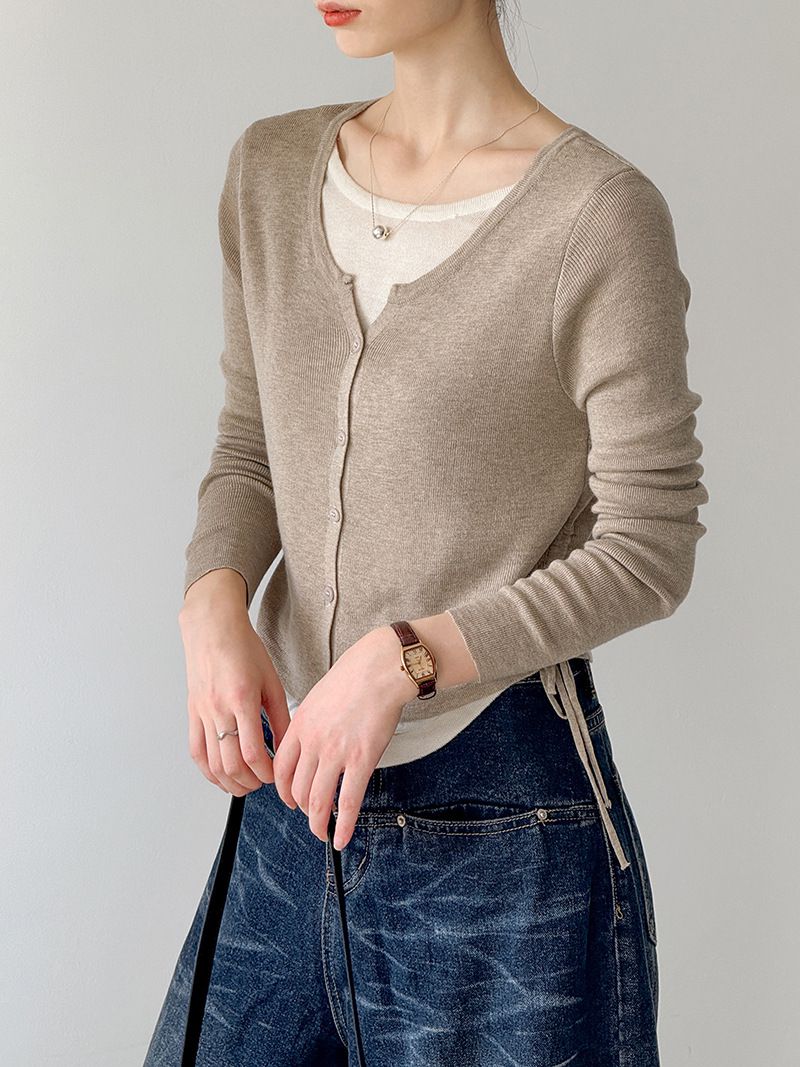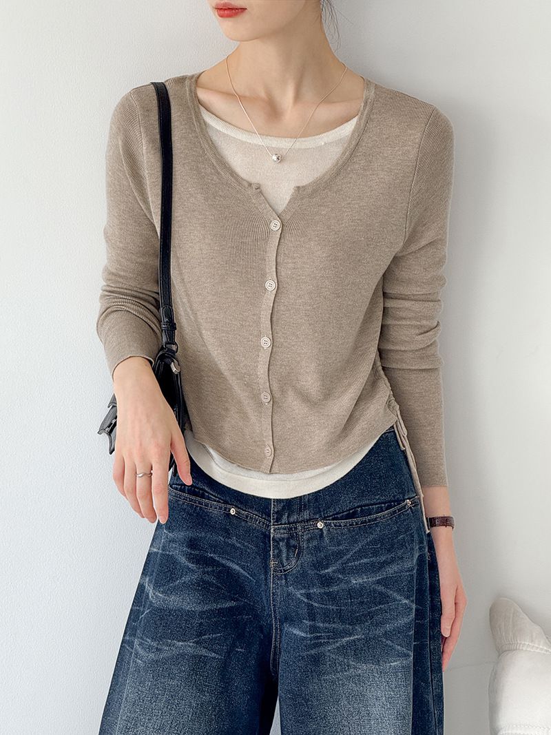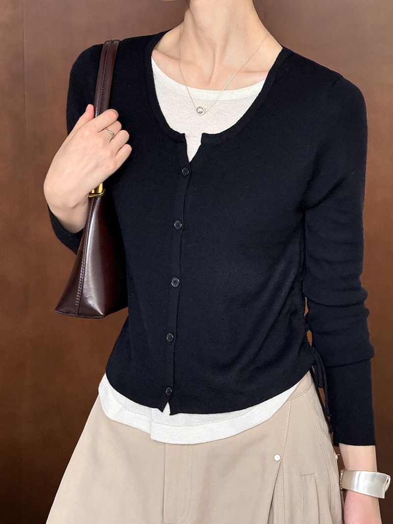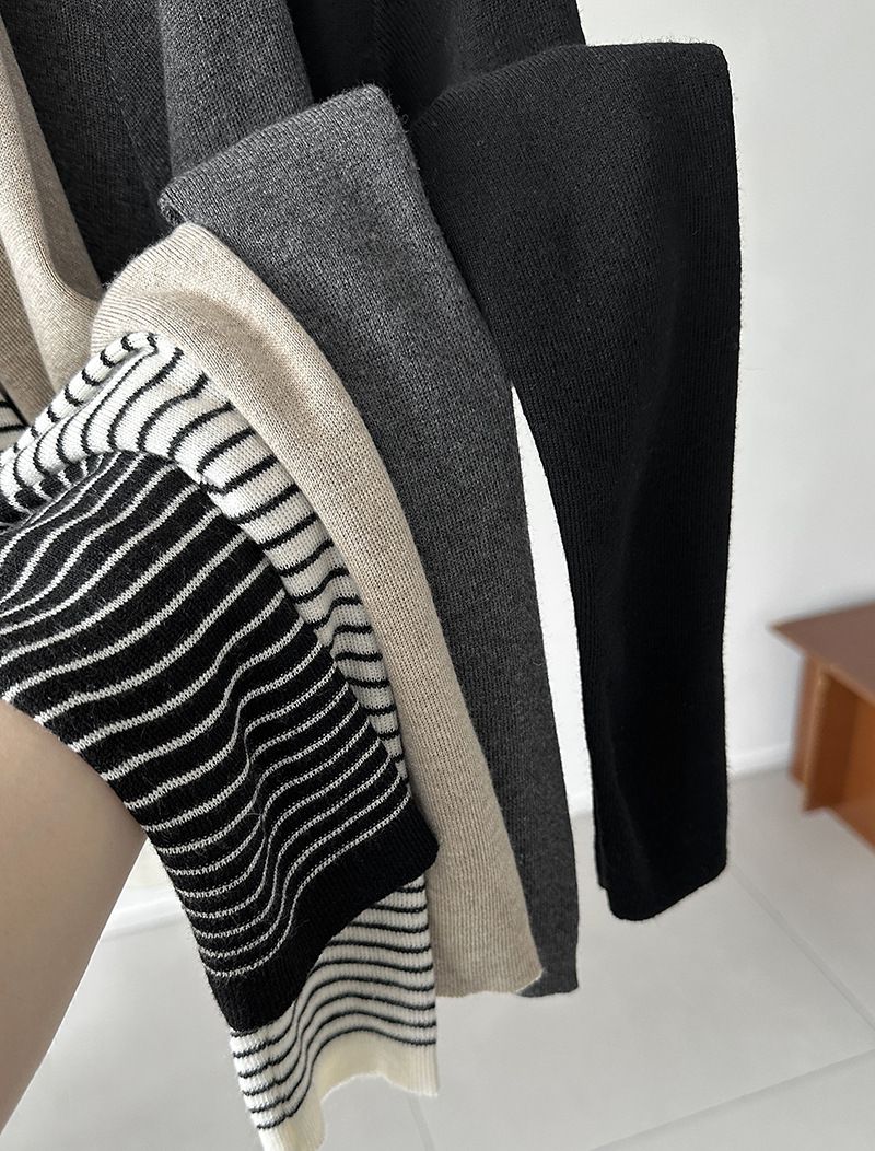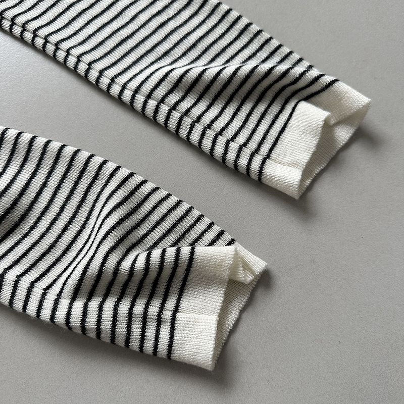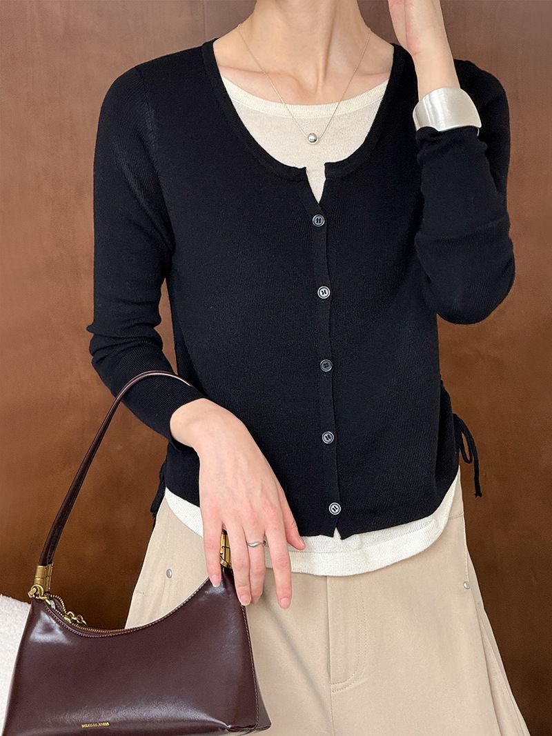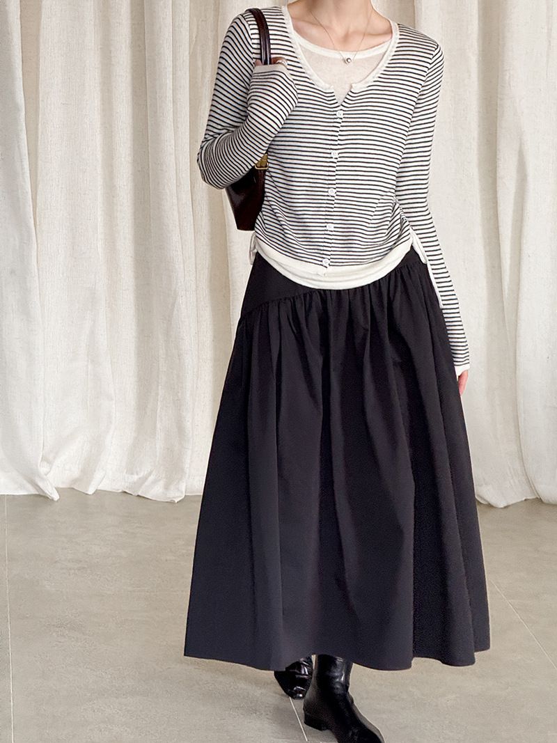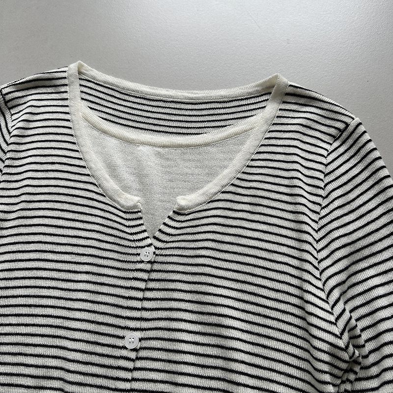 兩種花色/假兩件拼接/條紋素面/側邊抽繩收腰/抽繩抓皺/V領U領/排釦造型(可開)/弧形下襬 - 閒居家簡約百搭素面條紋上衣條紋針織衫假兩件針織衫針織上衣長袖上衣條紋白色條紋黑色灰色黑色奶茶色