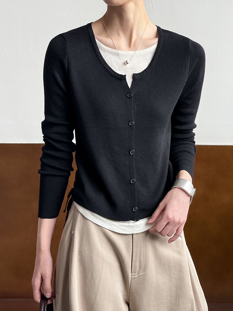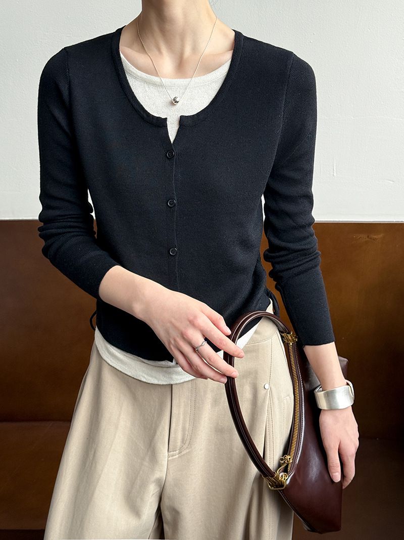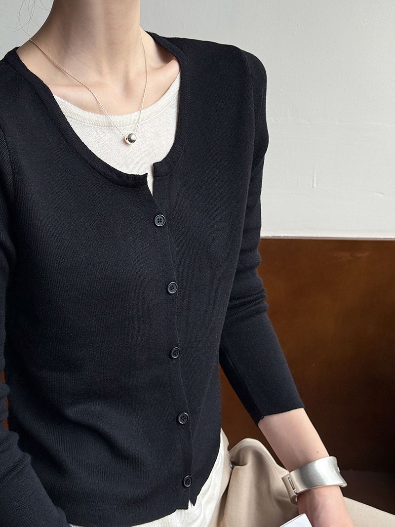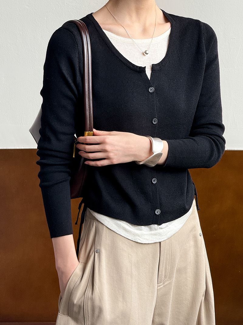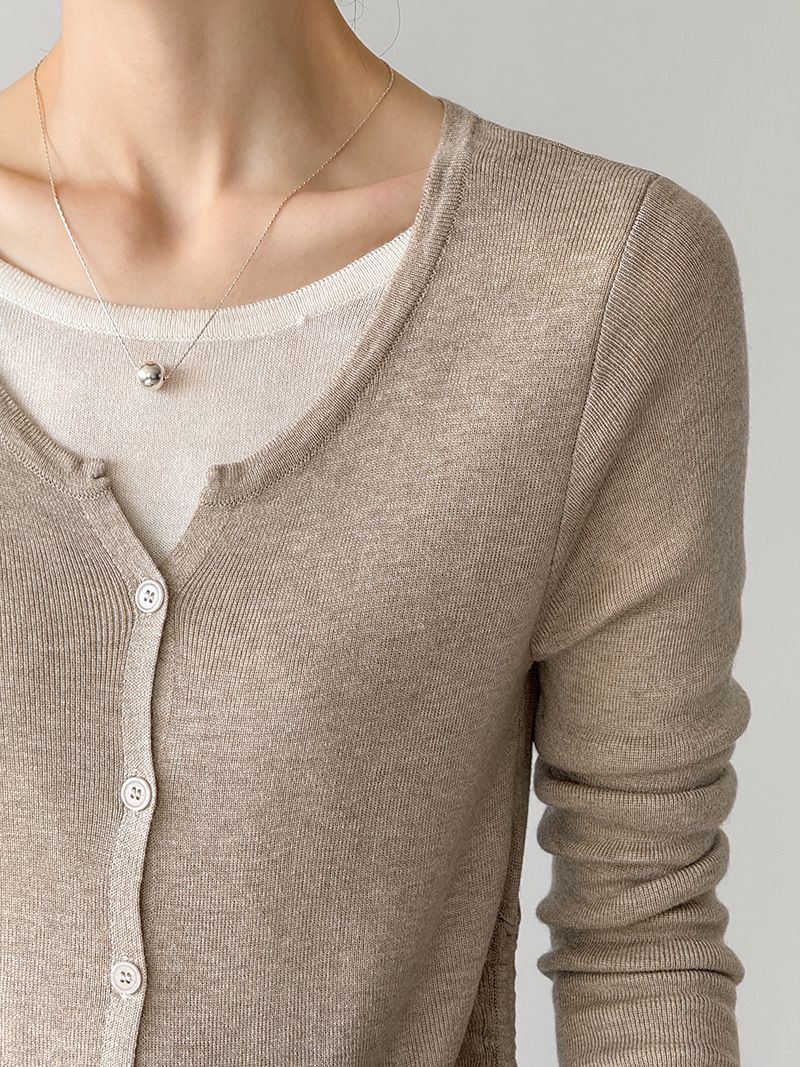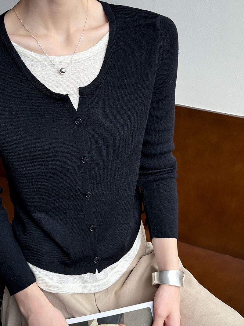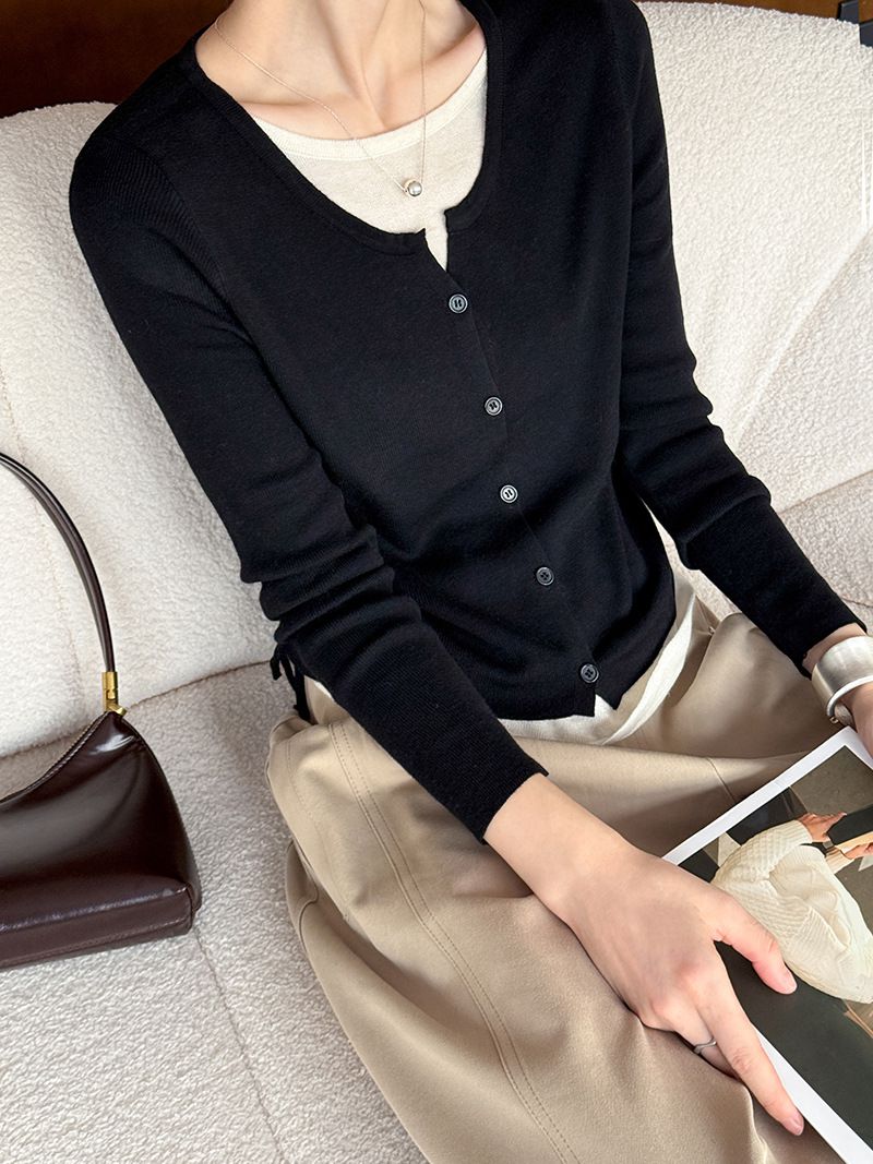 兩種花色/假兩件拼接/條紋素面/側邊抽繩收腰/抽繩抓皺/V領U領/排釦造型(可開)/弧形下襬 - 閒居家簡約百搭素面條紋上衣條紋針織衫假兩件針織衫針織上衣長袖上衣條紋白色條紋黑色灰色黑色奶茶色