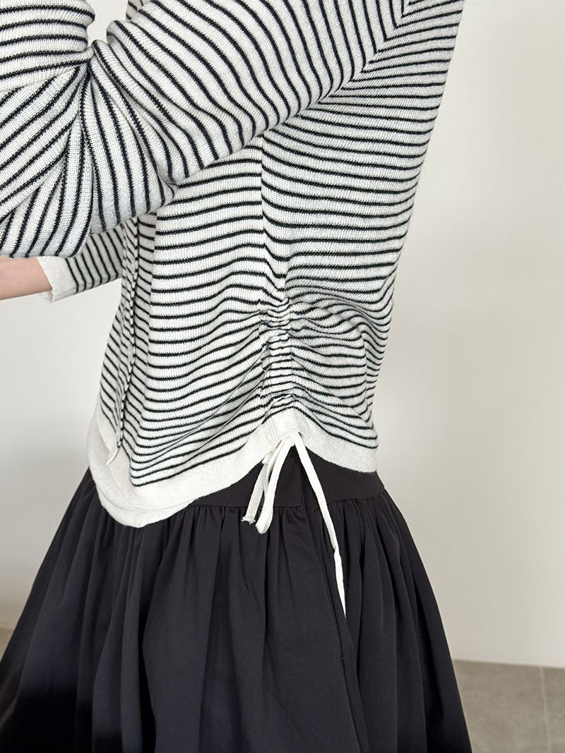 【C60079】品牌 假兩件針織衫-側邊抽繩收腰V領條紋素面長袖上衣★★
