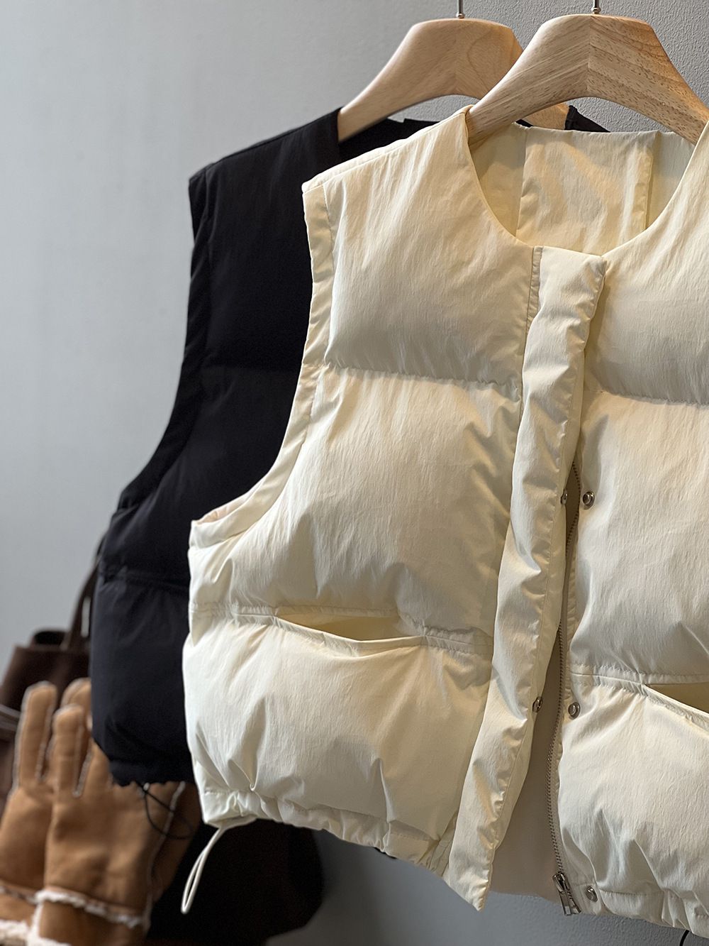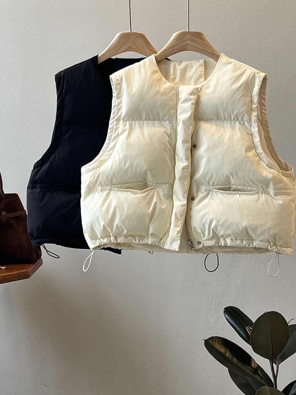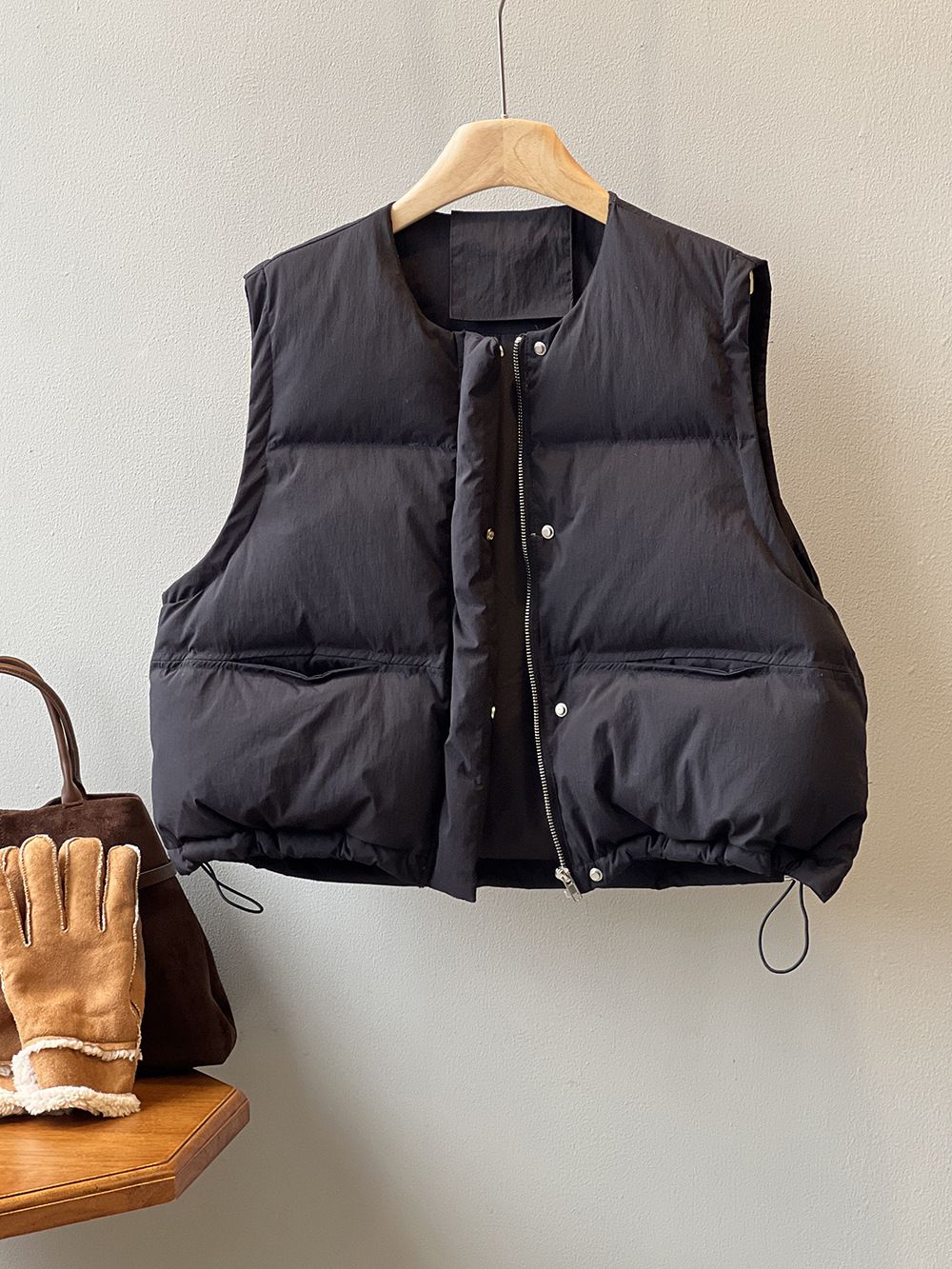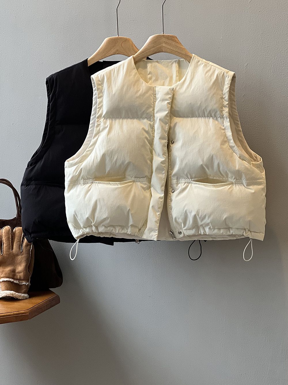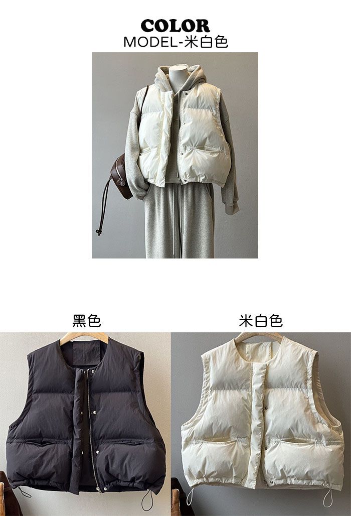 兩種尺寸/鋪棉外套/U領/下襬抽繩收腰/切線雙口袋/麵包背心 - 休閒居家簡約百搭素面鋪棉背心外套無袖背心外套夾克外套多尺寸ML黑色米白色