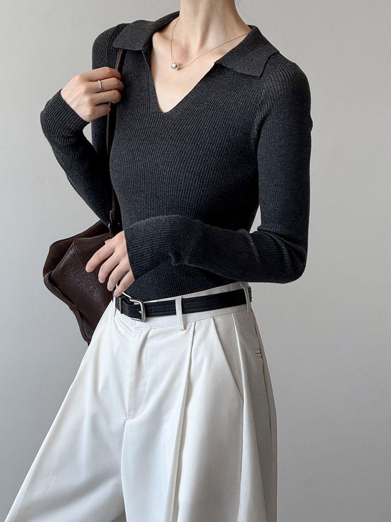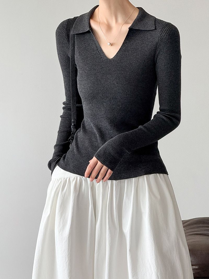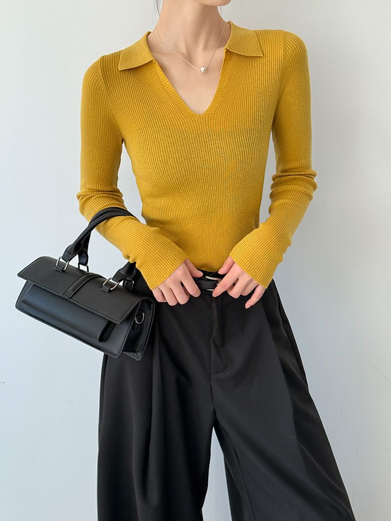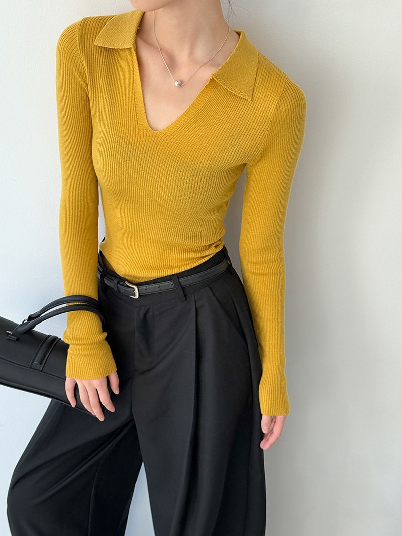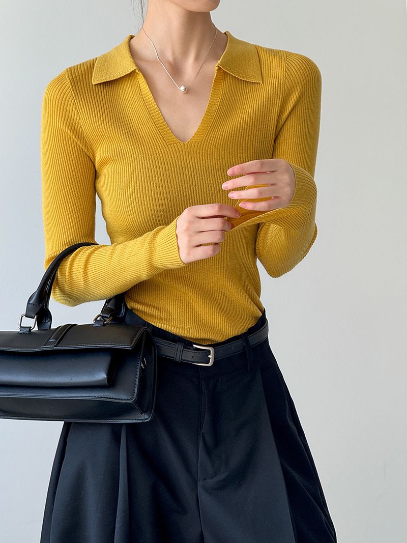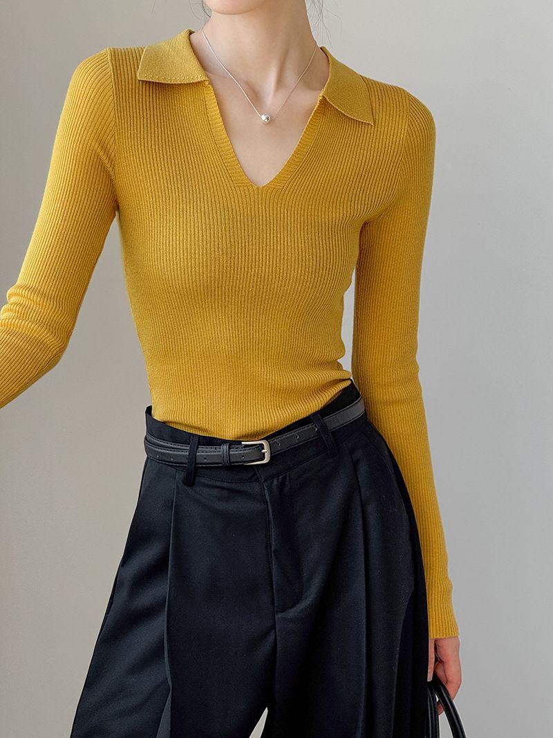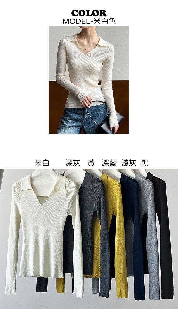深V領/翻領/彈力坑條面料/合身內搭上衣 - 休閒居家簡約百搭素面翻領針織衫針織上衣長袖上衣黑色米白色淺灰色黃色深藍色深灰色