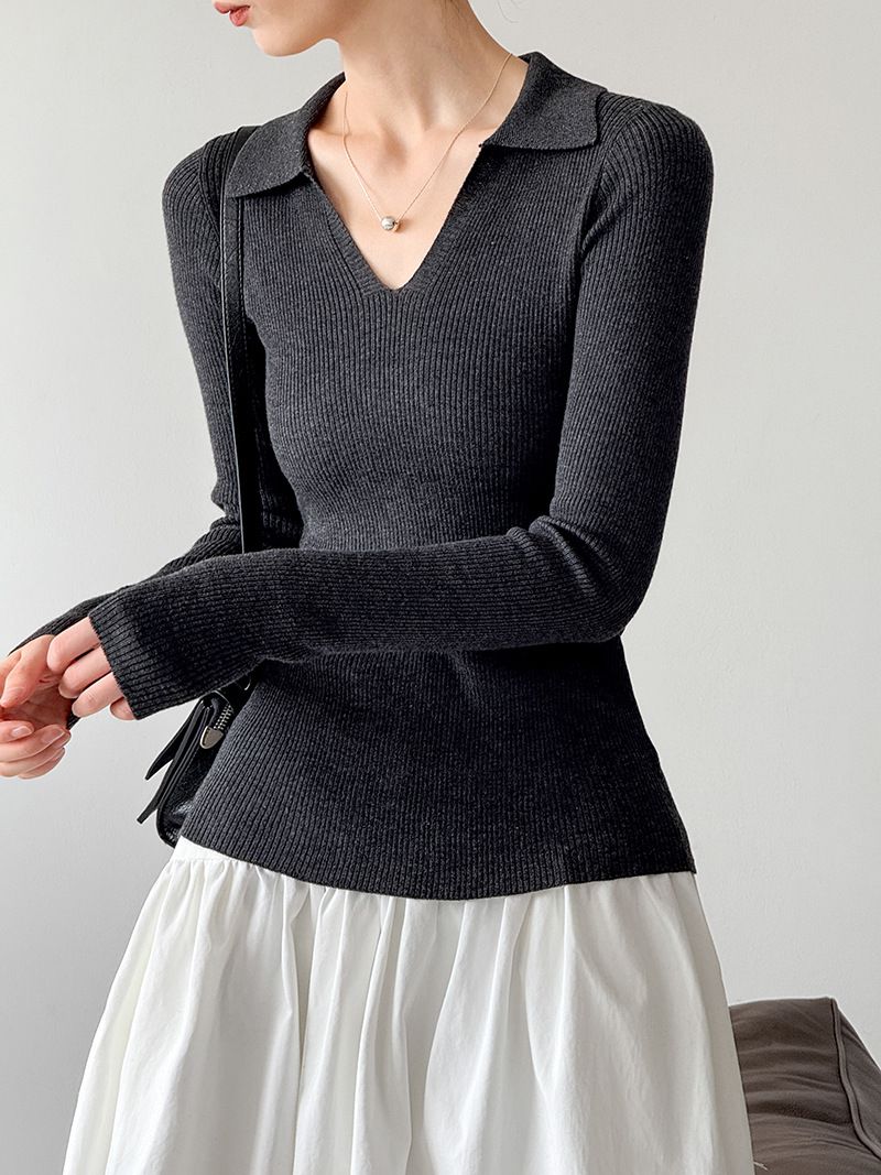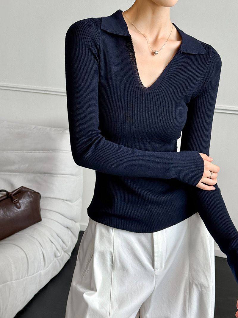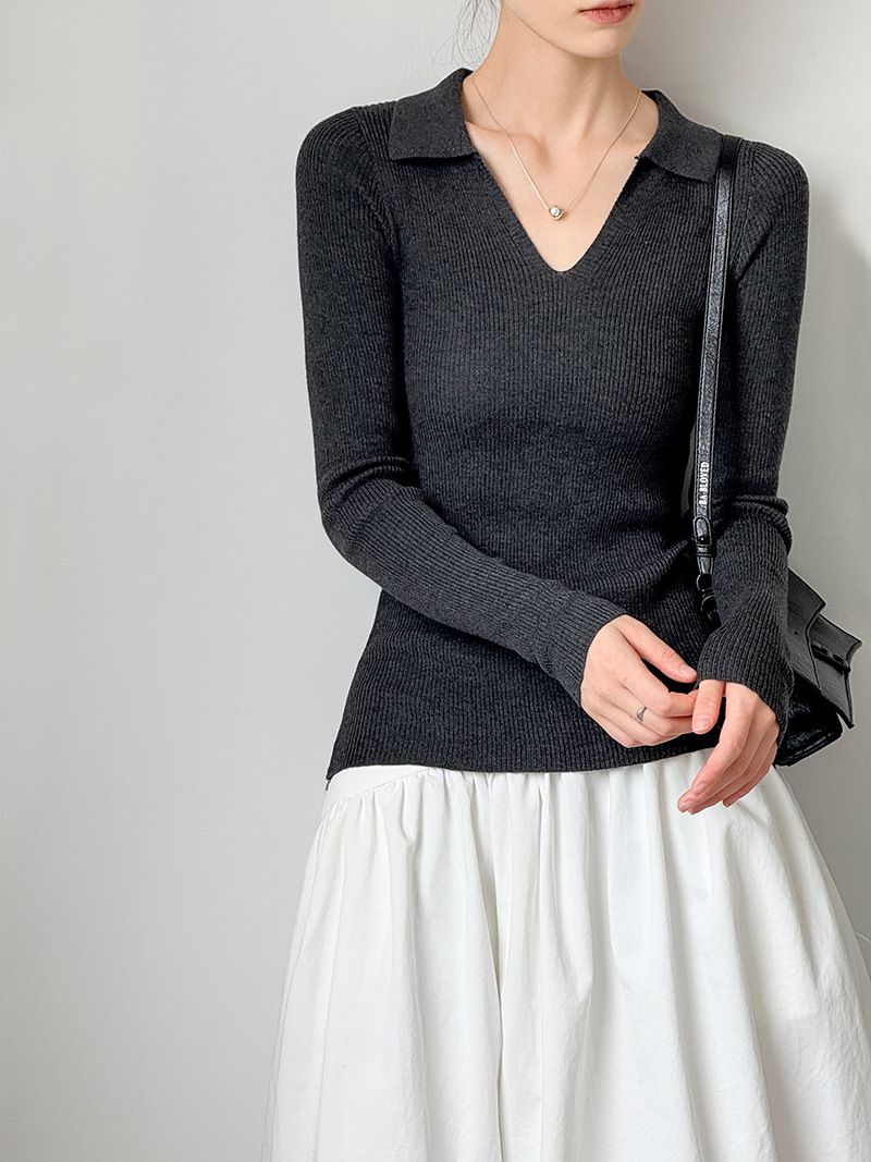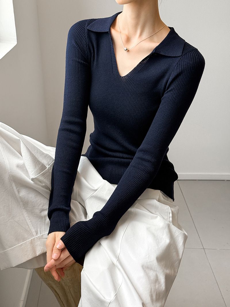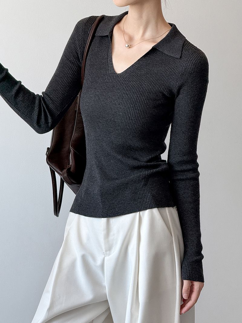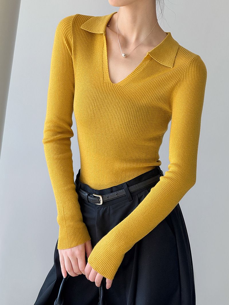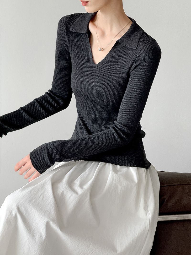 深V領/翻領/彈力坑條面料/合身內搭上衣 - 休閒居家簡約百搭素面翻領針織衫針織上衣長袖上衣黑色米白色淺灰色黃色深藍色深灰色