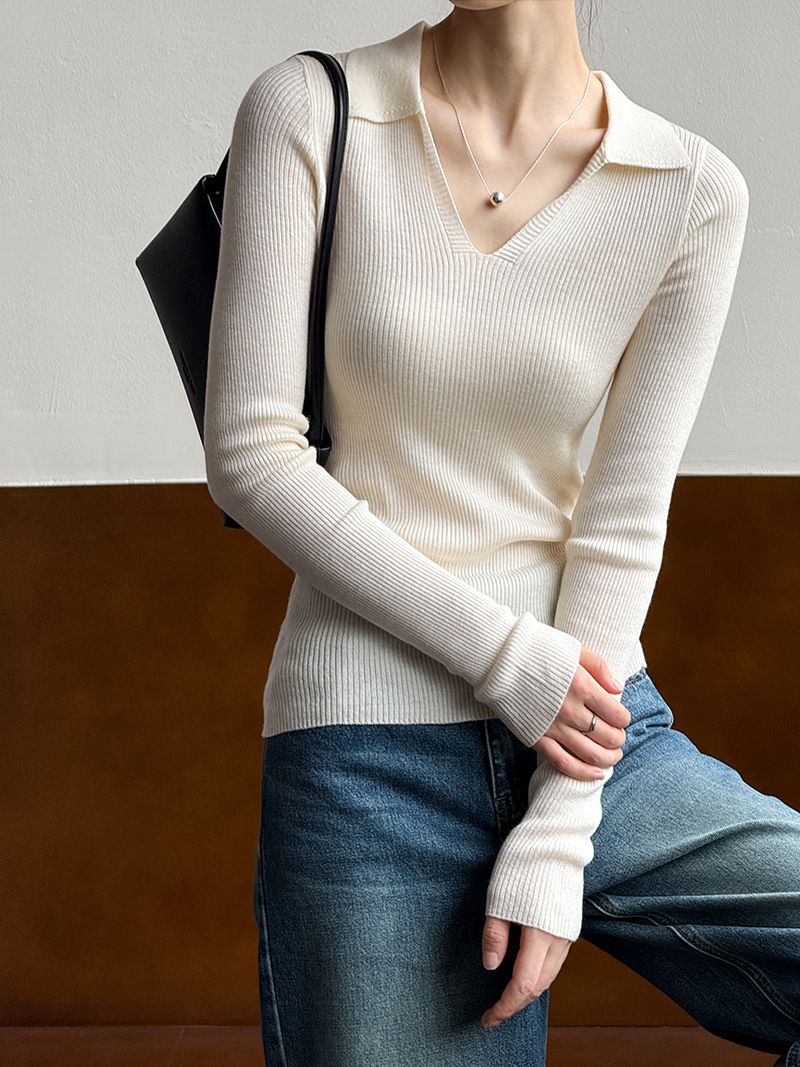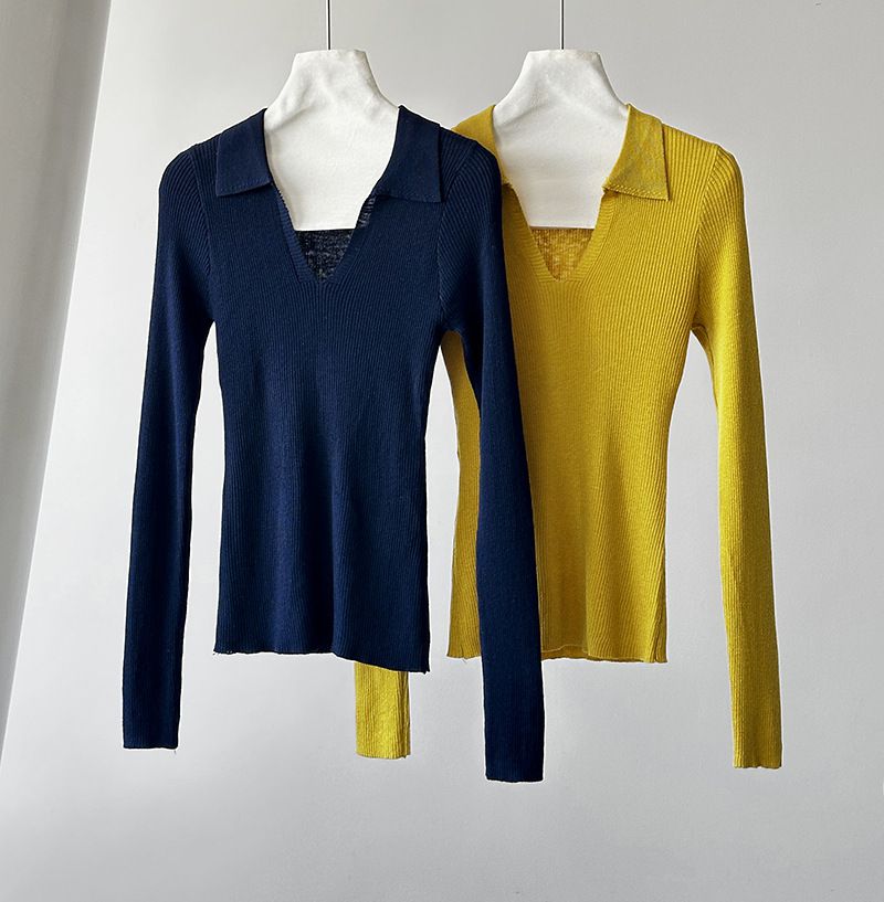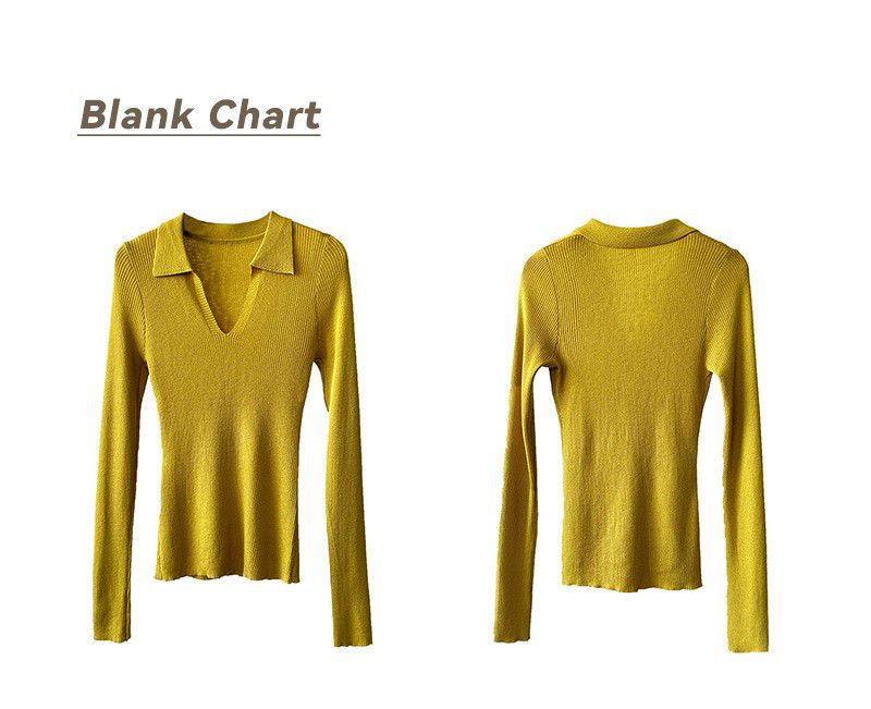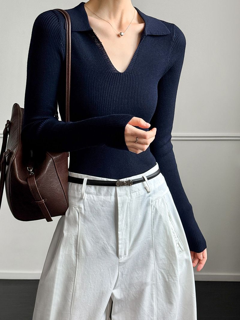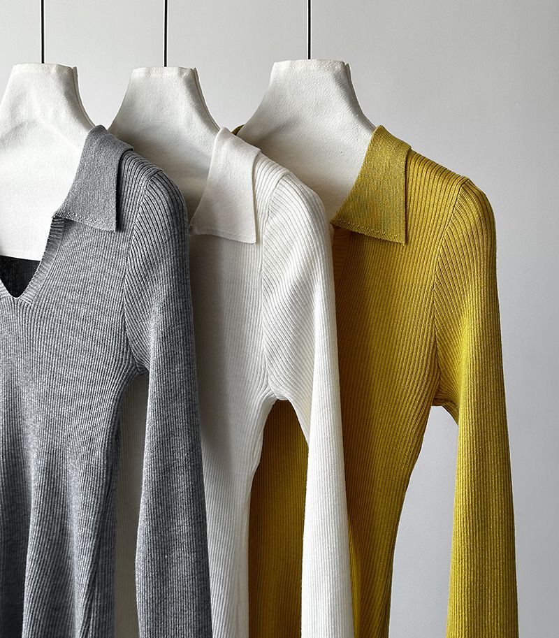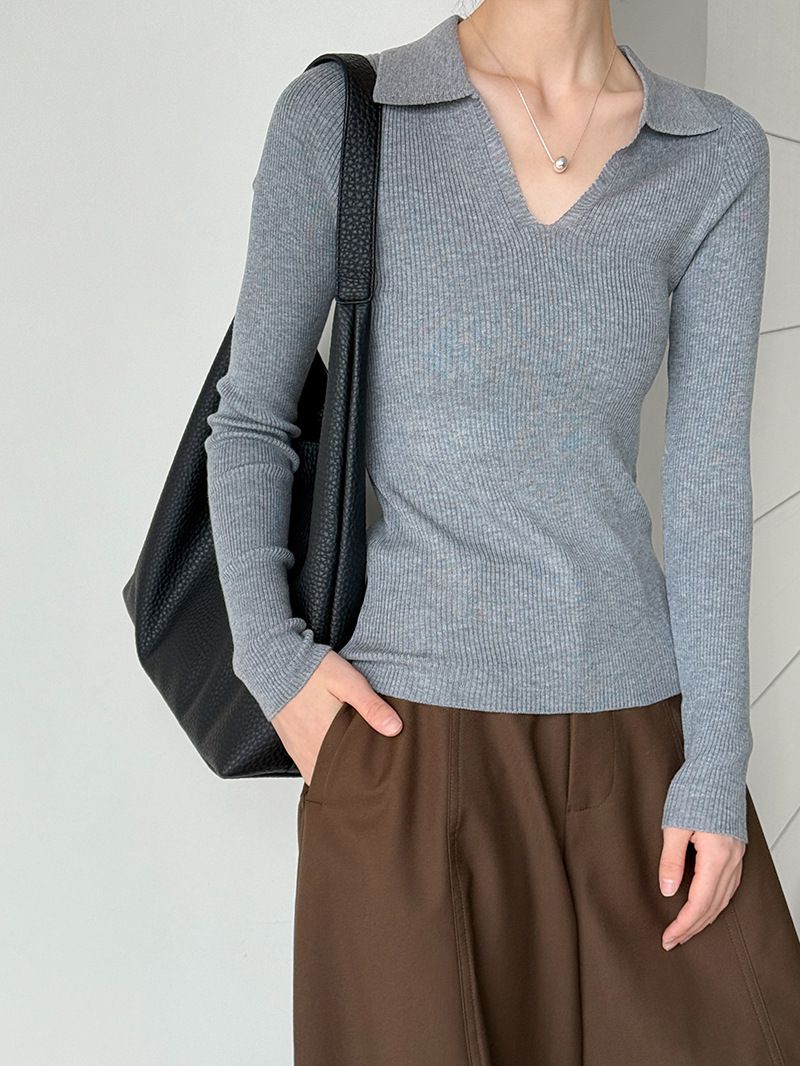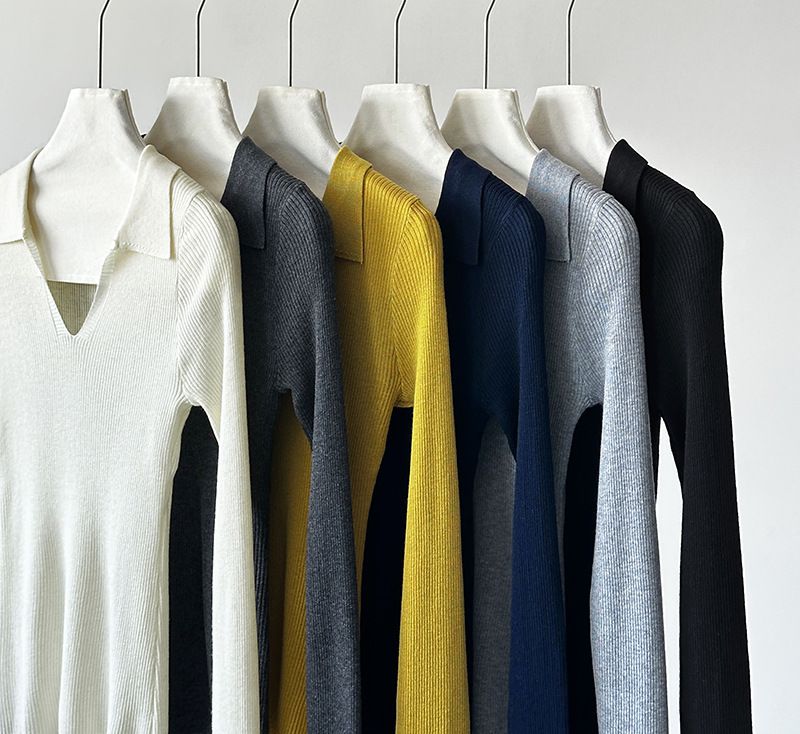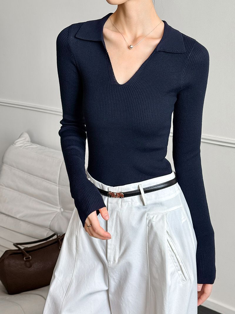 深V領/翻領/彈力坑條面料/合身內搭上衣 - 休閒居家簡約百搭素面翻領針織衫針織上衣長袖上衣黑色米白色淺灰色黃色深藍色深灰色