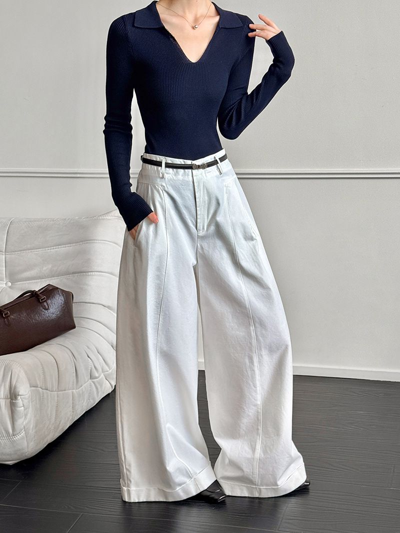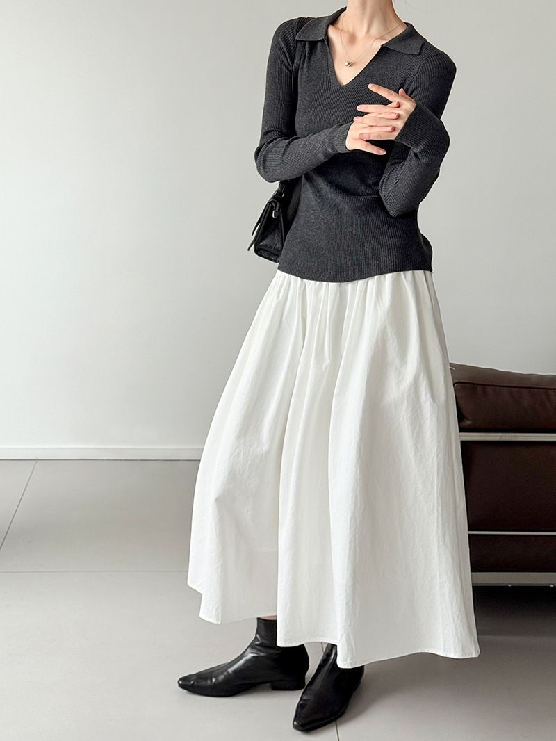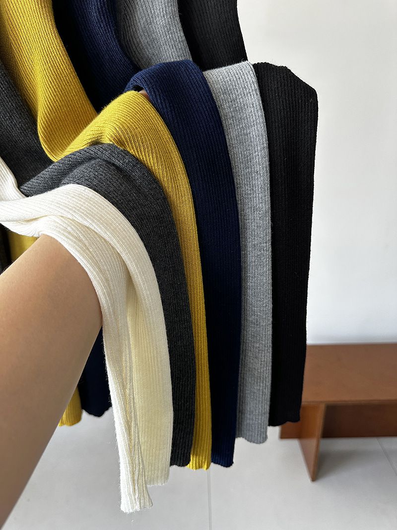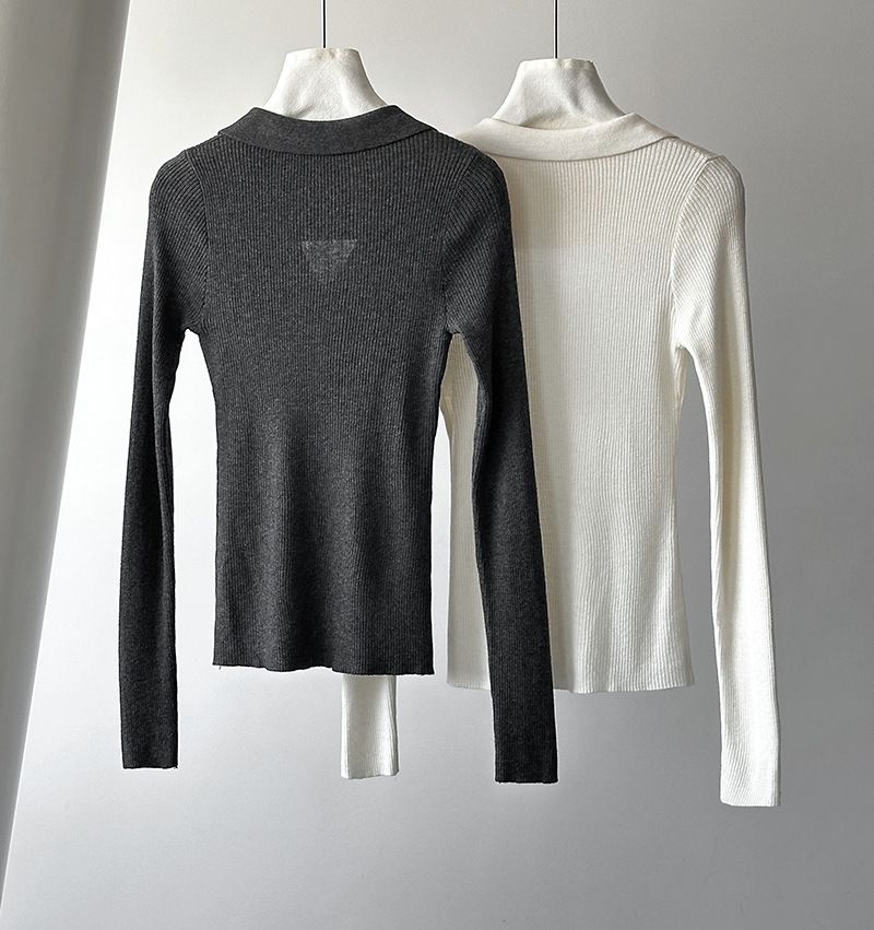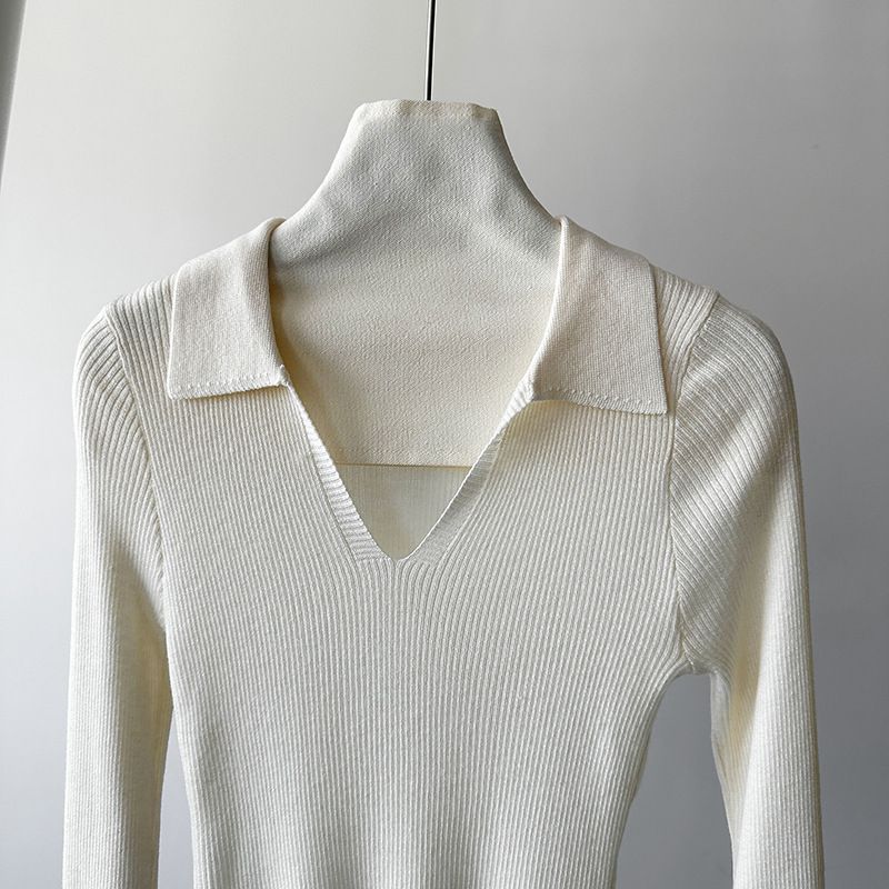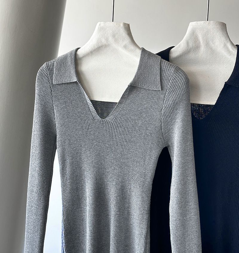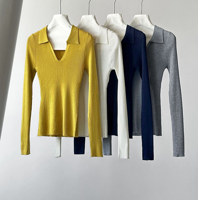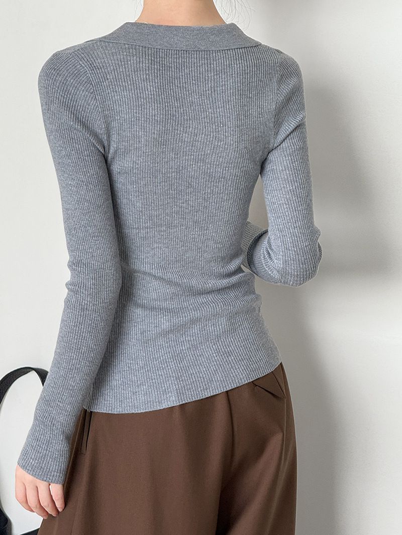 深V領/翻領/彈力坑條面料/合身內搭上衣 - 休閒居家簡約百搭素面翻領針織衫針織上衣長袖上衣黑色米白色淺灰色黃色深藍色深灰色