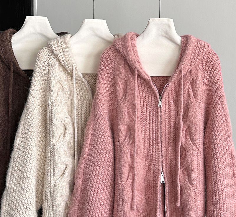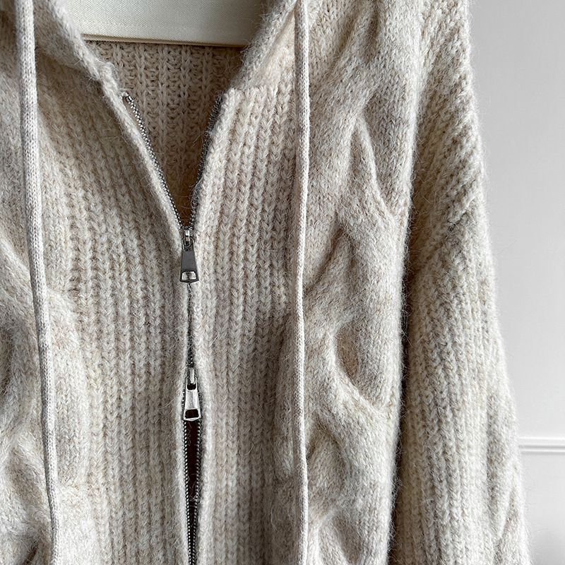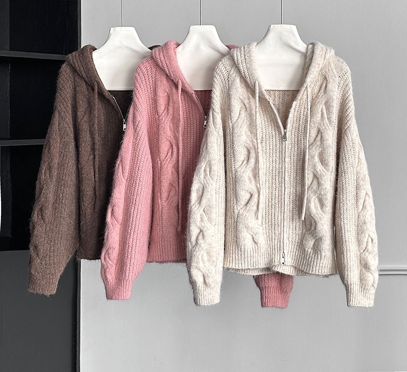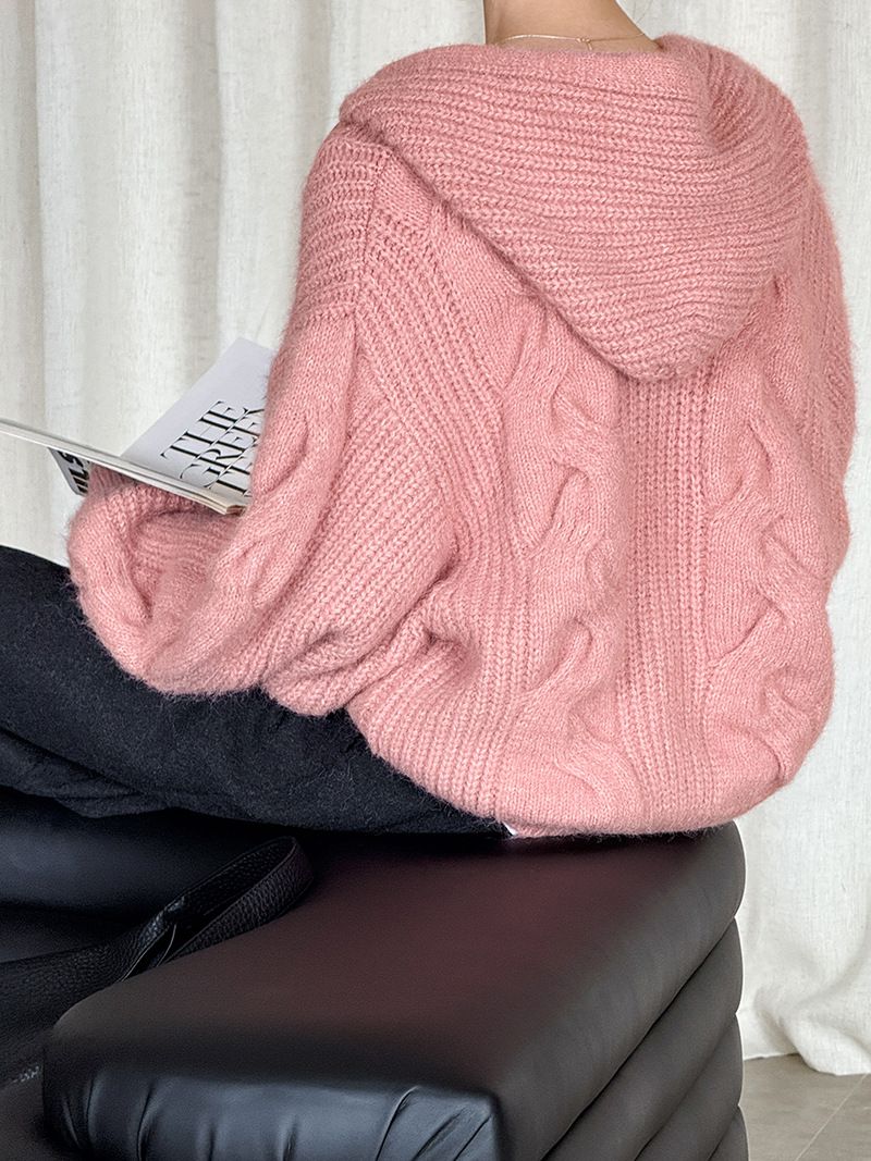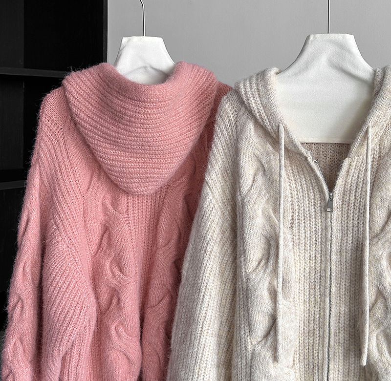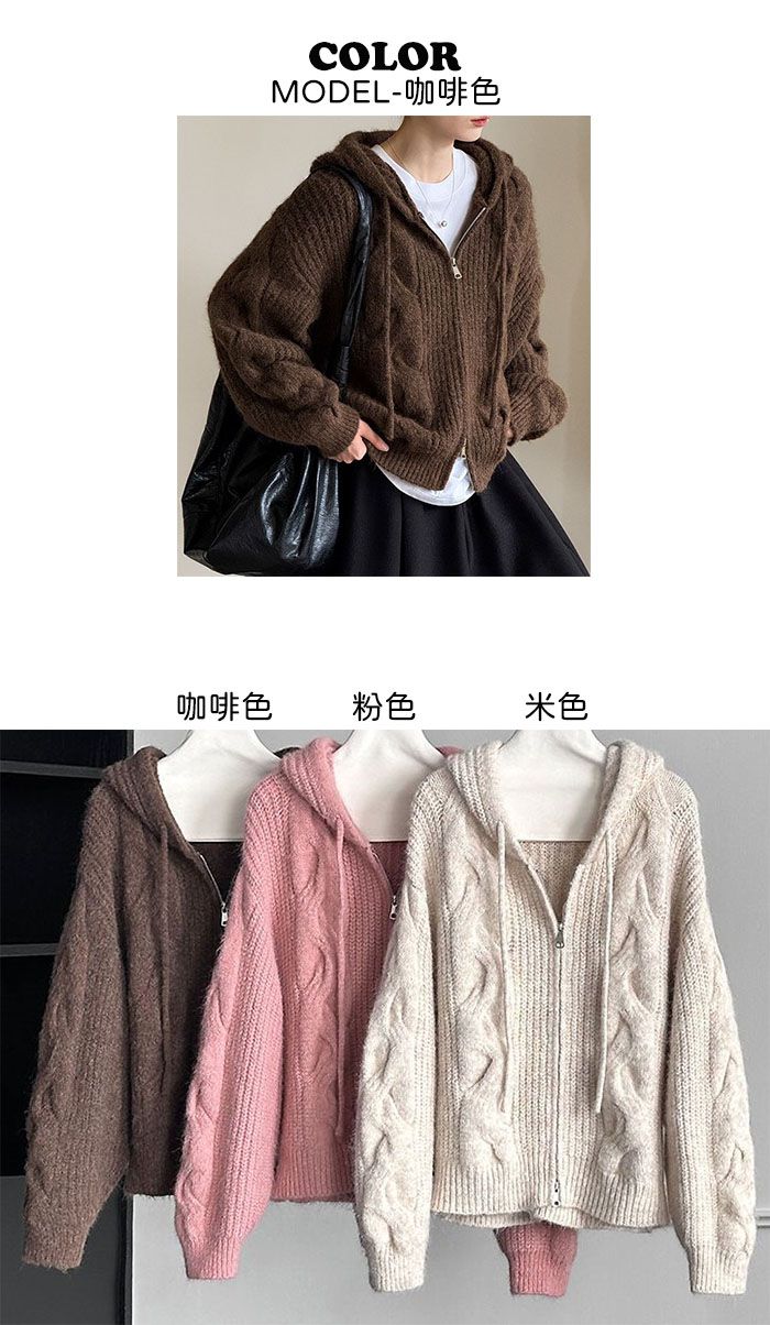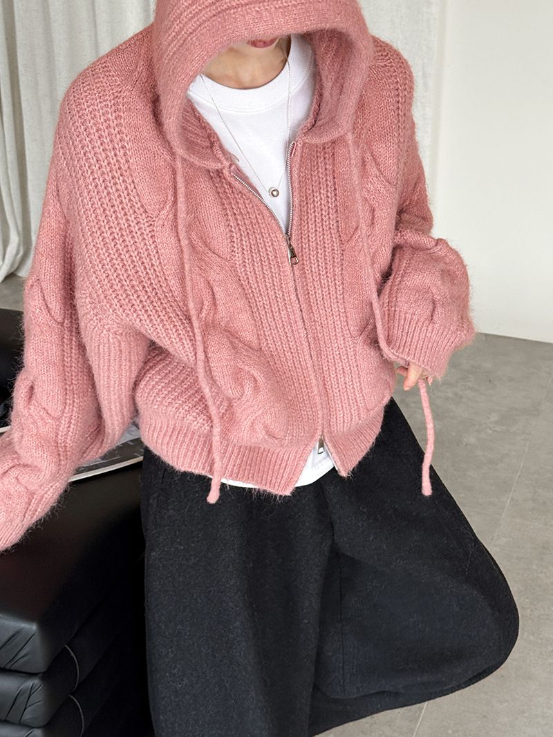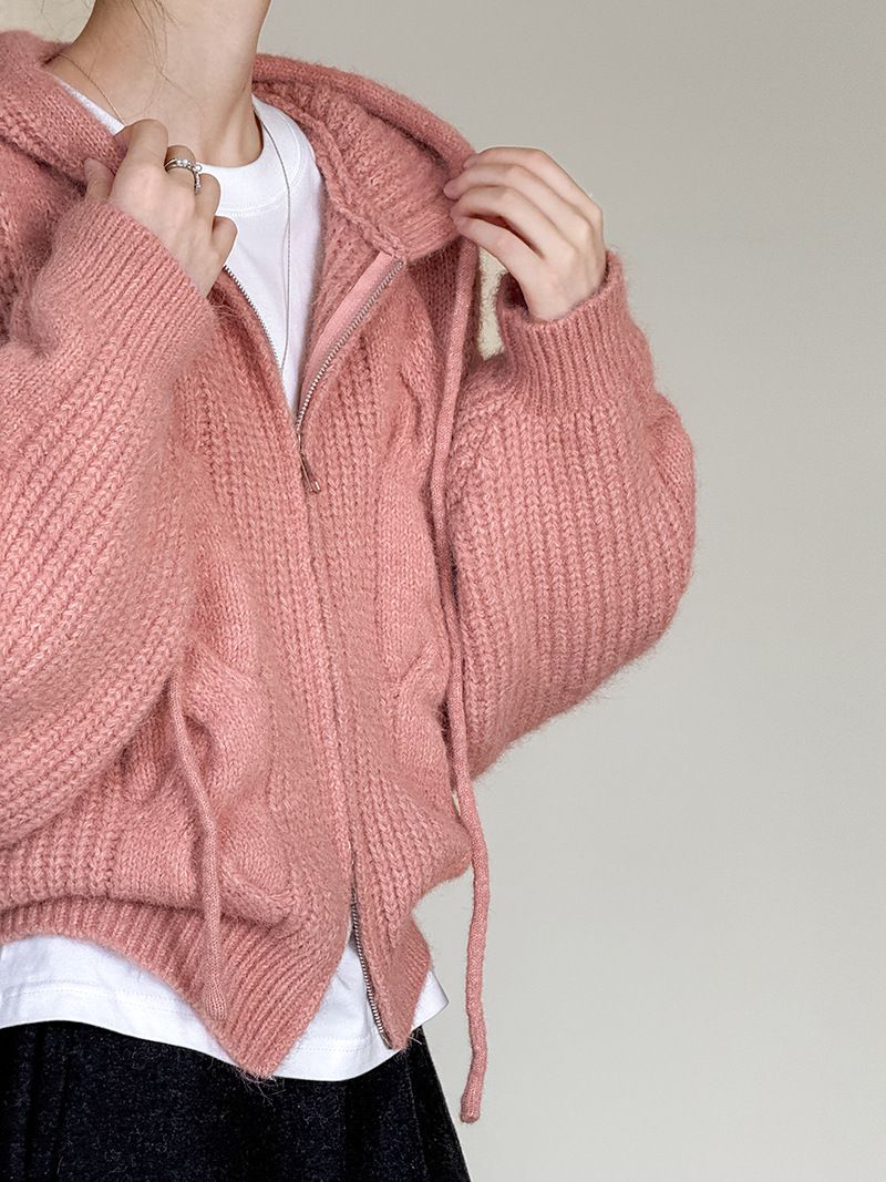 抽繩連帽/好氣色/麻花編織紋/上下雙開式拉鍊外套 - 休閒居家簡約百搭素面連帽針織外套落肩長袖外套連帽外套米色咖啡色粉色