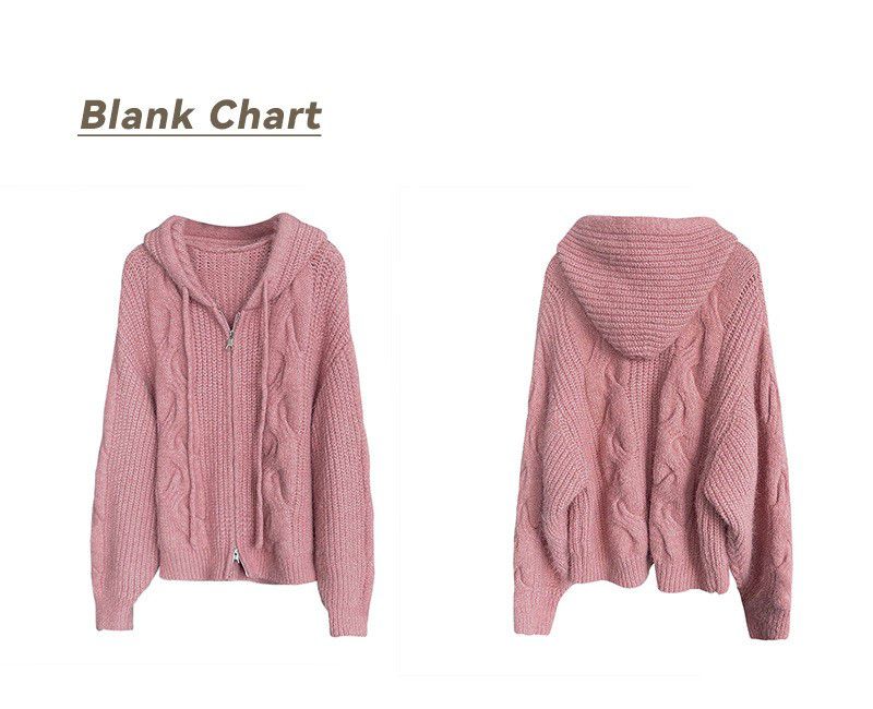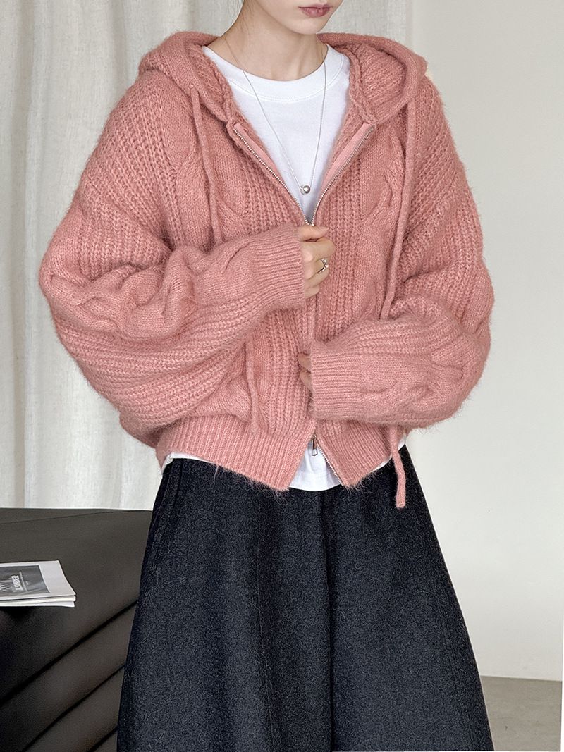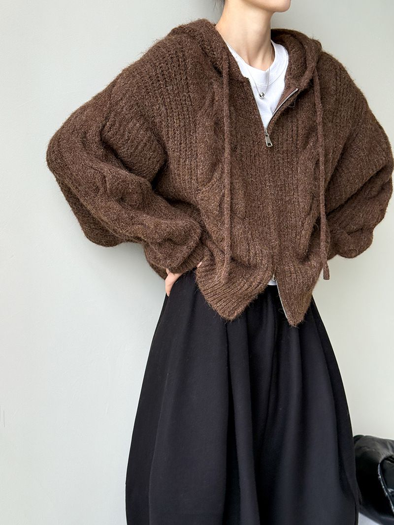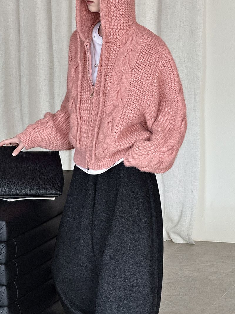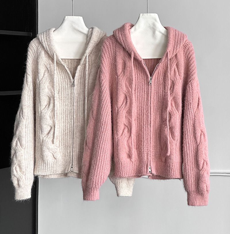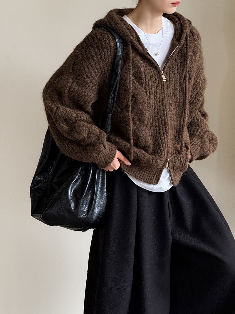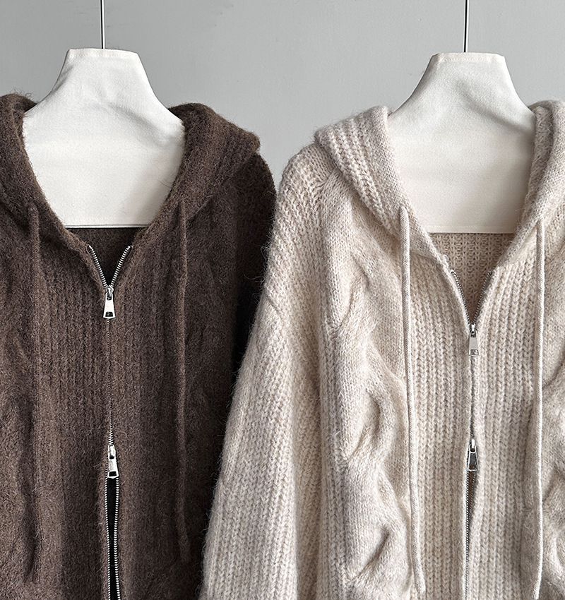 抽繩連帽/好氣色/麻花編織紋/上下雙開式拉鍊外套 - 休閒居家簡約百搭素面連帽針織外套落肩長袖外套連帽外套米色咖啡色粉色