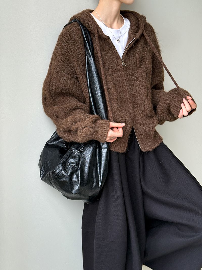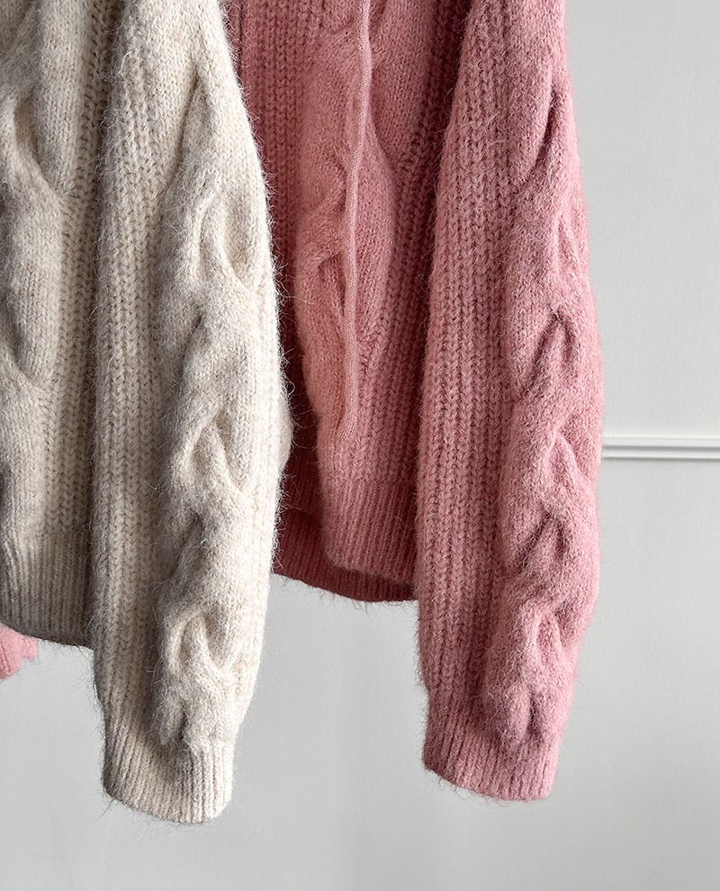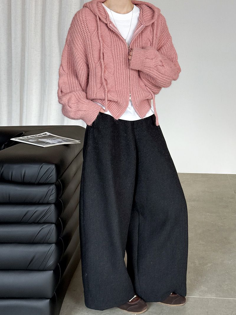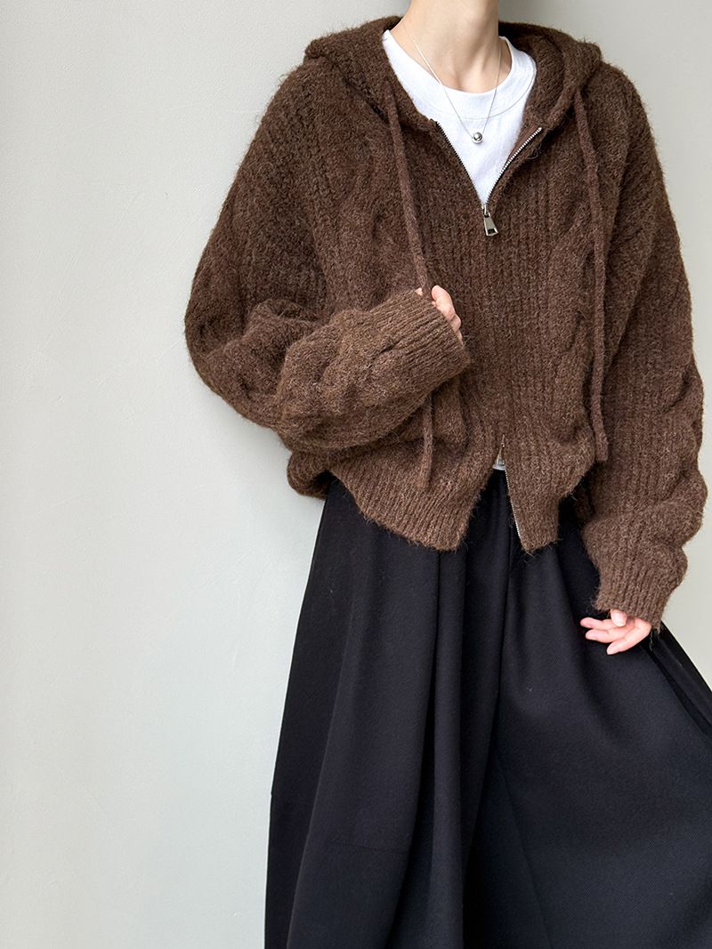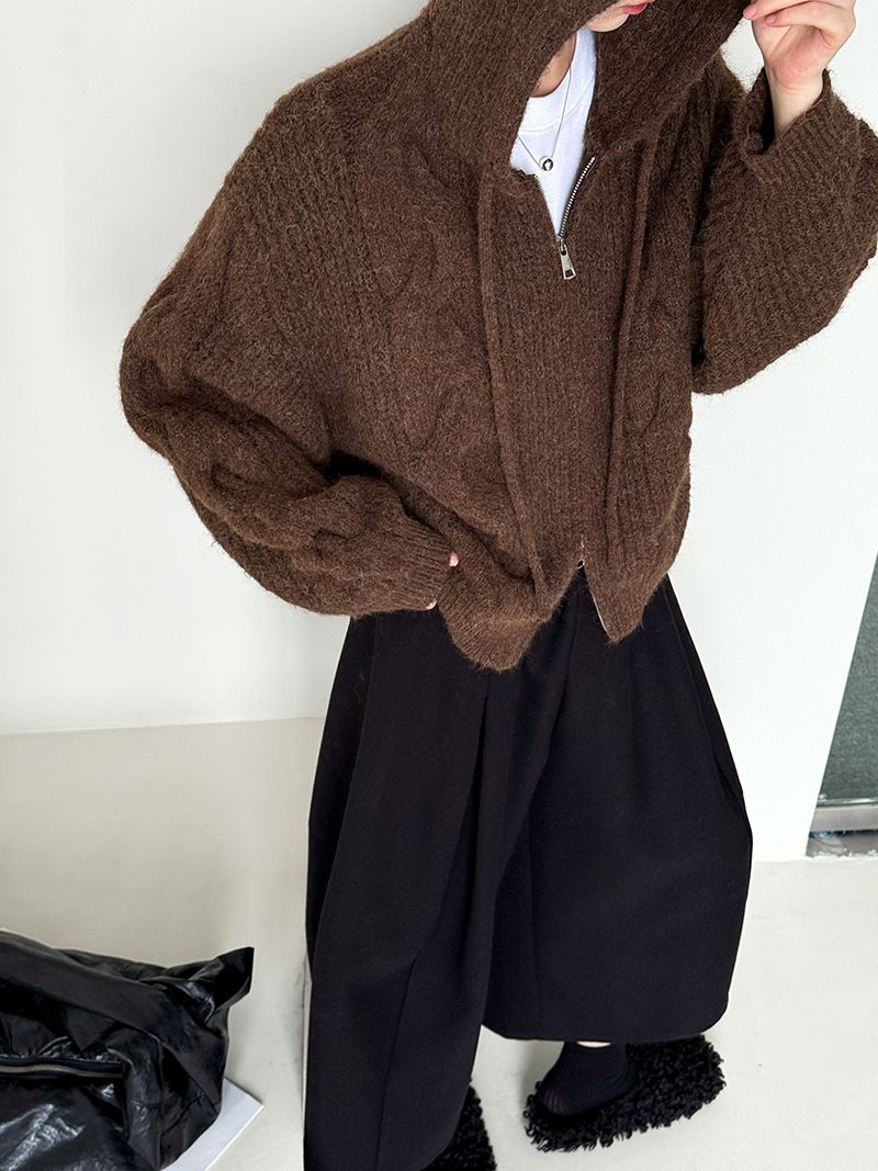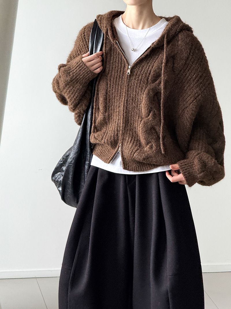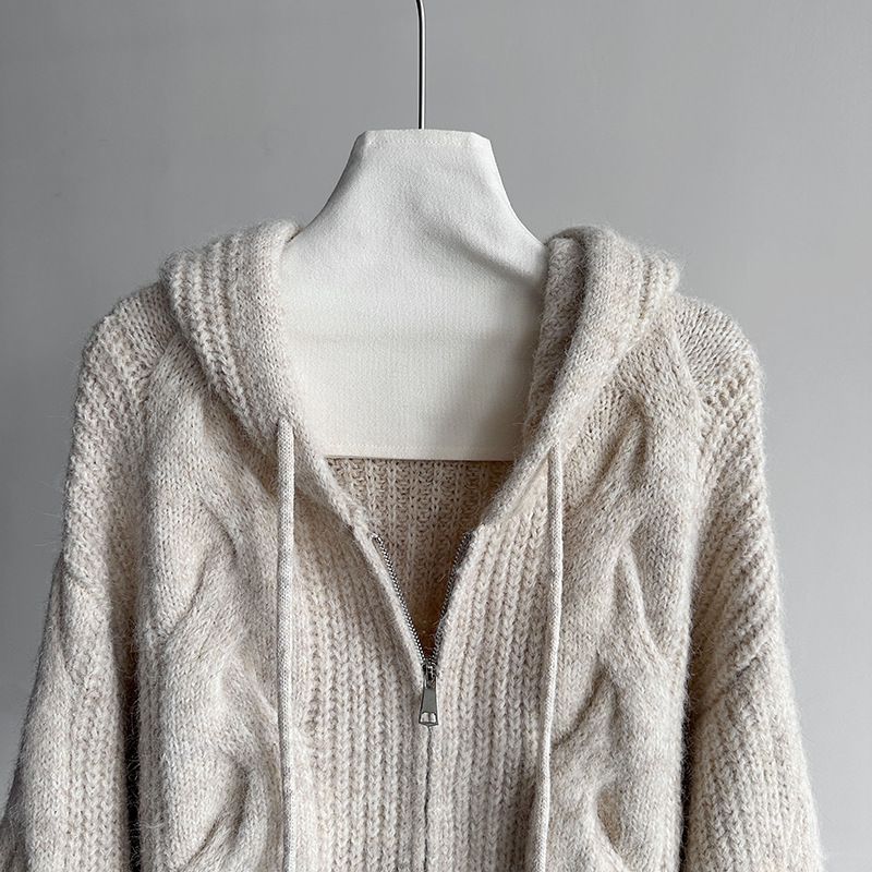 抽繩連帽/好氣色/麻花編織紋/上下雙開式拉鍊外套 - 休閒居家簡約百搭素面連帽針織外套落肩長袖外套連帽外套米色咖啡色粉色