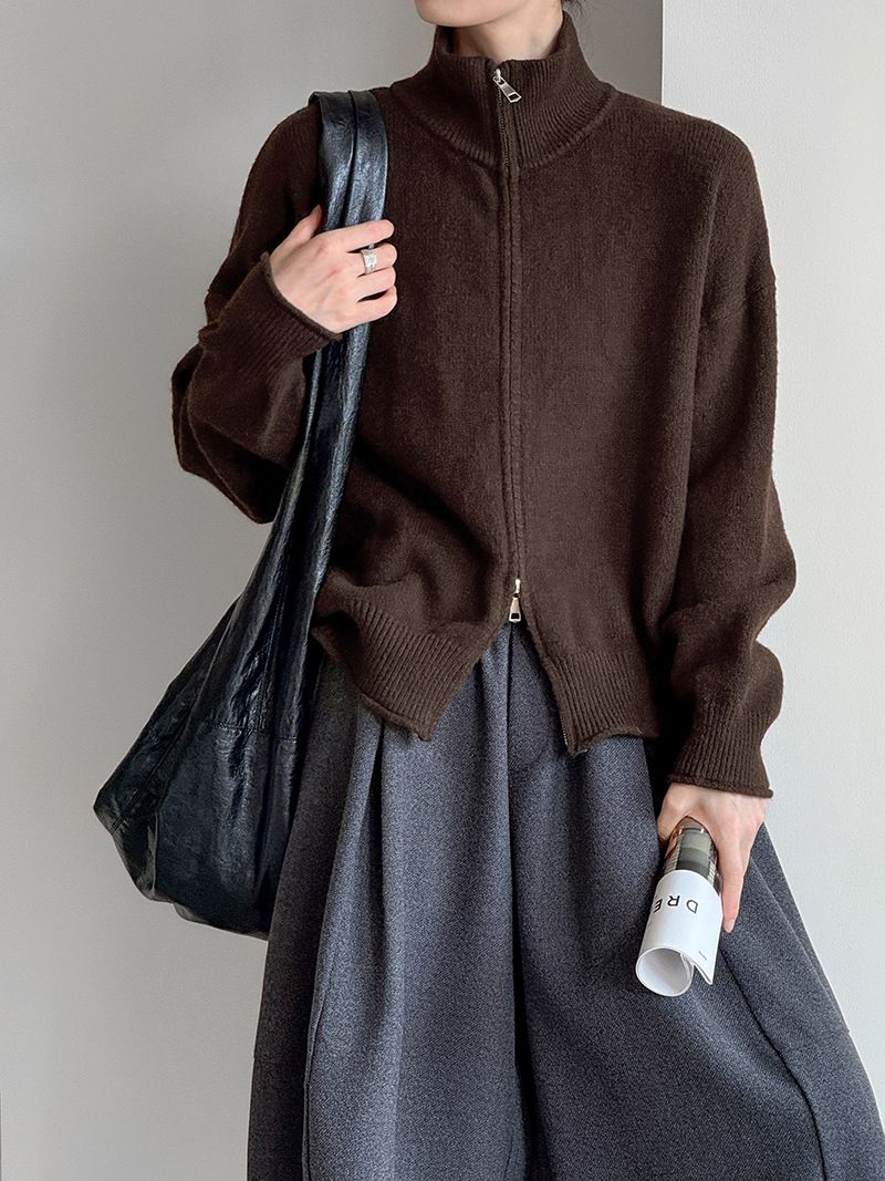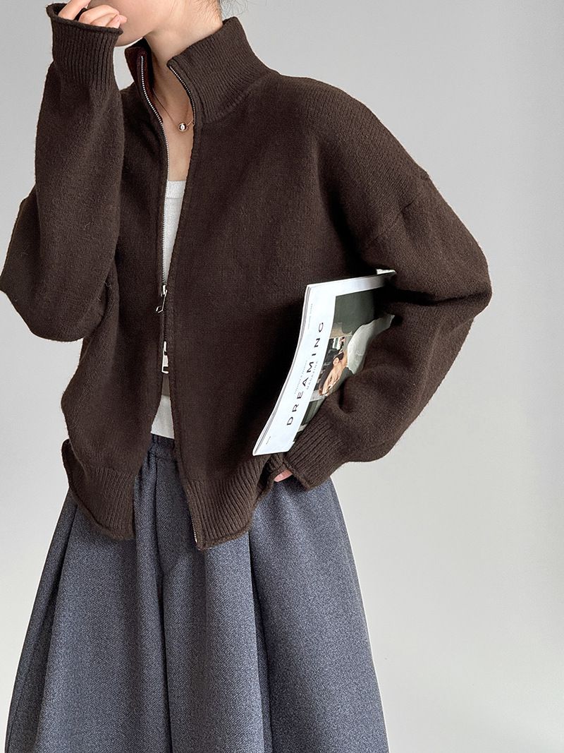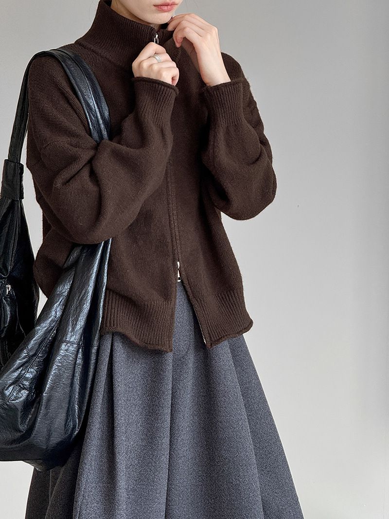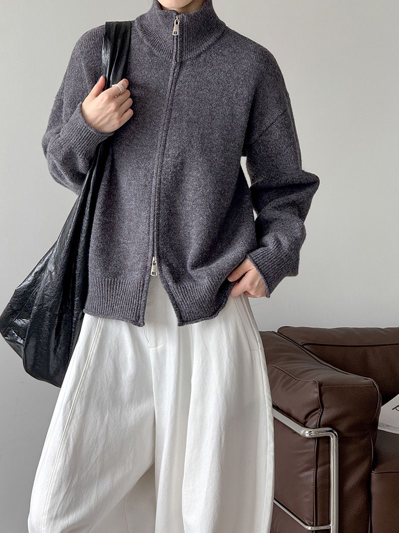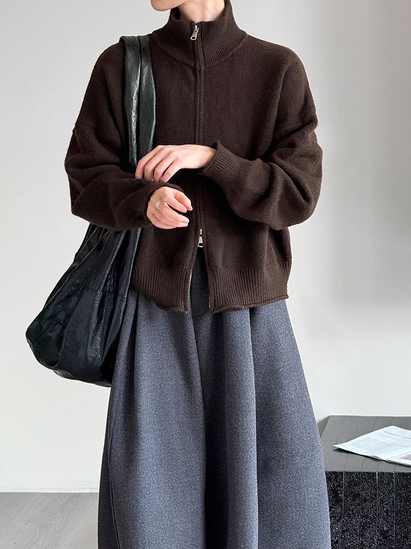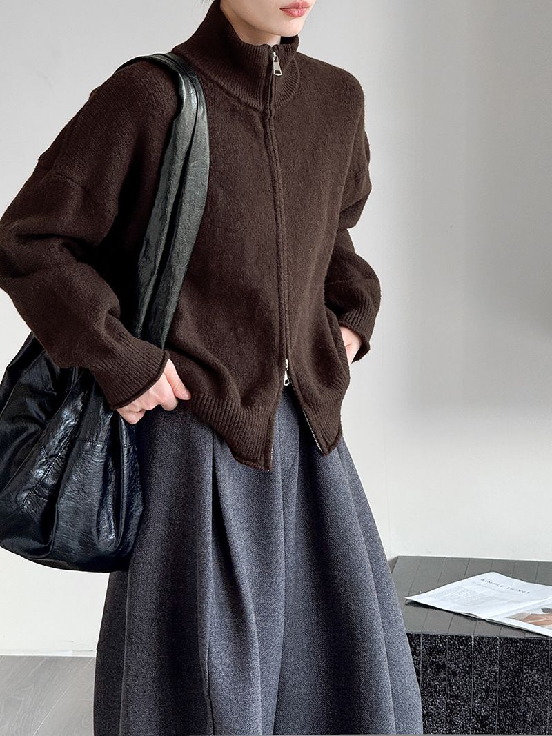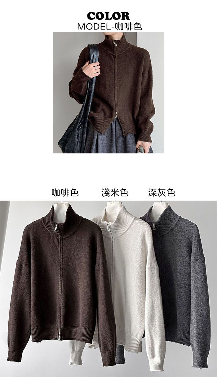 捲邊領/立領.高領/上下雙開式拉鍊外套/落肩長袖/長版外套 - 休閒居家簡約百搭素面長版立領針織衫針織上衣針織外套長袖上衣外套淺米色咖啡色深灰色