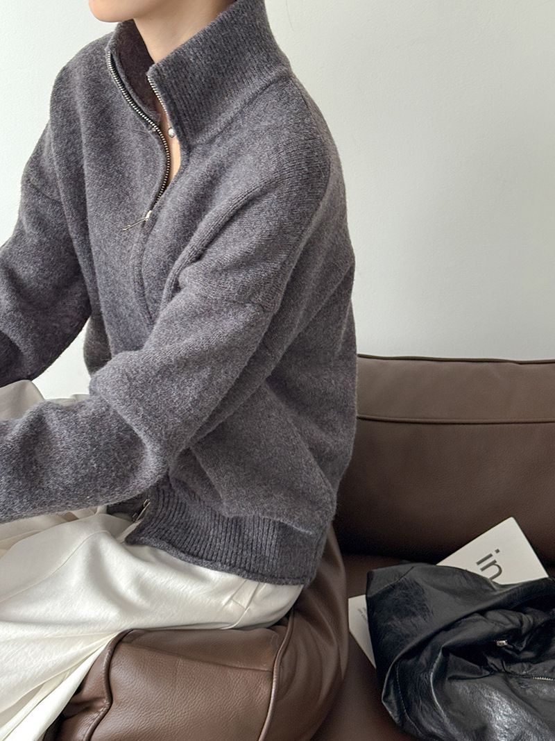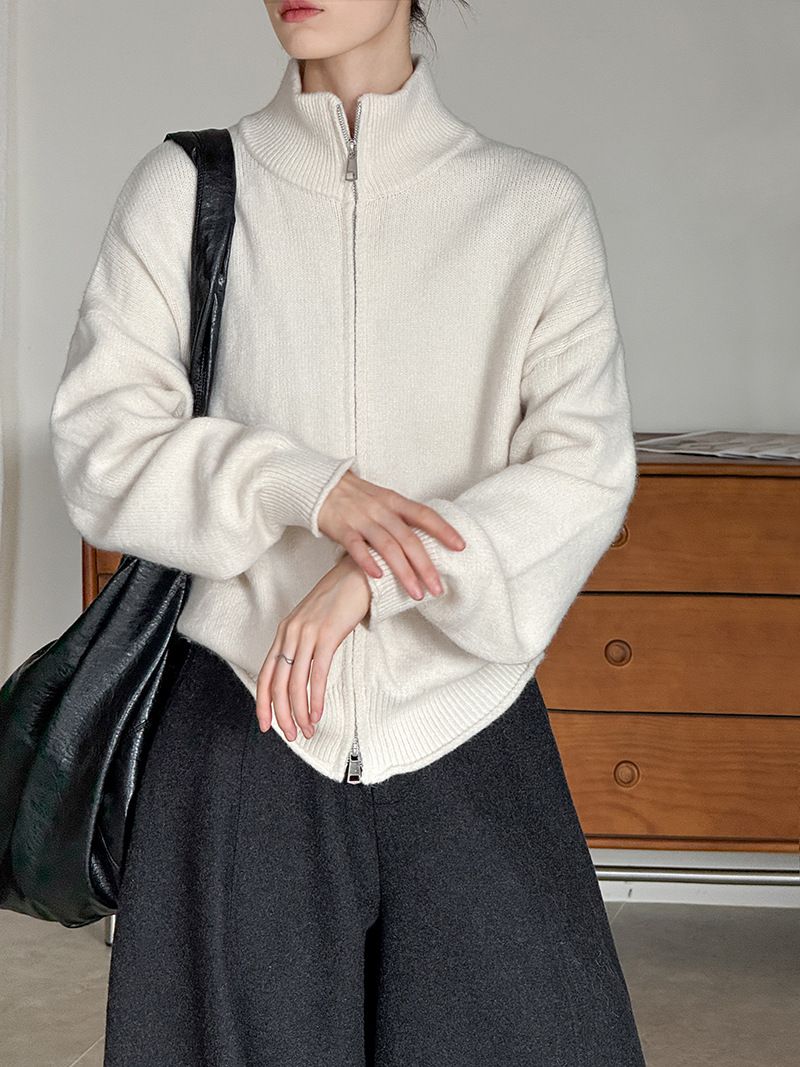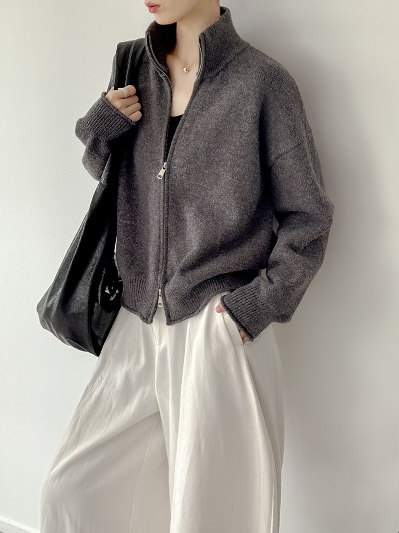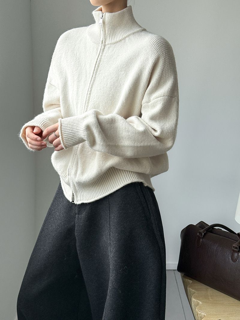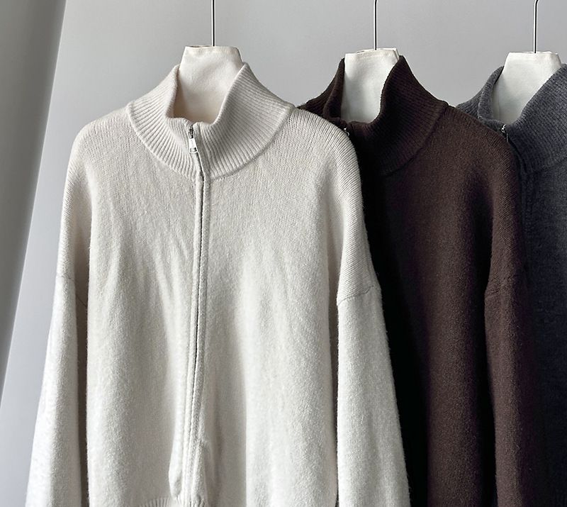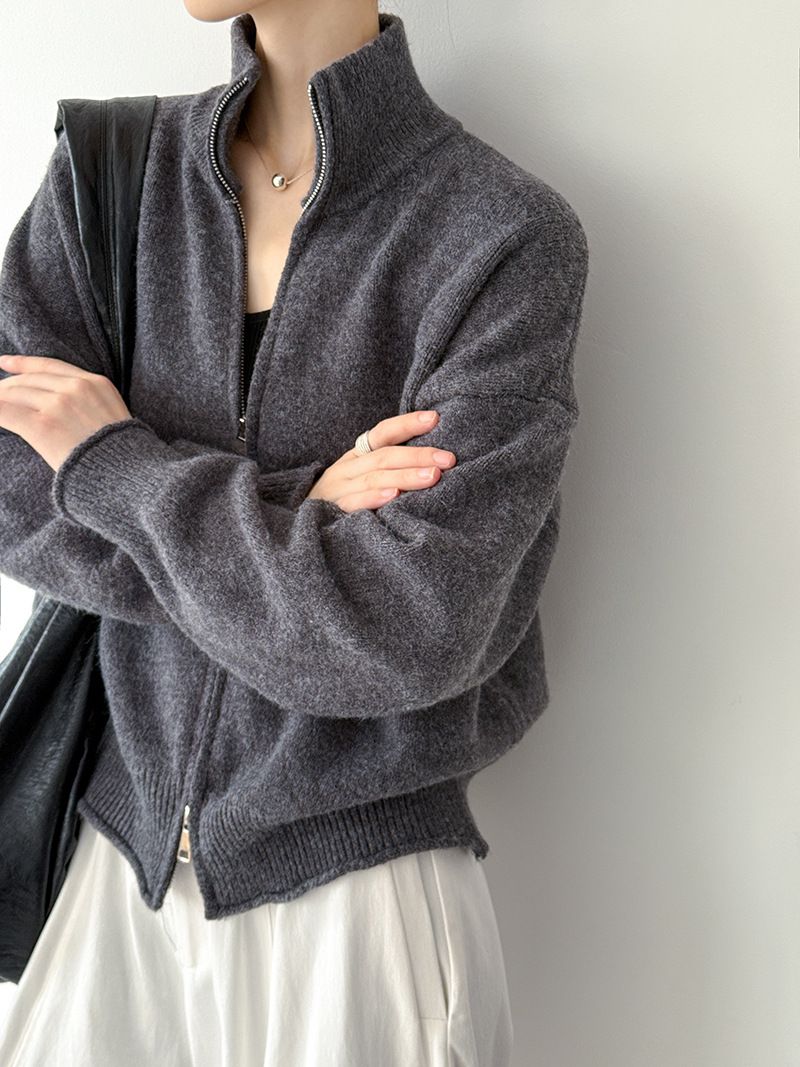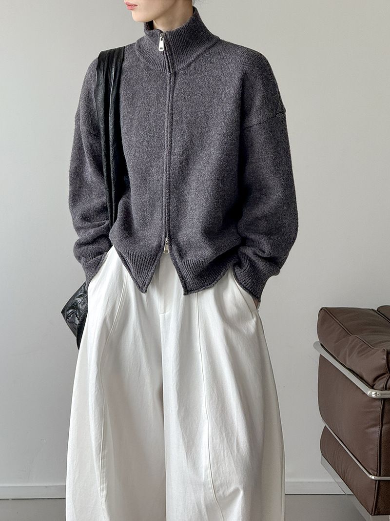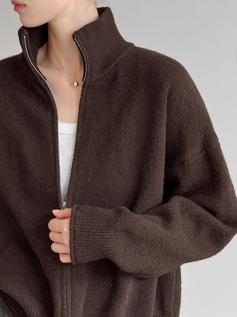 捲邊領/立領.高領/上下雙開式拉鍊外套/落肩長袖/長版外套 - 休閒居家簡約百搭素面長版立領針織衫針織上衣針織外套長袖上衣外套淺米色咖啡色深灰色