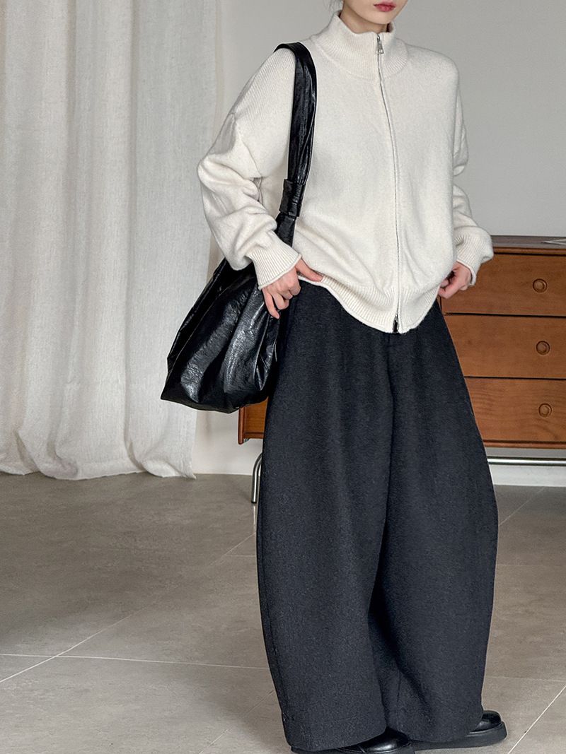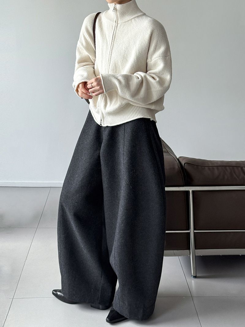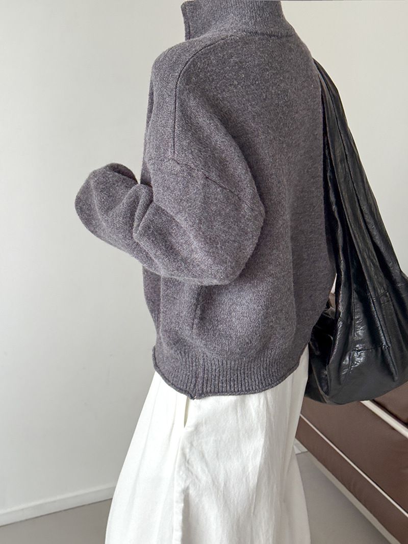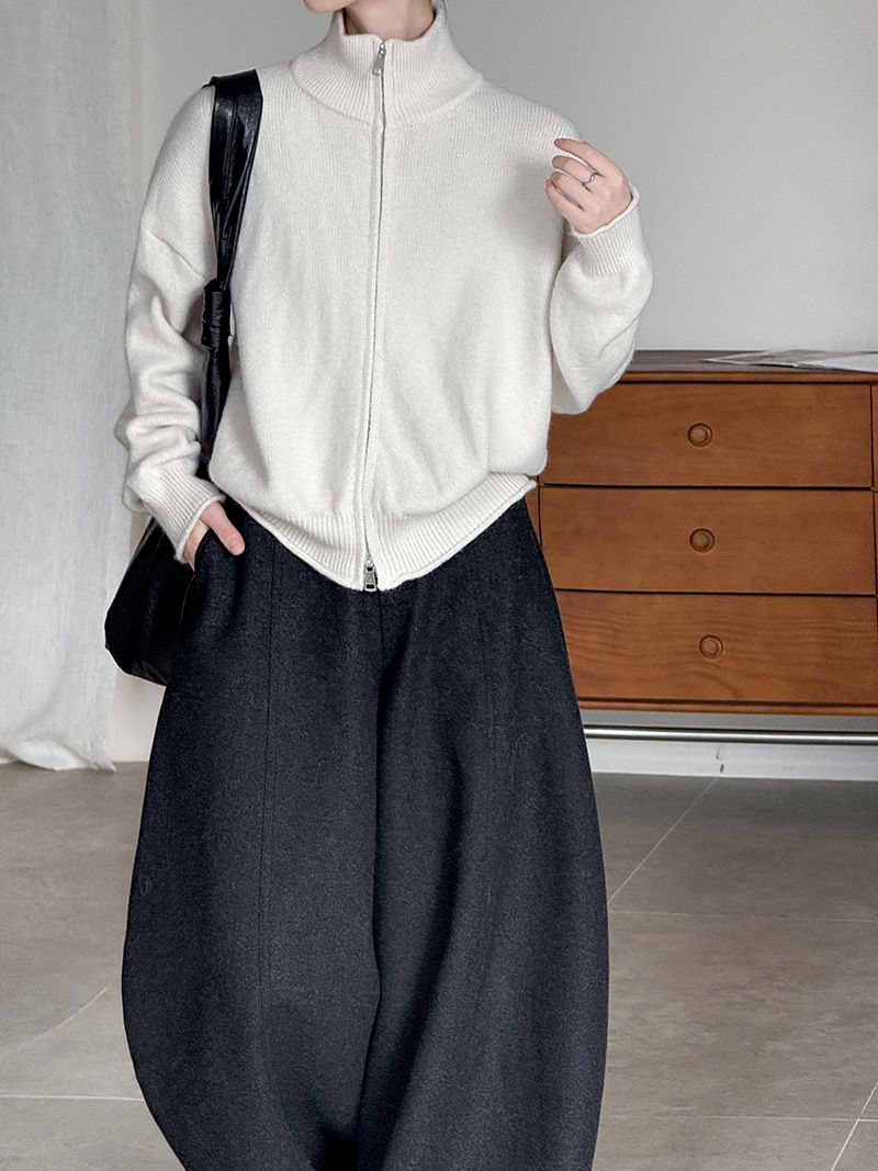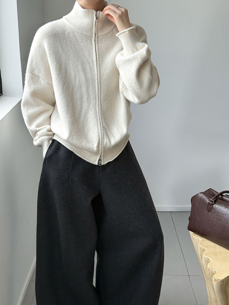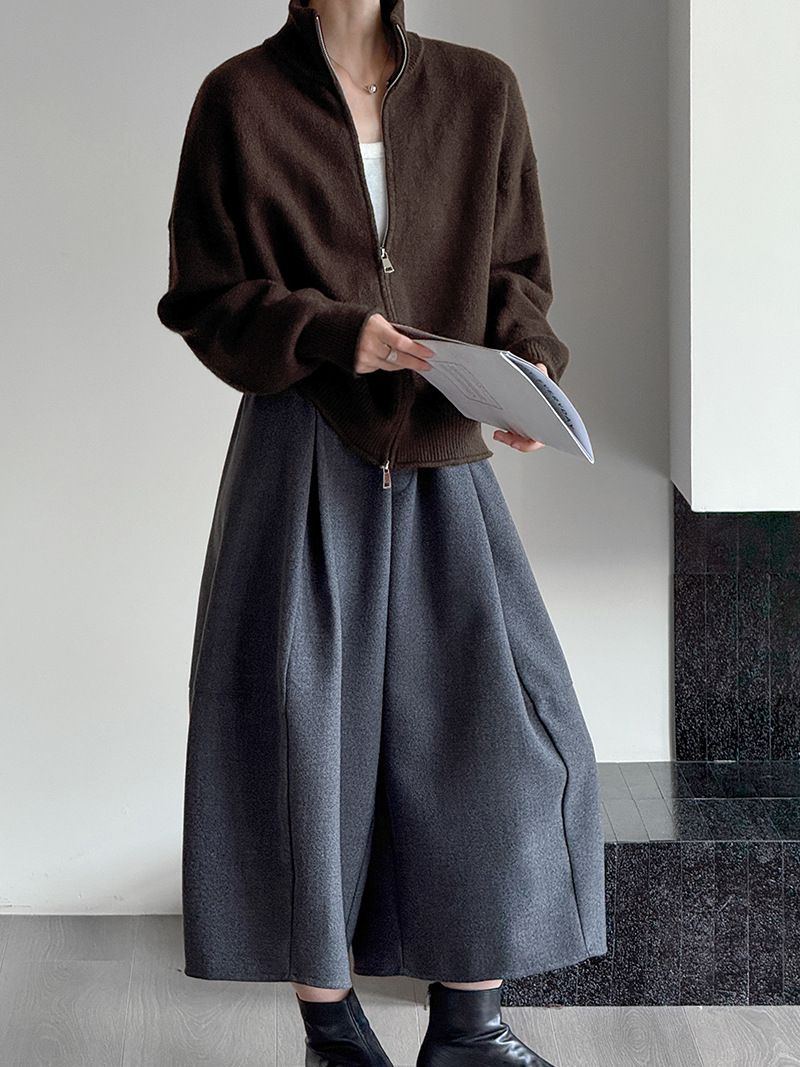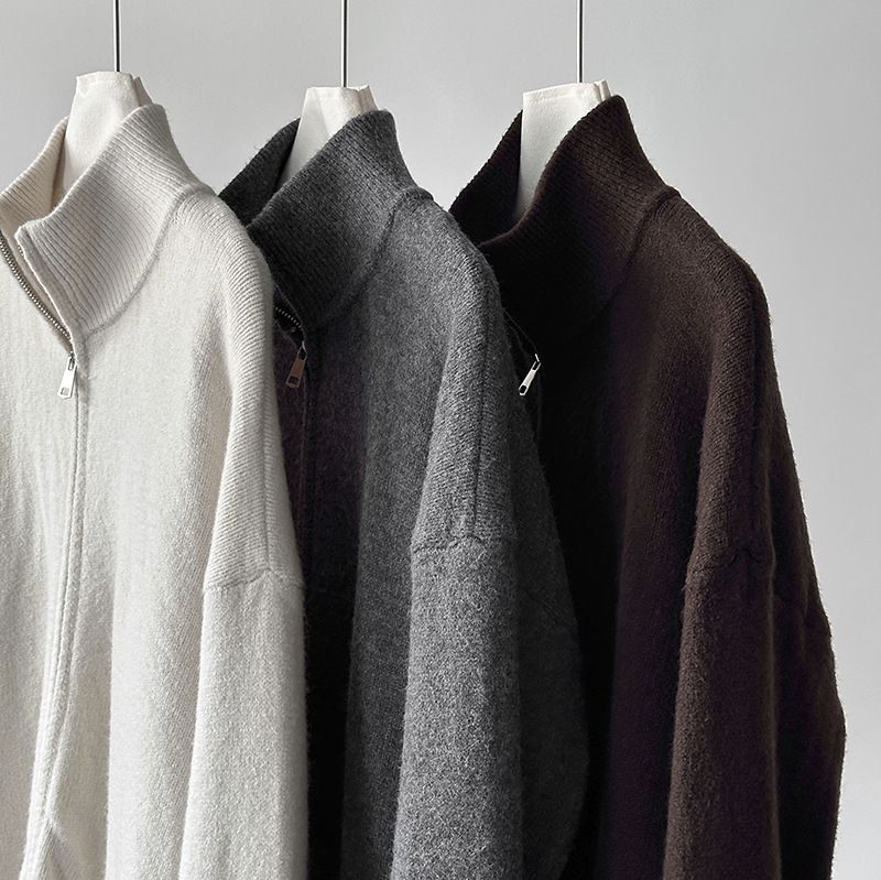 捲邊領/立領.高領/上下雙開式拉鍊外套/落肩長袖/長版外套 - 休閒居家簡約百搭素面長版立領針織衫針織上衣針織外套長袖上衣外套淺米色咖啡色深灰色
