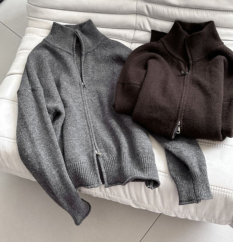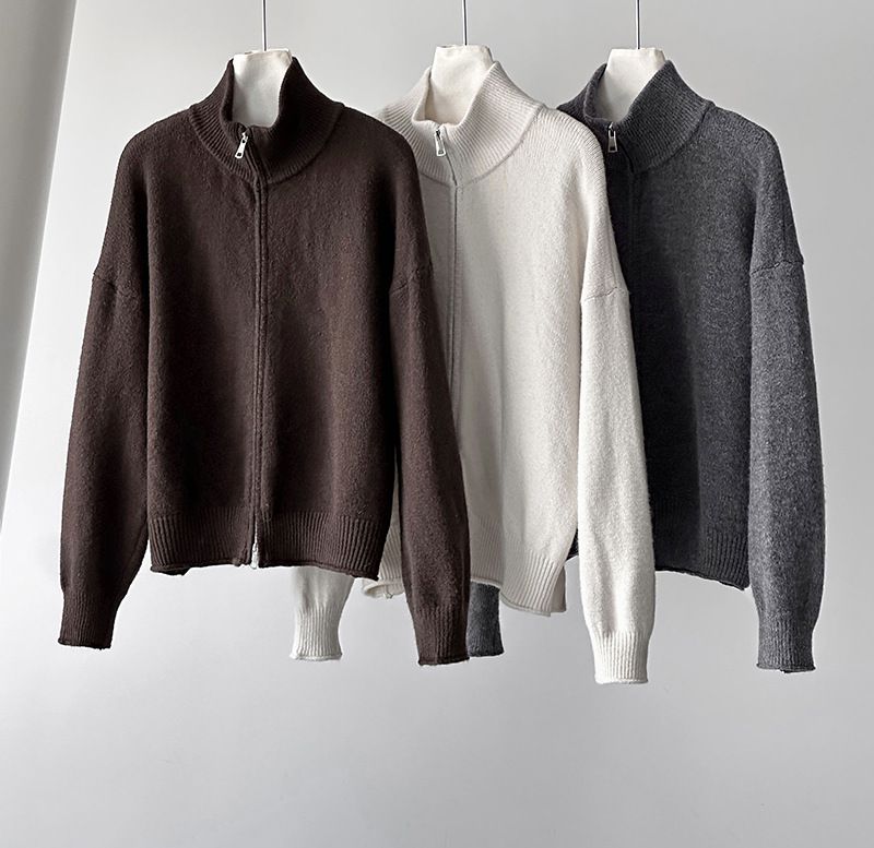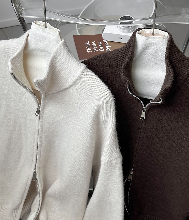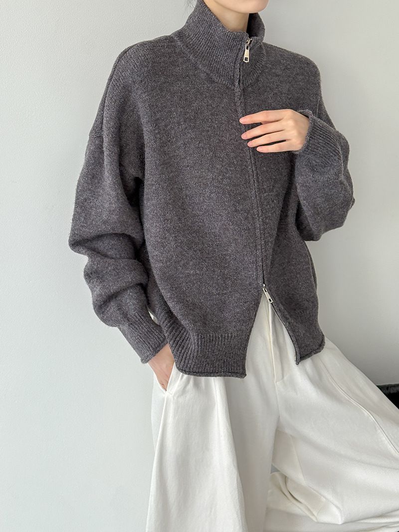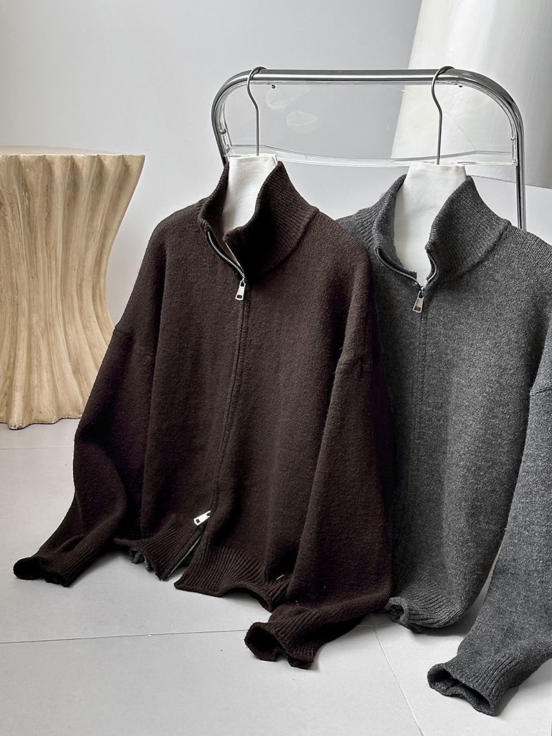 【C60093】品牌 長版立領針織衫-素面捲邊雙開式拉鍊長袖上衣外套★★