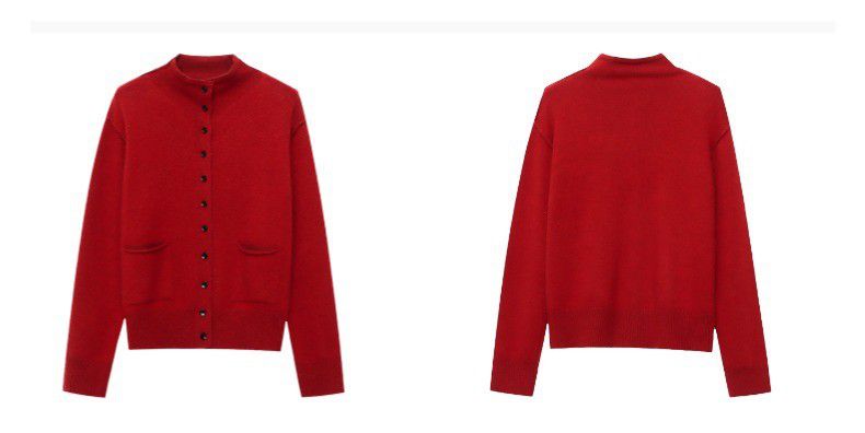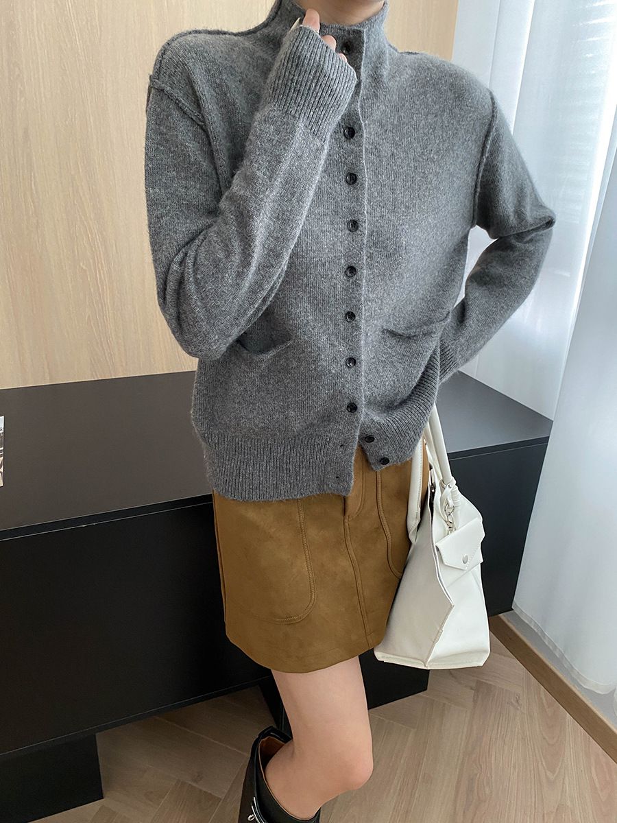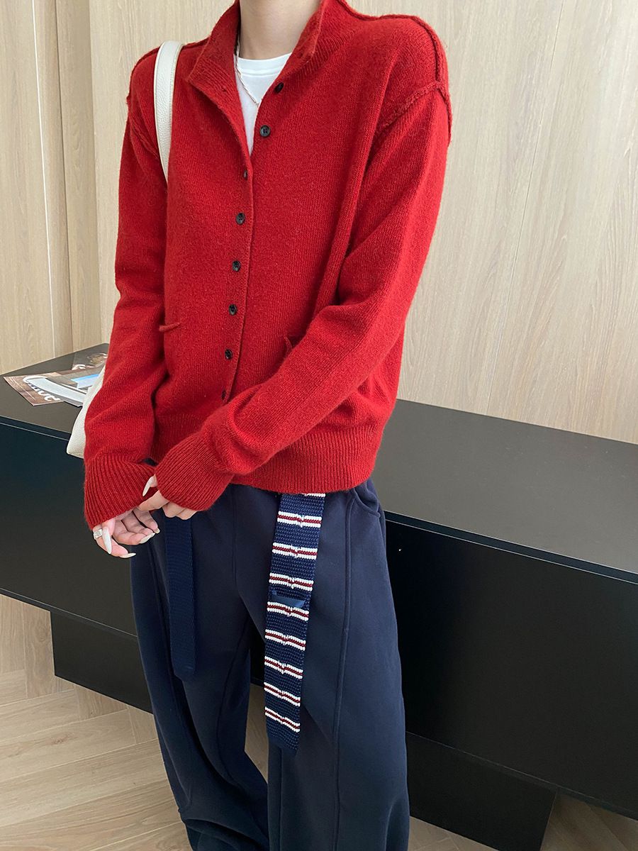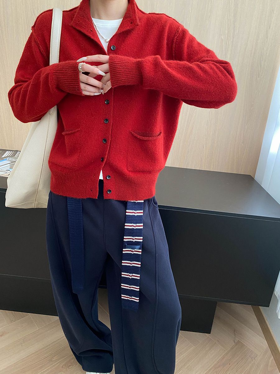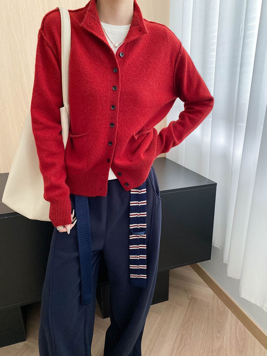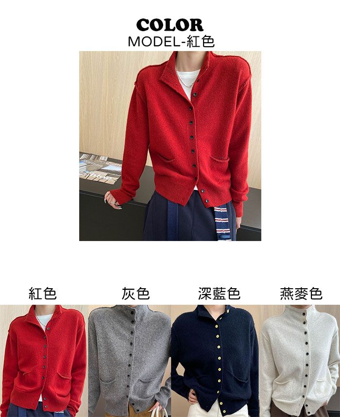 反車線設計/開襟排釦/立領.高領/捲邊設計/雙口袋/好氣色 - 休閒居家簡約百搭素面反車線針織外套針織衫針織上衣長袖上衣長袖外套紅色灰色深藍色燕麥色