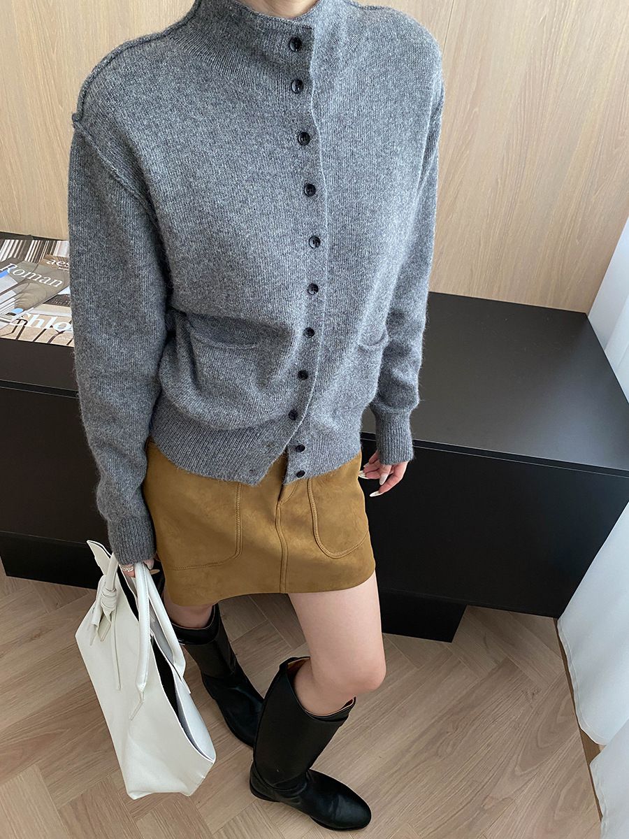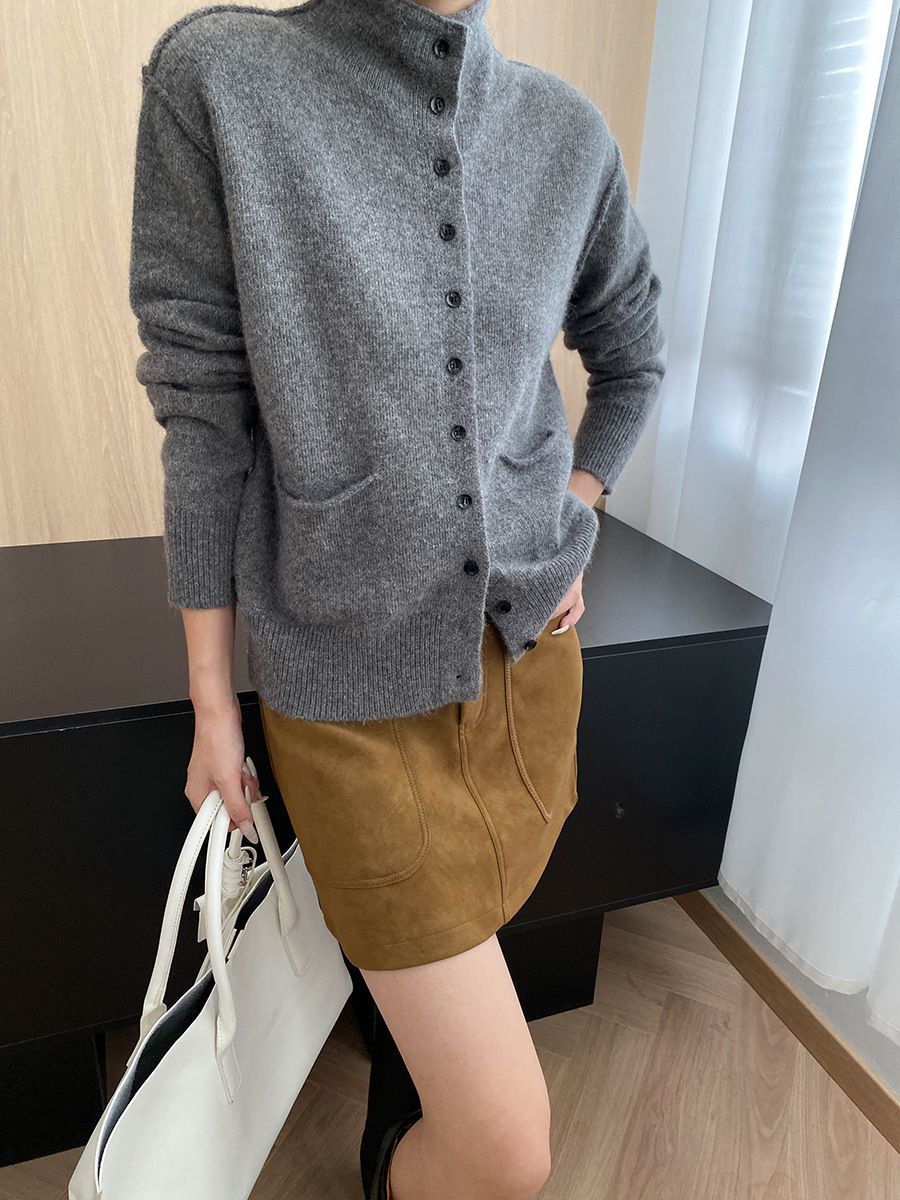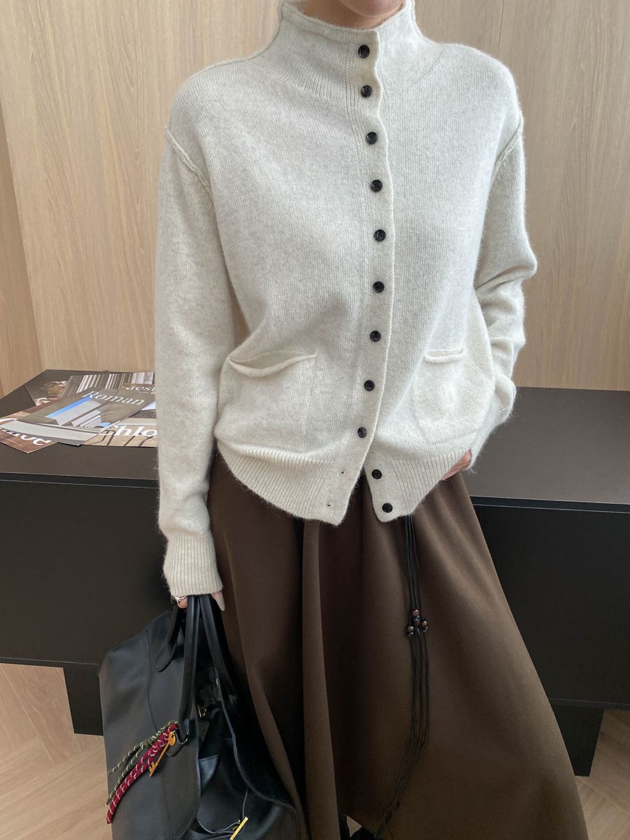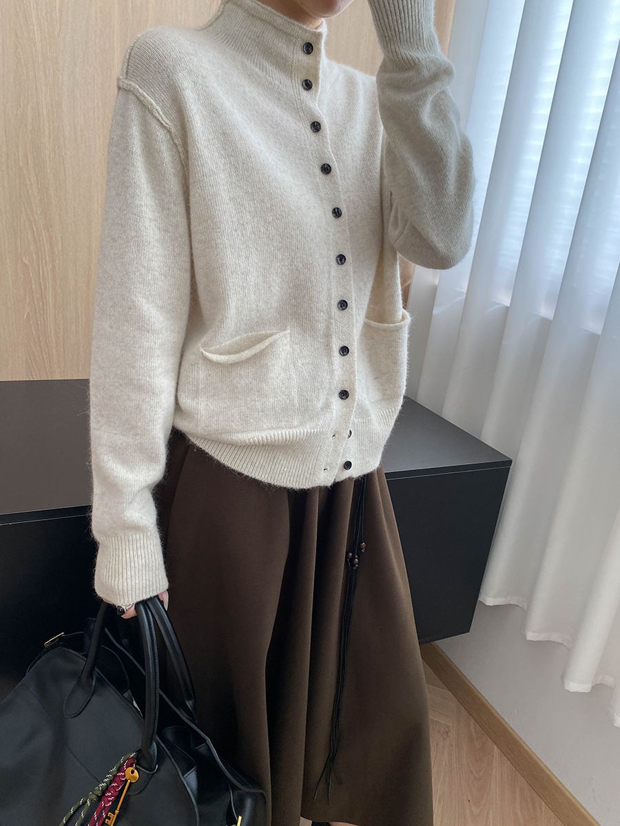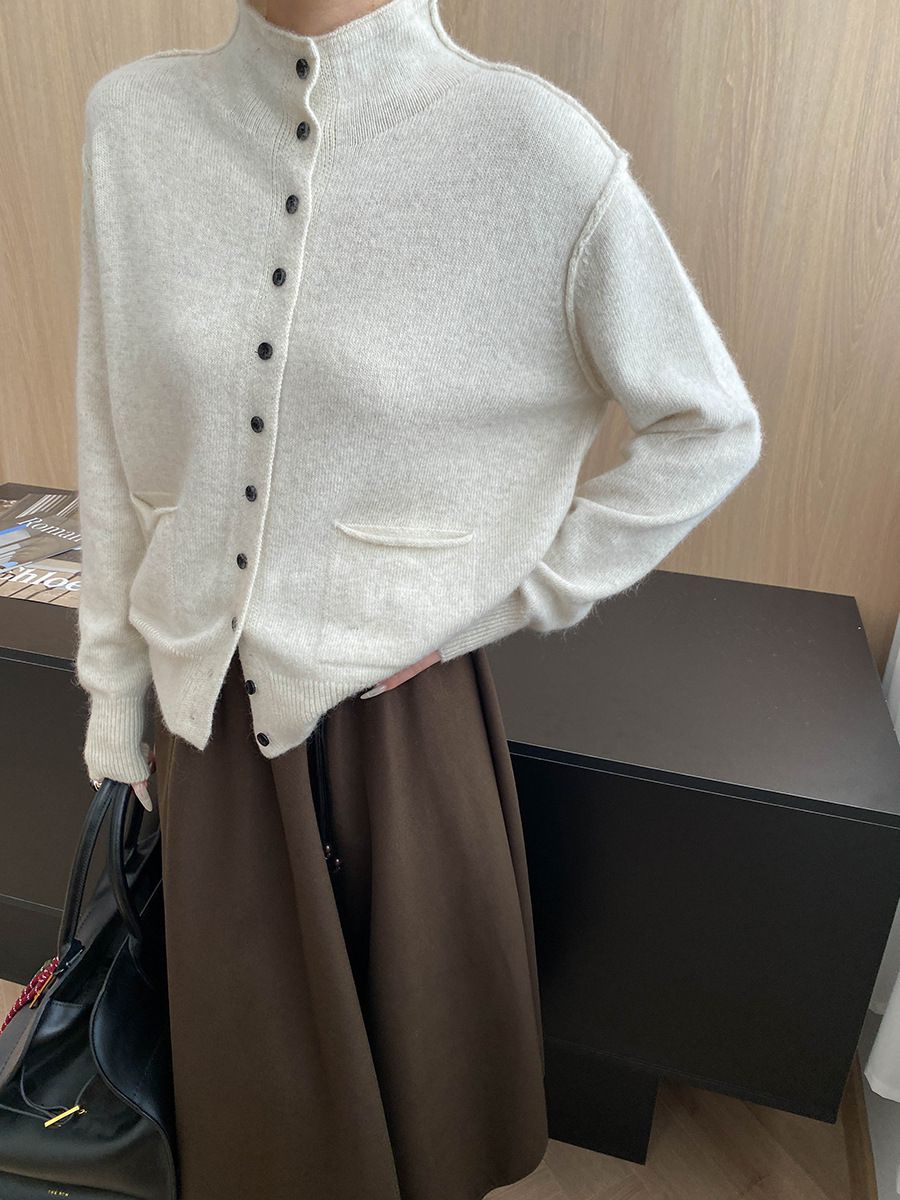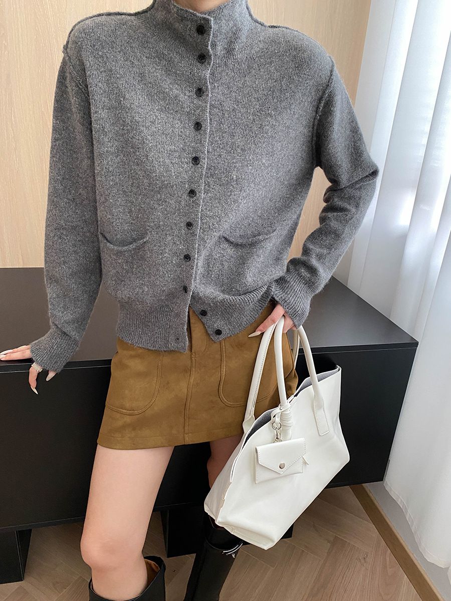 【C60112】品牌 反車線針織外套-素面排釦立領捲邊雙口袋長袖上衣