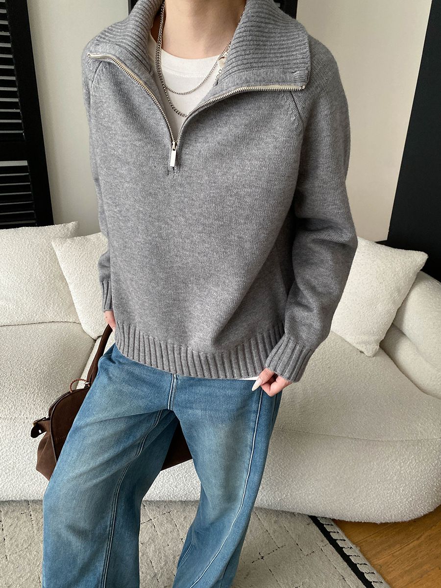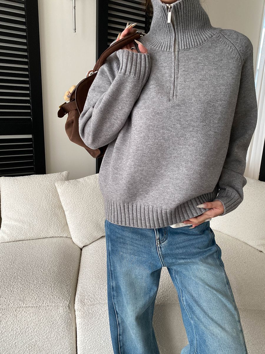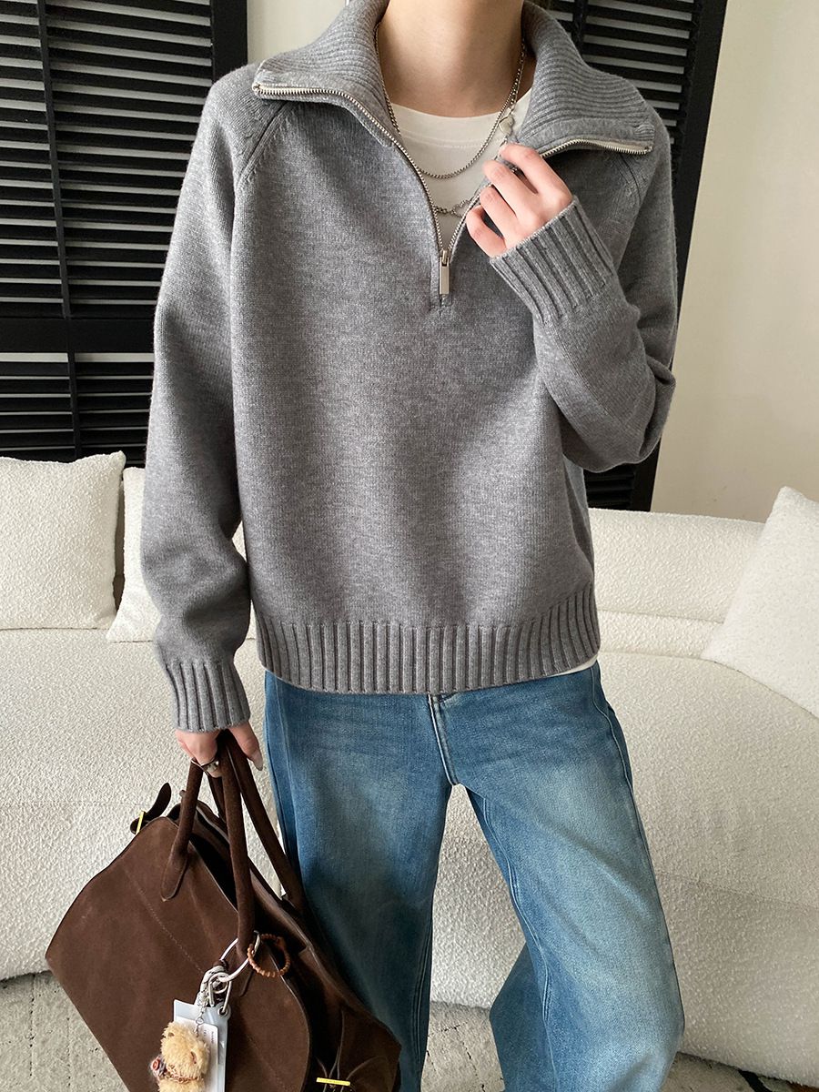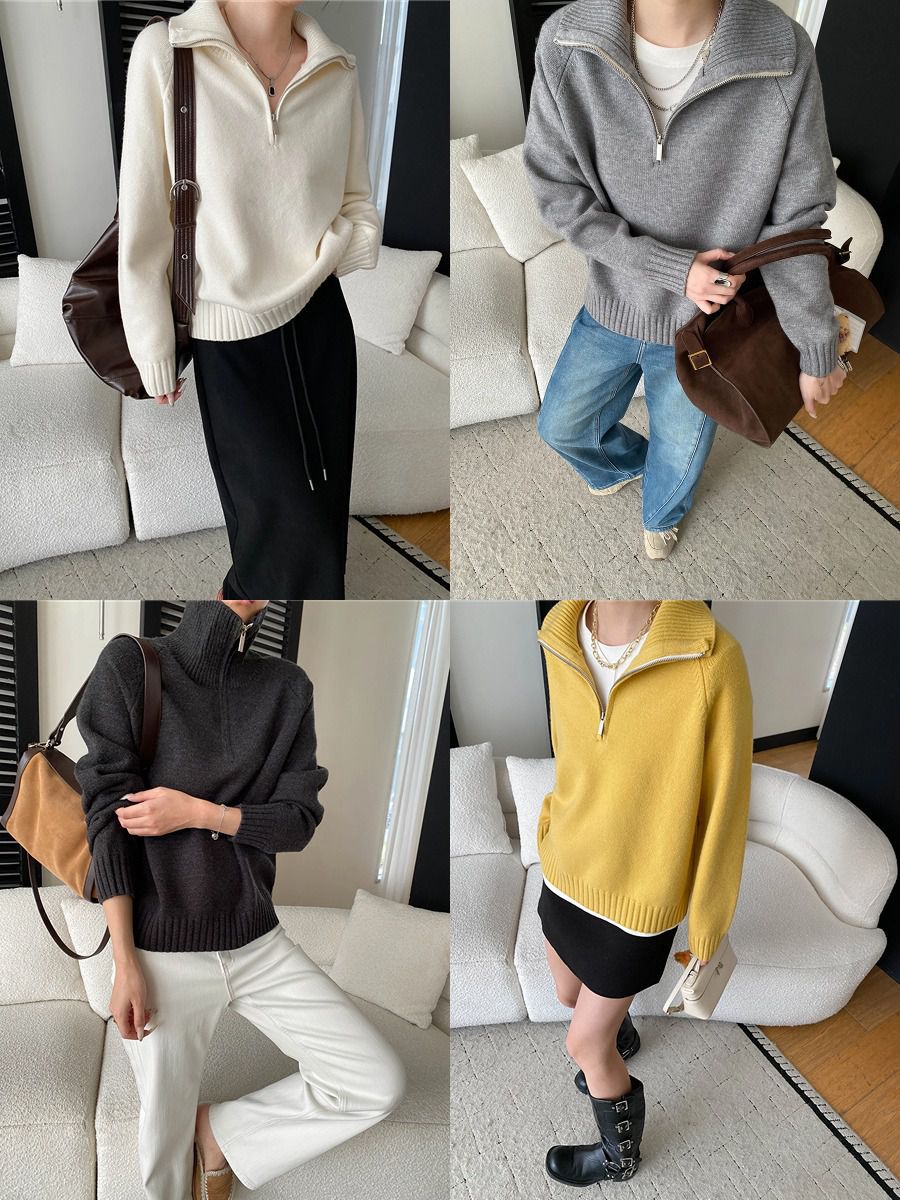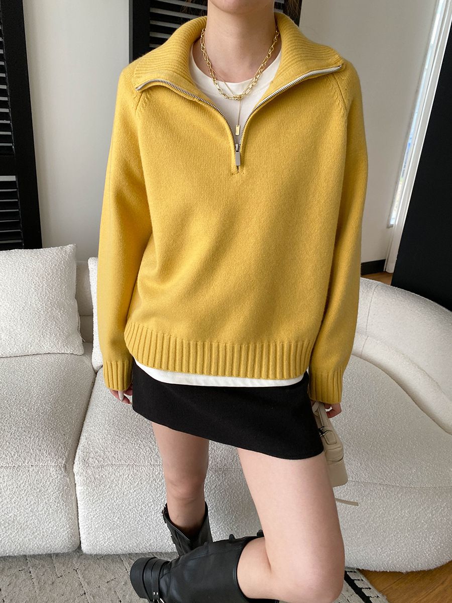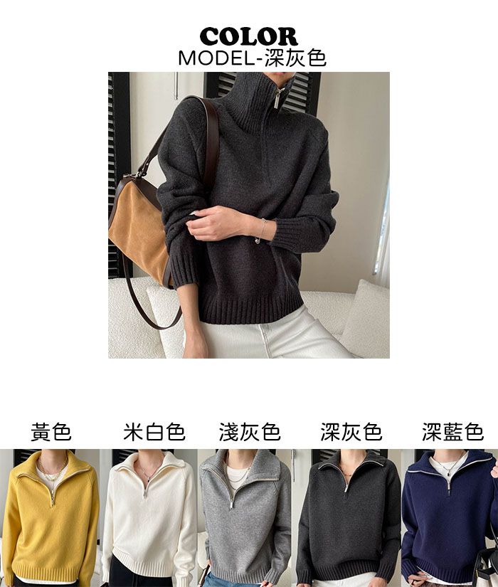 半開襟拉鍊領/立領.高領/連肩袖 - 休閒居家簡約百搭素面拉鍊立領針織衫針織上衣厚磅半開襟高領長袖上衣黃色米白色淺灰色深灰色深藍色