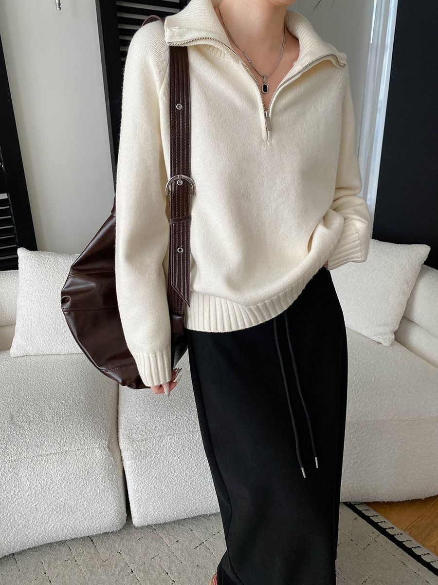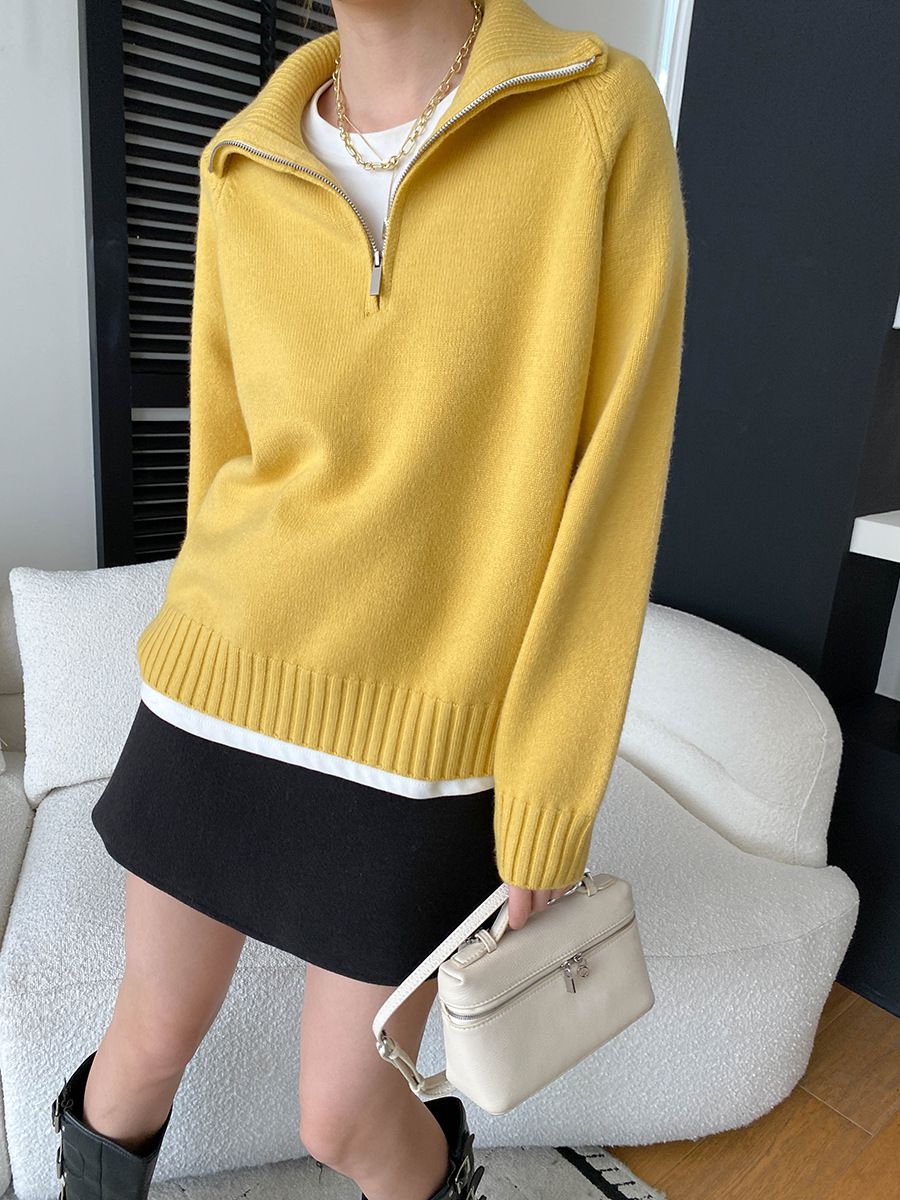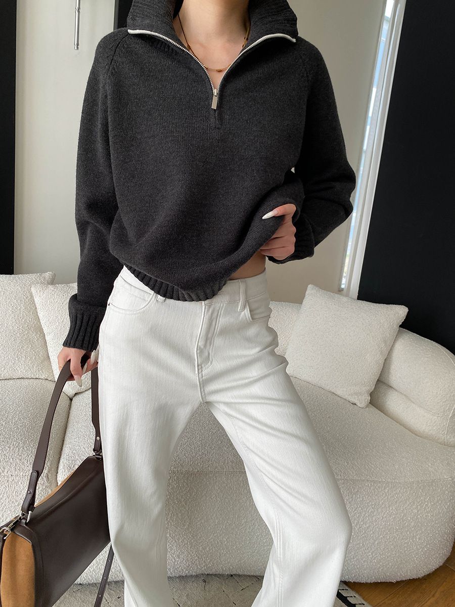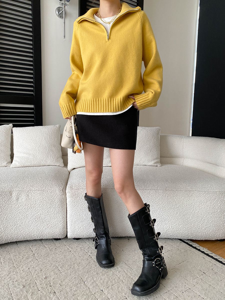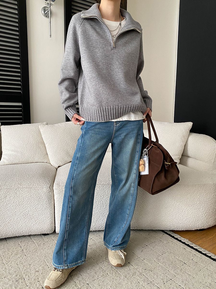 半開襟拉鍊領/立領.高領/連肩袖 - 休閒居家簡約百搭素面拉鍊立領針織衫針織上衣厚磅半開襟高領長袖上衣黃色米白色淺灰色深灰色深藍色