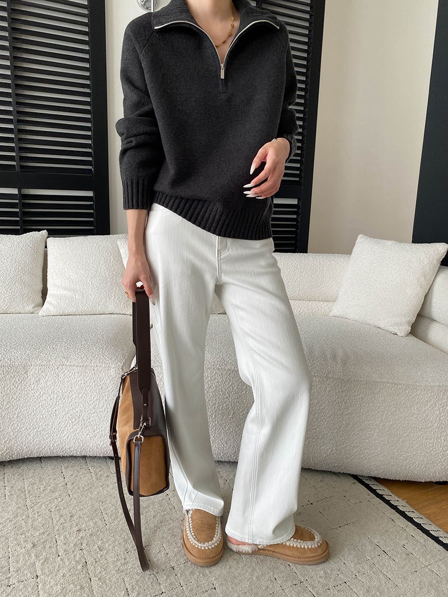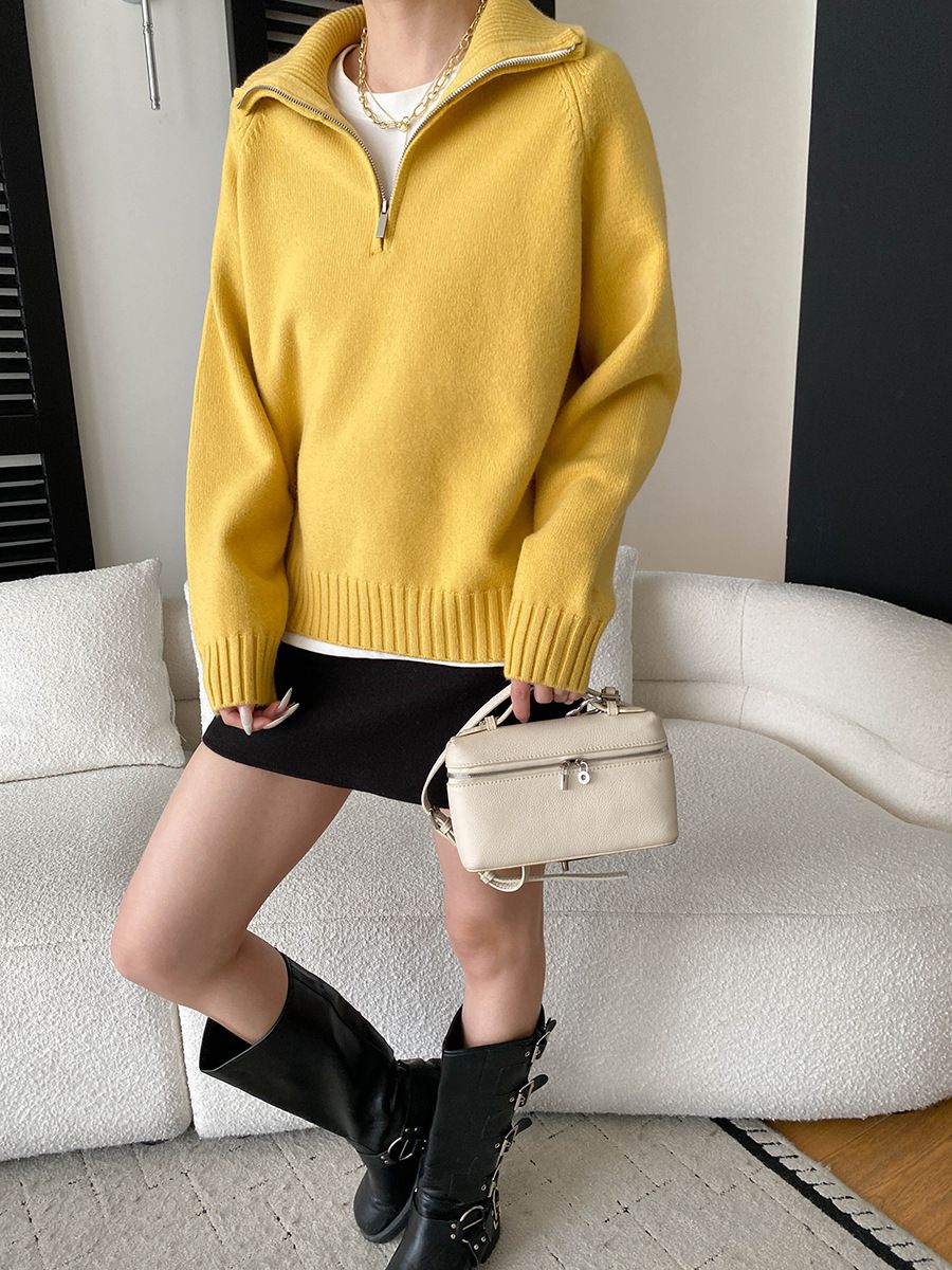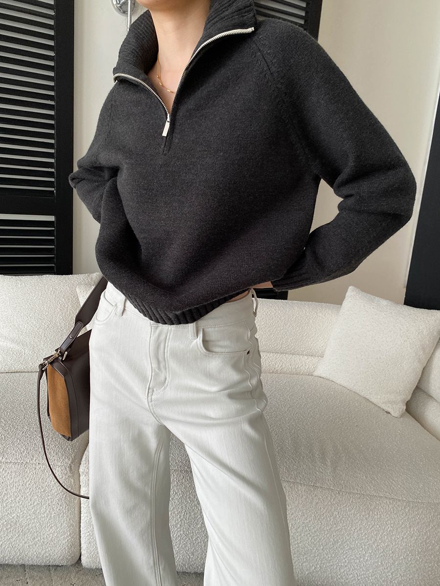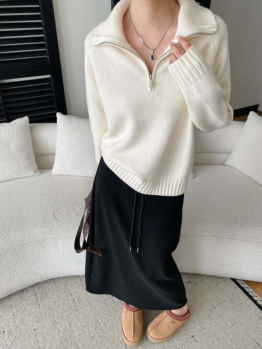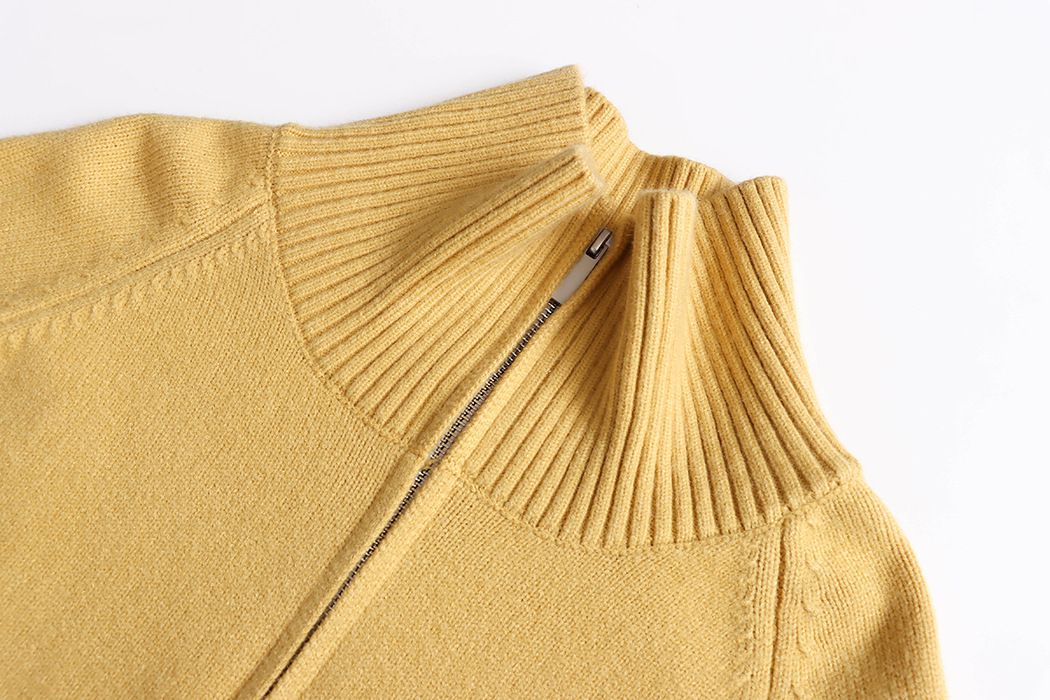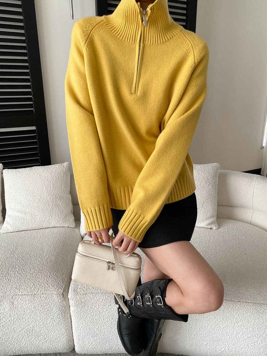 半開襟拉鍊領/立領.高領/連肩袖 - 休閒居家簡約百搭素面拉鍊立領針織衫針織上衣厚磅半開襟高領長袖上衣黃色米白色淺灰色深灰色深藍色