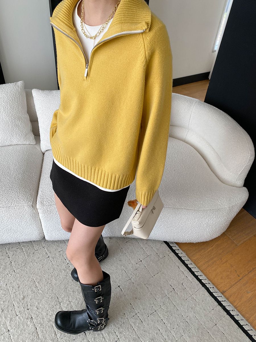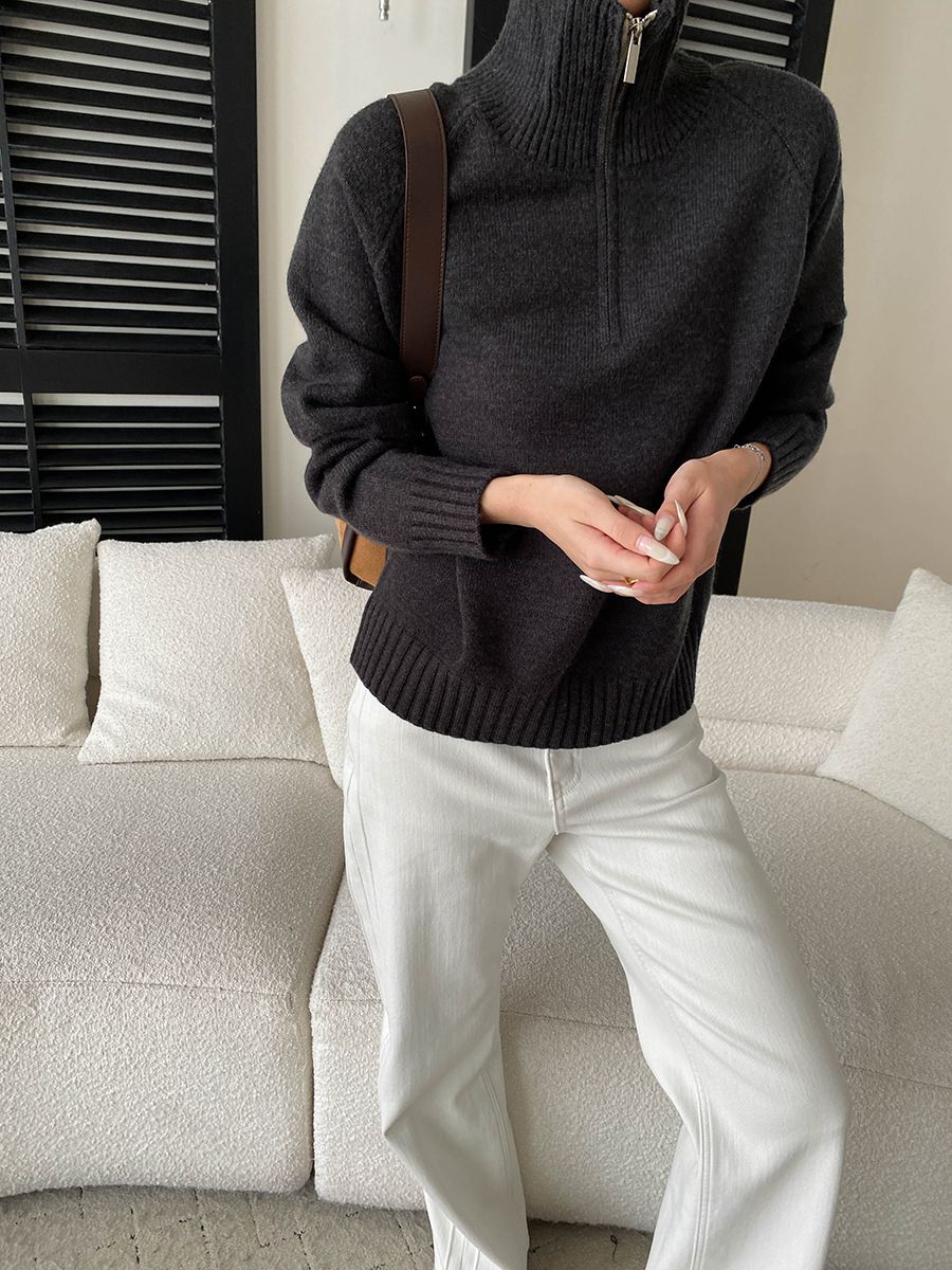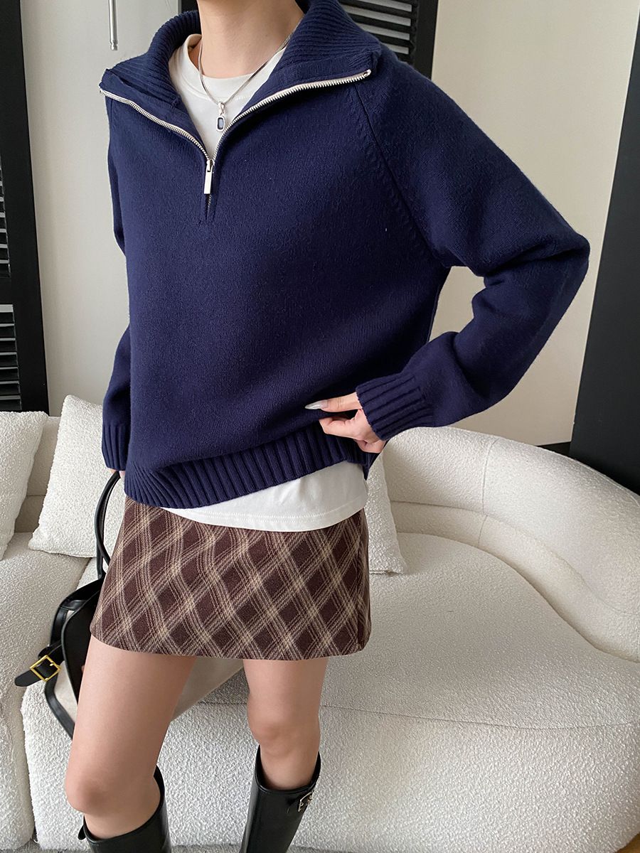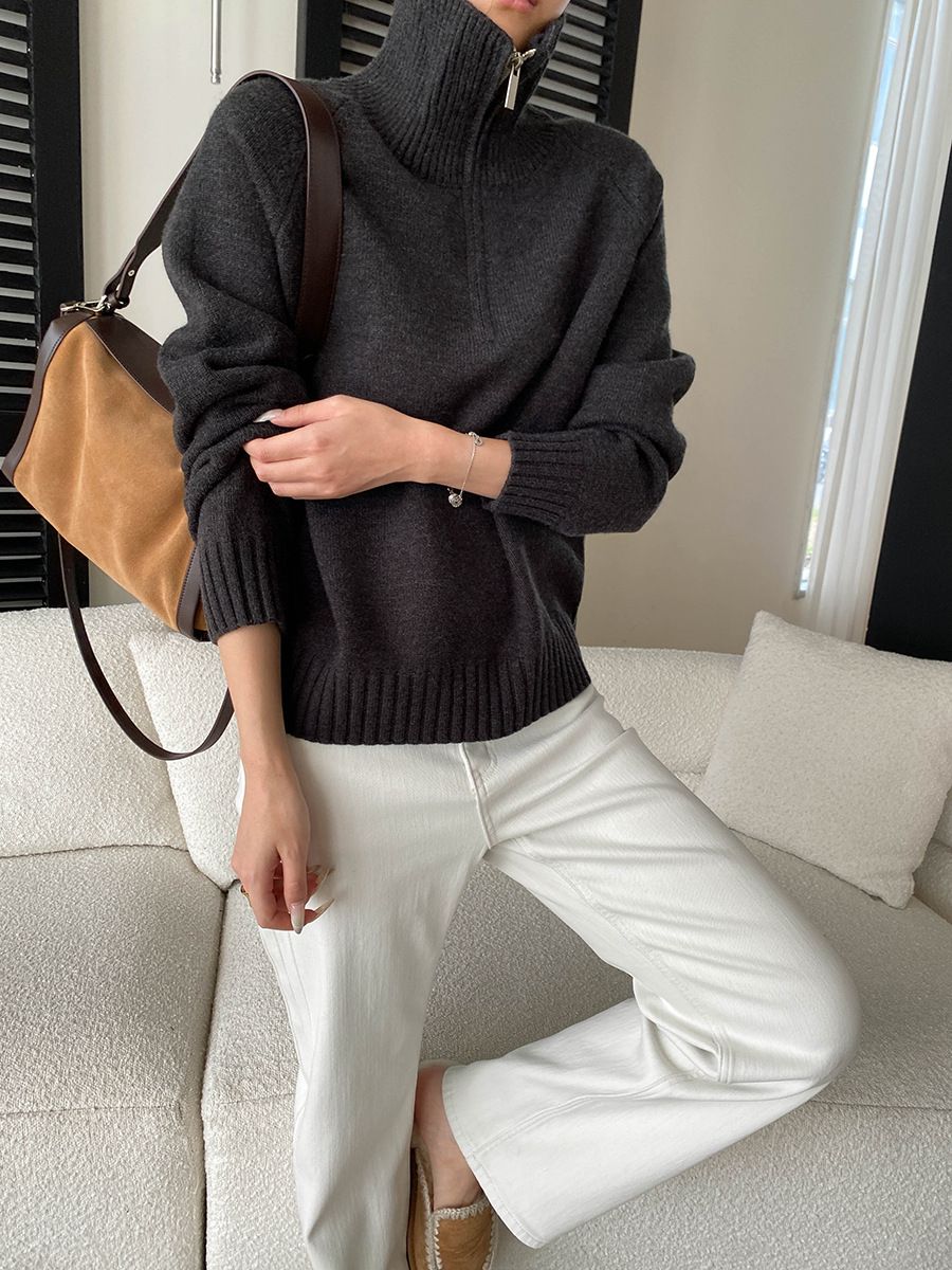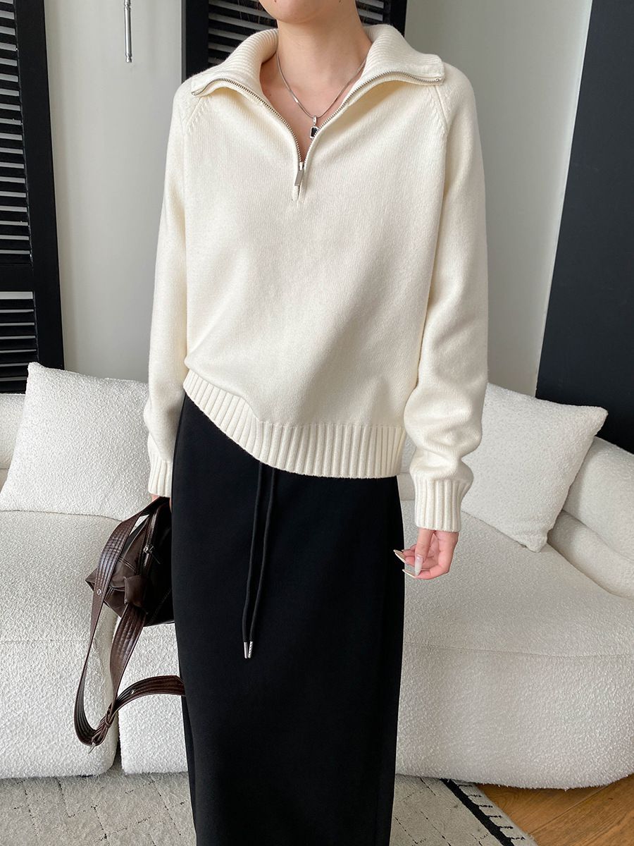半開襟拉鍊領/立領.高領/連肩袖 - 休閒居家簡約百搭素面拉鍊立領針織衫針織上衣厚磅半開襟高領長袖上衣黃色米白色淺灰色深灰色深藍色